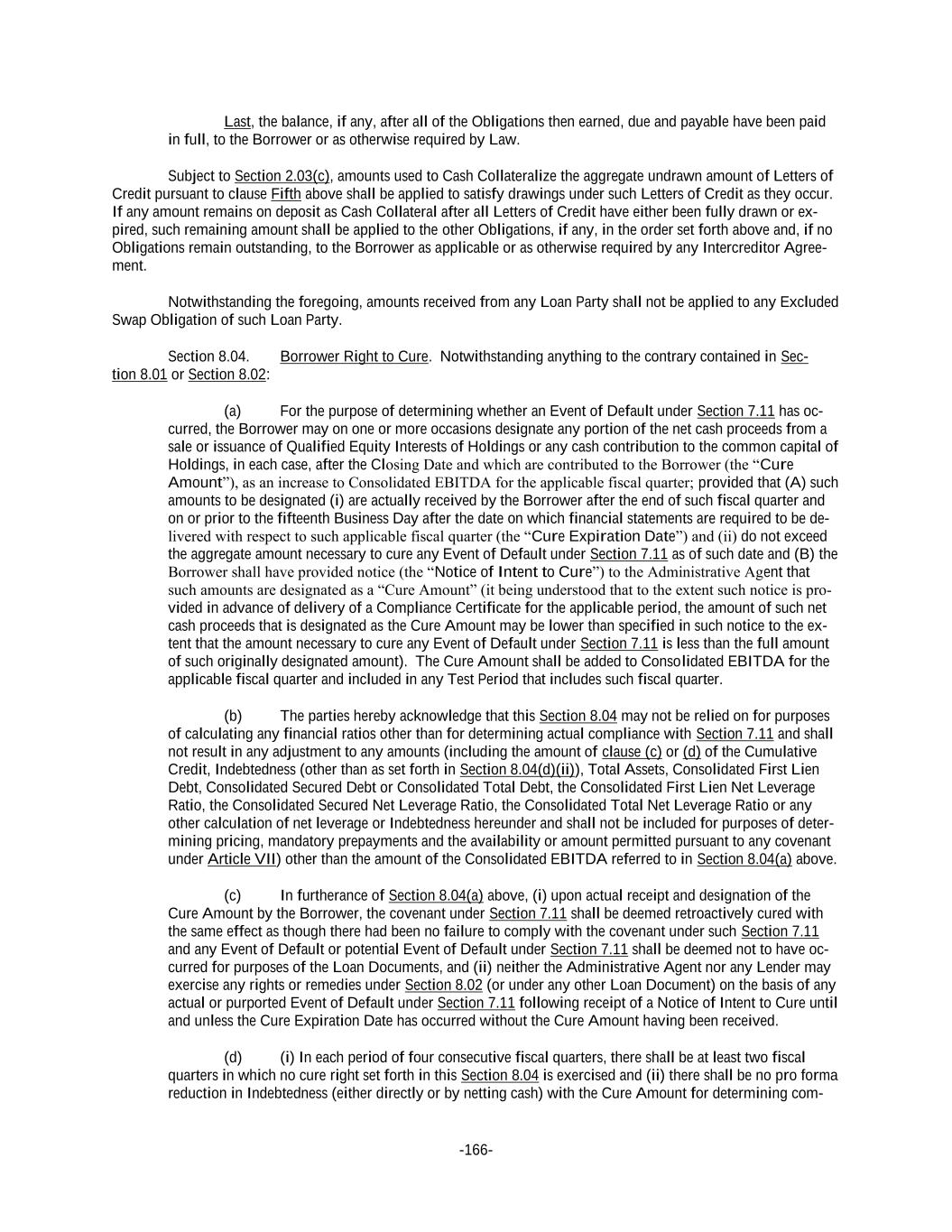 -166- Last, the balance, if any, after all of the Obligations then earned, due and payable have been paid in full, to the Borrower or as otherwise required by Law. Subject to Section 2.03(c), amounts used to Cash Collateralize the aggregate undrawn amount of Letters of Credit pursuant to clause Fifth above shall be applied to satisfy drawings under such Letters of Credit as they occur. If any amount remains on deposit as Cash Collateral after all Letters of Credit have either been fully drawn or ex- pired, such remaining amount shall be applied to the other Obligations, if any, in the order set forth above and, if no Obligations remain outstanding, to the Borrower as applicable or as otherwise required by any Intercreditor Agree- ment. Notwithstanding the foregoing, amounts received from any Loan Party shall not be applied to any Excluded Swap Obligation of such Loan Party. Section 8.04. Borrower Right to Cure. Notwithstanding anything to the contrary contained in Sec- tion 8.01 or Section 8.02: (a) For the purpose of determining whether an Event of Default under Section 7.11 has oc- curred, the Borrower may on one or more occasions designate any portion of the net cash proceeds from a sale or issuance of Qualified Equity Interests of Holdings or any cash contribution to the common capital of Holdings, in each case, after the Closing Date and which are contributed to the Borrower (the “Cure Amount”), as an increase to Consolidated EBITDA for the applicable fiscal quarter; provided that (A) such amounts to be designated (i) are actually received by the Borrower after the end of such fiscal quarter and on or prior to the fifteenth Business Day after the date on which financial statements are required to be de- livered with respect to such applicable fiscal quarter (the “Cure Expiration Date”) and (ii) do not exceed the aggregate amount necessary to cure any Event of Default under Section 7.11 as of such date and (B) the Borrower shall have provided notice (the “Notice of Intent to Cure”) to the Administrative Agent that such amounts are designated as a “Cure Amount” (it being understood that to the extent such notice is pro- vided in advance of delivery of a Compliance Certificate for the applicable period, the amount of such net cash proceeds that is designated as the Cure Amount may be lower than specified in such notice to the ex- tent that the amount necessary to cure any Event of Default under Section 7.11 is less than the full amount of such originally designated amount). The Cure Amount shall be added to Consolidated EBITDA for the applicable fiscal quarter and included in any Test Period that includes such fiscal quarter. (b) The parties hereby acknowledge that this Section 8.04 may not be relied on for purposes of calculating any financial ratios other than for determining actual compliance with Section 7.11 and shall not result in any adjustment to any amounts (including the amount of clause (c) or (d) of the Cumulative Credit, Indebtedness (other than as set forth in Section 8.04(d)(ii)), Total Assets, Consolidated First Lien Debt, Consolidated Secured Debt or Consolidated Total Debt, the Consolidated First Lien Net Leverage Ratio, the Consolidated Secured Net Leverage Ratio, the Consolidated Total Net Leverage Ratio or any other calculation of net leverage or Indebtedness hereunder and shall not be included for purposes of deter- mining pricing, mandatory prepayments and the availability or amount permitted pursuant to any covenant under Article VII) other than the amount of the Consolidated EBITDA referred to in Section 8.04(a) above. (c) In furtherance of Section 8.04(a) above, (i) upon actual receipt and designation of the Cure Amount by the Borrower, the covenant under Section 7.11 shall be deemed retroactively cured with the same effect as though there had been no failure to comply with the covenant under such Section 7.11 and any Event of Default or potential Event of Default under Section 7.11 shall be deemed not to have oc- curred for purposes of the Loan Documents, and (ii) neither the Administrative Agent nor any Lender may exercise any rights or remedies under Section 8.02 (or under any other Loan Document) on the basis of any actual or purported Event of Default under Section 7.11 following receipt of a Notice of Intent to Cure until and unless the Cure Expiration Date has occurred without the Cure Amount having been received. (d) (i) In each period of four consecutive fiscal quarters, there shall be at least two fiscal quarters in which no cure right set forth in this Section 8.04 is exercised and (ii) there shall be no pro forma reduction in Indebtedness (either directly or by netting cash) with the Cure Amount for determining com-