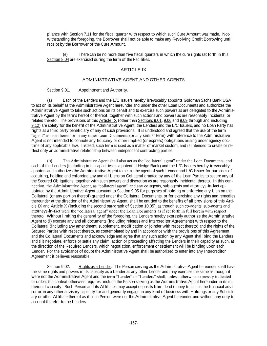 -167- pliance with Section 7.11 for the fiscal quarter with respect to which such Cure Amount was made. Not- withstanding the foregoing, the Borrower shall not be able to make any Revolving Credit Borrowing until receipt by the Borrower of the Cure Amount. (e) There can be no more than five fiscal quarters in which the cure rights set forth in this Section 8.04 are exercised during the term of the Facilities. ARTICLE IX ADMINISTRATIVE AGENT AND OTHER AGENTS Section 9.01. Appointment and Authority. (a) Each of the Lenders and the L/C Issuers hereby irrevocably appoints Goldman Sachs Bank USA to act on its behalf as the Administrative Agent hereunder and under the other Loan Documents and authorizes the Administrative Agent to take such actions on its behalf and to exercise such powers as are delegated to the Adminis- trative Agent by the terms hereof or thereof, together with such actions and powers as are reasonably incidental or related thereto. The provisions of this Article IX (other than Sections 9.01, 9.06 and 9.09 through and including 9.12) are solely for the benefit of the Administrative Agent, the Lenders and the L/C Issuers, and no Loan Party has rights as a third party beneficiary of any of such provisions. It is understood and agreed that the use of the term “agent” as used herein or in any other Loan Documents (or any similar term) with reference to the Administrative Agent is not intended to connote any fiduciary or other implied (or express) obligations arising under agency doc- trine of any applicable law. Instead, such term is used as a matter of market custom, and is intended to create or re- flect only an administrative relationship between independent contracting parties. (b) The Administrative Agent shall also act as the “collateral agent” under the Loan Documents, and each of the Lenders (including in its capacities as a potential Hedge Bank) and the L/C Issuers hereby irrevocably appoints and authorizes the Administrative Agent to act as the agent of such Lender and L/C Issuer for purposes of acquiring, holding and enforcing any and all Liens on Collateral granted by any of the Loan Parties to secure any of the Secured Obligations, together with such powers and discretion as are reasonably incidental thereto. In this con- nection, the Administrative Agent, as “collateral agent” and any co-agents, sub-agents and attorneys-in-fact ap- pointed by the Administrative Agent pursuant to Section 9.05 for purposes of holding or enforcing any Lien on the Collateral (or any portion thereof) granted under the Collateral Documents, or for exercising any rights and remedies thereunder at the direction of the Administrative Agent, shall be entitled to the benefits of all provisions of this Arti- cle IX and Article X (including the second paragraph of Section 10.05), as though such co-agents, sub-agents and attorneys-in-fact were the “collateral agent” under the Loan Documents as if set forth in full herein with respect thereto. Without limiting the generality of the foregoing, the Lenders hereby expressly authorize the Administrative Agent to (i) execute any and all documents (including releases and Intercreditor Agreements) with respect to the Collateral (including any amendment, supplement, modification or joinder with respect thereto) and the rights of the Secured Parties with respect thereto, as contemplated by and in accordance with the provisions of this Agreement and the Collateral Documents and acknowledge and agree that any such action by any Agent shall bind the Lenders and (ii) negotiate, enforce or settle any claim, action or proceeding affecting the Lenders in their capacity as such, at the direction of the Required Lenders, which negotiation, enforcement or settlement will be binding upon each Lender. For the avoidance of doubt the Administrative Agent shall be authorized to enter into any Intercreditor Agreement it believes reasonable. Section 9.02. Rights as a Lender. The Person serving as the Administrative Agent hereunder shall have the same rights and powers in its capacity as a Lender as any other Lender and may exercise the same as though it were not the Administrative Agent and the term “Lender” or “Lenders” shall, unless otherwise expressly indicated or unless the context otherwise requires, include the Person serving as the Administrative Agent hereunder in its in- dividual capacity. Such Person and its Affiliates may accept deposits from, lend money to, act as the financial advi- sor or in any other advisory capacity for and generally engage in any kind of business with Holdings or any Subsidi- ary or other Affiliate thereof as if such Person were not the Administrative Agent hereunder and without any duty to account therefor to the Lenders.