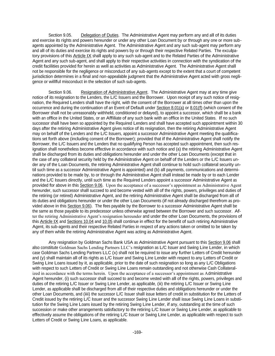 -169- Section 9.05. Delegation of Duties. The Administrative Agent may perform any and all of its duties and exercise its rights and powers hereunder or under any other Loan Document by or through any one or more sub- agents appointed by the Administrative Agent. The Administrative Agent and any such sub-agent may perform any and all of its duties and exercise its rights and powers by or through their respective Related Parties. The exculpa- tory provisions of this Article IX shall apply to any such sub-agent and to the Related Parties of the Administrative Agent and any such sub-agent, and shall apply to their respective activities in connection with the syndication of the credit facilities provided for herein as well as activities as Administrative Agent. The Administrative Agent shall not be responsible for the negligence or misconduct of any sub-agents except to the extent that a court of competent jurisdiction determines in a final and non-appealable judgment that the Administrative Agent acted with gross negli- gence or willful misconduct in the selection of such sub-agents. Section 9.06. Resignation of Administrative Agent. The Administrative Agent may at any time give notice of its resignation to the Lenders, the L/C Issuers and the Borrower. Upon receipt of any such notice of resig- nation, the Required Lenders shall have the right, with the consent of the Borrower at all times other than upon the occurrence and during the continuation of an Event of Default under Section 8.01(a) or 8.01(f) (which consent of the Borrower shall not be unreasonably withheld, conditioned or delayed), to appoint a successor, which shall be a bank with an office in the United States, or an Affiliate of any such bank with an office in the United States. If no such successor shall have been so appointed by the Required Lenders and shall have accepted such appointment within 30 days after the retiring Administrative Agent gives notice of its resignation, then the retiring Administrative Agent may on behalf of the Lenders and the L/C Issuers, appoint a successor Administrative Agent meeting the qualifica- tions set forth above (including consent of the Borrower); provided that if the Administrative Agent shall notify the Borrower, the L/C Issuers and the Lenders that no qualifying Person has accepted such appointment, then such res- ignation shall nonetheless become effective in accordance with such notice and (a) the retiring Administrative Agent shall be discharged from its duties and obligations hereunder and under the other Loan Documents (except that in the case of any collateral security held by the Administrative Agent on behalf of the Lenders or the L/C Issuers un- der any of the Loan Documents, the retiring Administrative Agent shall continue to hold such collateral security un- til such time as a successor Administrative Agent is appointed) and (b) all payments, communications and determi- nations provided to be made by, to or through the Administrative Agent shall instead be made by or to each Lender and the L/C Issuers directly, until such time as the Required Lenders appoint a successor Administrative Agent as provided for above in this Section 9.06. Upon the acceptance of a successor’s appointment as Administrative Agent hereunder, such successor shall succeed to and become vested with all of the rights, powers, privileges and duties of the retiring (or retired) Administrative Agent, and the retiring Administrative Agent shall be discharged from all of its duties and obligations hereunder or under the other Loan Documents (if not already discharged therefrom as pro- vided above in this Section 9.06). The fees payable by the Borrower to a successor Administrative Agent shall be the same as those payable to its predecessor unless otherwise agreed between the Borrower and such successor. Af- ter the retiring Administrative Agent’s resignation hereunder and under the other Loan Documents, the provisions of this Article IX and Sections 10.04 and 10.05 shall continue in effect for the benefit of such retiring Administrative Agent, its sub-agents and their respective Related Parties in respect of any actions taken or omitted to be taken by any of them while the retiring Administrative Agent was acting as Administrative Agent. Any resignation by Goldman Sachs Bank USA as Administrative Agent pursuant to this Section 9.06 shall also constitute Goldman Sachs Lending Partners LLC’s resignation as L/C Issuer and Swing Line Lender, in which case Goldman Sachs Lending Partners LLC (x) shall not be required to issue any further Letters of Credit hereunder and (y) shall maintain all of its rights as L/C Issuer and Swing Line Lender with respect to any Letters of Credit or Swing Line Loans issued by it, as applicable, prior to the date of such resignation so long as any L/C Obligations with respect to such Letters of Credit or Swing Line Loans remain outstanding and not otherwise Cash Collateral- ized in accordance with the terms herein. Upon the acceptance of a successor’s appointment as Administrative Agent hereunder, (i) such successor shall succeed to and become vested with all of the rights, powers, privileges and duties of the retiring L/C Issuer or Swing Line Lender, as applicable, (ii) the retiring L/C Issuer or Swing Line Lender, as applicable shall be discharged from all of their respective duties and obligations hereunder or under the other Loan Documents, and (iii) the successor L/C Issuer shall issue letters of credit in substitution for the Letters of Credit issued by the retiring L/C Issuer and the successor Swing Line Lender shall issue Swing Line Loans in substi- tution for the Swing Line Loans issued by the retiring Swing Line Lender, if any, outstanding at the time of such succession or make other arrangements satisfactory to the retiring L/C Issuer or Swing Line Lender, as applicable to effectively assume the obligations of the retiring L/C Issuer or Swing Line Lender, as applica