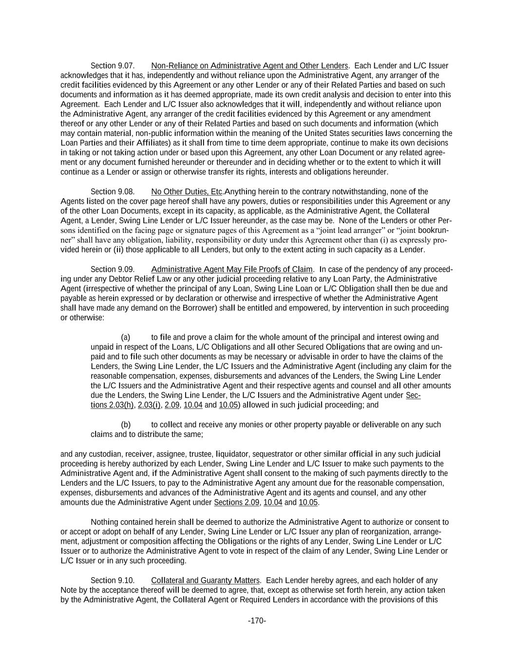 -170- Section 9.07. Non-Reliance on Administrative Agent and Other Lenders. Each Lender and L/C Issuer acknowledges that it has, independently and without reliance upon the Administrative Agent, any arranger of the credit facilities evidenced by this Agreement or any other Lender or any of their Related Parties and based on such documents and information as it has deemed appropriate, made its own credit analysis and decision to enter into this Agreement. Each Lender and L/C Issuer also acknowledges that it will, independently and without reliance upon the Administrative Agent, any arranger of the credit facilities evidenced by this Agreement or any amendment thereof or any other Lender or any of their Related Parties and based on such documents and information (which may contain material, non-public information within the meaning of the United States securities laws concerning the Loan Parties and their Affiliates) as it shall from time to time deem appropriate, continue to make its own decisions in taking or not taking action under or based upon this Agreement, any other Loan Document or any related agree- ment or any document furnished hereunder or thereunder and in deciding whether or to the extent to which it will continue as a Lender or assign or otherwise transfer its rights, interests and obligations hereunder. Section 9.08. No Other Duties, Etc.Anything herein to the contrary notwithstanding, none of the Agents listed on the cover page hereof shall have any powers, duties or responsibilities under this Agreement or any of the other Loan Documents, except in its capacity, as applicable, as the Administrative Agent, the Collateral Agent, a Lender, Swing Line Lender or L/C Issuer hereunder, as the case may be. None of the Lenders or other Per- sons identified on the facing page or signature pages of this Agreement as a “joint lead arranger” or “joint bookrun- ner” shall have any obligation, liability, responsibility or duty under this Agreement other than (i) as expressly pro- vided herein or (ii) those applicable to all Lenders, but only to the extent acting in such capacity as a Lender. Section 9.09. Administrative Agent May File Proofs of Claim. In case of the pendency of any proceed- ing under any Debtor Relief Law or any other judicial proceeding relative to any Loan Party, the Administrative Agent (irrespective of whether the principal of any Loan, Swing Line Loan or L/C Obligation shall then be due and payable as herein expressed or by declaration or otherwise and irrespective of whether the Administrative Agent shall have made any demand on the Borrower) shall be entitled and empowered, by intervention in such proceeding or otherwise: (a) to file and prove a claim for the whole amount of the principal and interest owing and unpaid in respect of the Loans, L/C Obligations and all other Secured Obligations that are owing and un- paid and to file such other documents as may be necessary or advisable in order to have the claims of the Lenders, the Swing Line Lender, the L/C Issuers and the Administrative Agent (including any claim for the reasonable compensation, expenses, disbursements and advances of the Lenders, the Swing Line Lender the L/C Issuers and the Administrative Agent and their respective agents and counsel and all other amounts due the Lenders, the Swing Line Lender, the L/C Issuers and the Administrative Agent under Sec- tions 2.03(h), 2.03(i), 2.09, 10.04 and 10.05) allowed in such judicial proceeding; and (b) to collect and receive any monies or other property payable or deliverable on any such claims and to distribute the same; and any custodian, receiver, assignee, trustee, liquidator, sequestrator or other similar official in any such judicial proceeding is hereby authorized by each Lender, Swing Line Lender and L/C Issuer to make such payments to the Administrative Agent and, if the Administrative Agent shall consent to the making of such payments directly to the Lenders and the L/C Issuers, to pay to the Administrative Agent any amount due for the reasonable compensation, expenses, disbursements and advances of the Administrative Agent and its agents and counsel, and any other amounts due the Administrative Agent under Sections 2.09, 10.04 and 10.05. Nothing contained herein shall be deemed to authorize the Administrative Agent to authorize or consent to or accept or adopt on behalf of any Lender, Swing Line Lender or L/C Issuer any plan of reorganization, arrange- ment, adjustment or composition affecting the Obligations or the rights of any Lender, Swing Line Lender or L/C Issuer or to authorize the Administrative Agent to vote in respect of the claim of any Lender, Swing Line Lender or L/C Issuer or in any such proceeding. Section 9.10. Collateral and Guaranty Matters. Each Lender hereby agrees, and each holder of any Note by the acceptance thereof will be deemed to agree, that, except as otherwise set forth herein, any action taken by the Administrative Agent, the Collateral Agent or Required Lenders in accordance with the provisions of this