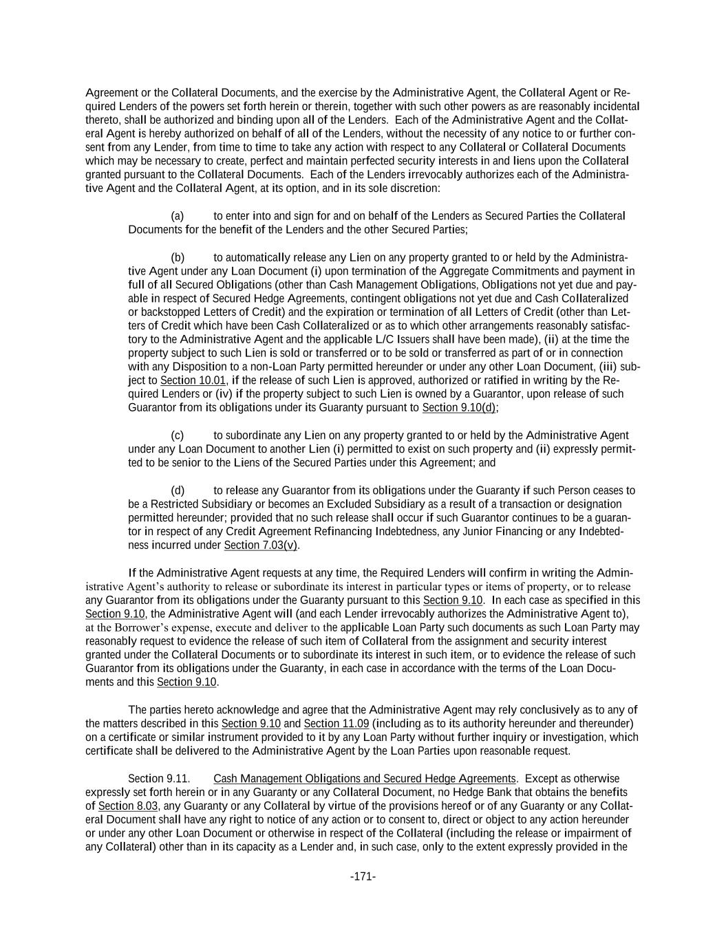 -171- Agreement or the Collateral Documents, and the exercise by the Administrative Agent, the Collateral Agent or Re- quired Lenders of the powers set forth herein or therein, together with such other powers as are reasonably incidental thereto, shall be authorized and binding upon all of the Lenders. Each of the Administrative Agent and the Collat- eral Agent is hereby authorized on behalf of all of the Lenders, without the necessity of any notice to or further con- sent from any Lender, from time to time to take any action with respect to any Collateral or Collateral Documents which may be necessary to create, perfect and maintain perfected security interests in and liens upon the Collateral granted pursuant to the Collateral Documents. Each of the Lenders irrevocably authorizes each of the Administra- tive Agent and the Collateral Agent, at its option, and in its sole discretion: (a) to enter into and sign for and on behalf of the Lenders as Secured Parties the Collateral Documents for the benefit of the Lenders and the other Secured Parties; (b) to automatically release any Lien on any property granted to or held by the Administra- tive Agent under any Loan Document (i) upon termination of the Aggregate Commitments and payment in full of all Secured Obligations (other than Cash Management Obligations, Obligations not yet due and pay- able in respect of Secured Hedge Agreements, contingent obligations not yet due and Cash Collateralized or backstopped Letters of Credit) and the expiration or termination of all Letters of Credit (other than Let- ters of Credit which have been Cash Collateralized or as to which other arrangements reasonably satisfac- tory to the Administrative Agent and the applicable L/C Issuers shall have been made), (ii) at the time the property subject to such Lien is sold or transferred or to be sold or transferred as part of or in connection with any Disposition to a non-Loan Party permitted hereunder or under any other Loan Document, (iii) sub- ject to Section 10.01, if the release of such Lien is approved, authorized or ratified in writing by the Re- quired Lenders or (iv) if the property subject to such Lien is owned by a Guarantor, upon release of such Guarantor from its obligations under its Guaranty pursuant to Section 9.10(d); (c) to subordinate any Lien on any property granted to or held by the Administrative Agent under any Loan Document to another Lien (i) permitted to exist on such property and (ii) expressly permit- ted to be senior to the Liens of the Secured Parties under this Agreement; and (d) to release any Guarantor from its obligations under the Guaranty if such Person ceases to be a Restricted Subsidiary or becomes an Excluded Subsidiary as a result of a transaction or designation permitted hereunder; provided that no such release shall occur if such Guarantor continues to be a guaran- tor in respect of any Credit Agreement Refinancing Indebtedness, any Junior Financing or any Indebted- ness incurred under Section 7.03(v). If the Administrative Agent requests at any time, the Required Lenders will confirm in writing the Admin- istrative Agent’s authority to release or subordinate its interest in particular types or items of property, or to release any Guarantor from its obligations under the Guaranty pursuant to this Section 9.10. In each case as specified in this Section 9.10, the Administrative Agent will (and each Lender irrevocably authorizes the Administrative Agent to), at the Borrower’s expense, execute and deliver to the applicable Loan Party such documents as such Loan Party may reasonably request to evidence the release of such item of Collateral from the assignment and security interest granted under the Collateral Documents or to subordinate its interest in such item, or to evidence the release of such Guarantor from its obligations under the Guaranty, in each case in accordance with the terms of the Loan Docu- ments and this Section 9.10. The parties hereto acknowledge and agree that the Administrative Agent may rely conclusively as to any of the matters described in this Section 9.10 and Section 11.09 (including as to its authority hereunder and thereunder) on a certificate or similar instrument provided to it by any Loan Party without further inquiry or investigation, which certificate shall be delivered to the Administrative Agent by the Loan Parties upon reasonable request. Section 9.11. Cash Management Obligations and Secured Hedge Agreements. Except as otherwise expressly set forth herein or in any Guaranty or any Collateral Document, no Hedge Bank that obtains the benefits of Section 8.03, any Guaranty or any Collateral by virtue of the provisions hereof or of any Guaranty or any Collat- eral Document shall have any right to notice of any action or to consent to, direct or object to any action hereunder or under any other Loan Document or otherwise in respect of the Collateral (including the release or impairment of any Collateral) other than in its capacity as a Lender and, in such case, only to the extent expressly provided in the