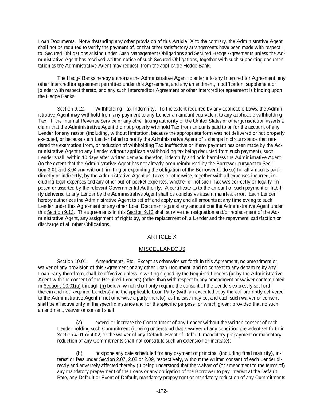 -172- Loan Documents. Notwithstanding any other provision of this Article IX to the contrary, the Administrative Agent shall not be required to verify the payment of, or that other satisfactory arrangements have been made with respect to, Secured Obligations arising under Cash Management Obligations and Secured Hedge Agreements unless the Ad- ministrative Agent has received written notice of such Secured Obligations, together with such supporting documen- tation as the Administrative Agent may request, from the applicable Hedge Bank. The Hedge Banks hereby authorize the Administrative Agent to enter into any Intercreditor Agreement, any other intercreditor agreement permitted under this Agreement, and any amendment, modification, supplement or joinder with respect thereto, and any such Intercreditor Agreement or other intercreditor agreement is binding upon the Hedge Banks. Section 9.12. Withholding Tax Indemnity. To the extent required by any applicable Laws, the Admin- istrative Agent may withhold from any payment to any Lender an amount equivalent to any applicable withholding Tax. If the Internal Revenue Service or any other taxing authority of the United States or other jurisdiction asserts a claim that the Administrative Agent did not properly withhold Tax from amounts paid to or for the account of any Lender for any reason (including, without limitation, because the appropriate form was not delivered or not properly executed, or because such Lender failed to notify the Administrative Agent of a change in circumstance that ren- dered the exemption from, or reduction of withholding Tax ineffective or if any payment has been made by the Ad- ministrative Agent to any Lender without applicable withholding tax being deducted from such payment), such Lender shall, within 10 days after written demand therefor, indemnify and hold harmless the Administrative Agent (to the extent that the Administrative Agent has not already been reimbursed by the Borrower pursuant to Sec- tion 3.01 and 3.04 and without limiting or expanding the obligation of the Borrower to do so) for all amounts paid, directly or indirectly, by the Administrative Agent as Taxes or otherwise, together with all expenses incurred, in- cluding legal expenses and any other out-of-pocket expenses, whether or not such Tax was correctly or legally im- posed or asserted by the relevant Governmental Authority. A certificate as to the amount of such payment or liabil- ity delivered to any Lender by the Administrative Agent shall be conclusive absent manifest error. Each Lender hereby authorizes the Administrative Agent to set off and apply any and all amounts at any time owing to such Lender under this Agreement or any other Loan Document against any amount due the Administrative Agent under this Section 9.12. The agreements in this Section 9.12 shall survive the resignation and/or replacement of the Ad- ministrative Agent, any assignment of rights by, or the replacement of, a Lender and the repayment, satisfaction or discharge of all other Obligations. ARTICLE X MISCELLANEOUS Section 10.01. Amendments, Etc. Except as otherwise set forth in this Agreement, no amendment or waiver of any provision of this Agreement or any other Loan Document, and no consent to any departure by any Loan Party therefrom, shall be effective unless in writing signed by the Required Lenders (or by the Administrative Agent with the consent of the Required Lenders) (other than with respect to any amendment or waiver contemplated in Sections 10.01(a) through (h) below, which shall only require the consent of the Lenders expressly set forth therein and not Required Lenders) and the applicable Loan Party (with an executed copy thereof promptly delivered to the Administrative Agent if not otherwise a party thereto), as the case may be, and each such waiver or consent shall be effective only in the specific instance and for the specific purpose for which given; provided that no such amendment, waiver or consent shall: (a) extend or increase the Commitment of any Lender without the written consent of each Lender holding such Commitment (it being understood that a waiver of any condition precedent set forth in Section 4.01 or 4.02, or the waiver of any Default, Event of Default, mandatory prepayment or mandatory reduction of any Commitments shall not constitute such an extension or increase); (b) postpone any date scheduled for any payment of principal (including final maturity), in- terest or fees under Section 2.07, 2.08 or 2.09, respectively, without the written consent of each Lender di- rectly and adversely affected thereby (it being understood that the waiver of (or amendment to the terms of) any mandatory prepayment of the Loans or any obligation of the Borrower to pay interest at the Default Rate, any Default or Event of Default, mandatory prepayment or mandatory reduction of any Commitments