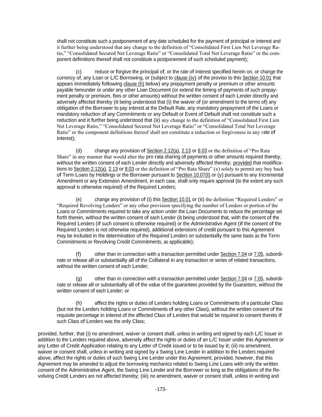 -173- shall not constitute such a postponement of any date scheduled for the payment of principal or interest and it further being understood that any change to the definition of “Consolidated First Lien Net Leverage Ra- tio,” “Consolidated Secured Net Leverage Ratio” or “Consolidated Total Net Leverage Ratio” or the com- ponent definitions thereof shall not constitute a postponement of such scheduled payment); (c) reduce or forgive the principal of, or the rate of interest specified herein on, or change the currency of, any Loan or L/C Borrowing, or (subject to clause (iv) of the proviso to this Section 10.01 that appears immediately following clause (h) below) any prepayment penalty or premium or other amounts payable hereunder or under any other Loan Document (or extend the timing of payments of such prepay- ment penalty or premium, fees or other amounts) without the written consent of each Lender directly and adversely affected thereby (it being understood that (i) the waiver of (or amendment to the terms of) any obligation of the Borrower to pay interest at the Default Rate, any mandatory prepayment of the Loans or mandatory reduction of any Commitments or any Default or Event of Default shall not constitute such a reduction and it further being understood that (ii) any change to the definition of “Consolidated First Lien Net Leverage Ratio,” “Consolidated Secured Net Leverage Ratio” or “Consolidated Total Net Leverage Ratio” or the component definitions thereof shall not constitute a reduction or forgiveness in any rate of interest); (d) change any provision of Section 2.12(a), 2.13 or 8.03 or the definition of “Pro Rata Share” in any manner that would alter the pro rata sharing of payments or other amounts required thereby, without the written consent of each Lender directly and adversely affected thereby; provided that modifica- tions to Section 2.12(a), 2.13 or 8.03 or the definition of “Pro Rata Share” (x) solely to permit any buy back of Term Loans by Holdings or the Borrower pursuant to Section 10.07(l) or (y) pursuant to any Incremental Amendment or any Extension Amendment, in each case, shall only require approval (to the extent any such approval is otherwise required) of the Required Lenders; (e) change any provision of (i) this Section 10.01 or (ii) the definition “Required Lenders” or “Required Revolving Lenders” or any other provision specifying the number of Lenders or portion of the Loans or Commitments required to take any action under the Loan Documents to reduce the percentage set forth therein, without the written consent of each Lender (it being understood that, with the consent of the Required Lenders (if such consent is otherwise required) or the Administrative Agent (if the consent of the Required Lenders is not otherwise required), additional extensions of credit pursuant to this Agreement may be included in the determination of the Required Lenders on substantially the same basis as the Term Commitments or Revolving Credit Commitments, as applicable); (f) other than in connection with a transaction permitted under Section 7.04 or 7.05, subordi- nate or release all or substantially all of the Collateral in any transaction or series of related transactions, without the written consent of each Lender; (g) other than in connection with a transaction permitted under Section 7.04 or 7.05, subordi- nate or release all or substantially all of the value of the guarantees provided by the Guarantors, without the written consent of each Lender; or (h) affect the rights or duties of Lenders holding Loans or Commitments of a particular Class (but not the Lenders holding Loans or Commitments of any other Class), without the written consent of the requisite percentage in interest of the affected Class of Lenders that would be required to consent thereto if such Class of Lenders was the only Class; provided, further, that (i) no amendment, waiver or consent shall, unless in writing and signed by each L/C Issuer in addition to the Lenders required above, adversely affect the rights or duties of an L/C Issuer under this Agreement or any Letter of Credit Application relating to any Letter of Credit issued or to be issued by it; (ii) no amendment, waiver or consent shall, unless in writing and signed by a Swing Line Lender in addition to the Lenders required above, affect the rights or duties of such Swing Line Lender under this Agreement; provided, however, that this Agreement may be amended to adjust the borrowing mechanics related to Swing Line Loans with only the written consent of the Administrative Agent, the Swing Line Lender and the Borrower so long as the obligations of the Re- volving Credit Lenders are not affected thereby; (iii) no amendment, waiver or consent shall, unless in writing and