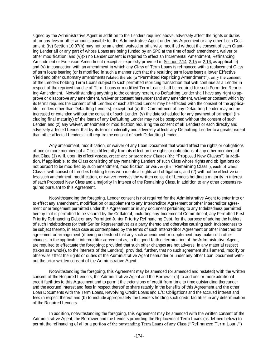 -174- signed by the Administrative Agent in addition to the Lenders required above, adversely affect the rights or duties of, or any fees or other amounts payable to, the Administrative Agent under this Agreement or any other Loan Doc- ument; (iv) Section 10.07(h) may not be amended, waived or otherwise modified without the consent of each Grant- ing Lender all or any part of whose Loans are being funded by an SPC at the time of such amendment, waiver or other modification; and (v)(x) no Lender consent is required to effect an Incremental Amendment, Refinancing Amendment or Extension Amendment (except as expressly provided in Section 2.14, 2.15 or 2.16, as applicable) and (y) in connection with an amendment in which any Class of Term Loans is refinanced with a replacement Class of term loans bearing (or is modified in such a manner such that the resulting term loans bear) a lower Effective Yield and other customary amendments related thereto (a “Permitted Repricing Amendment”), only the consent of the Lenders holding Term Loans subject to such permitted repricing transaction that will continue as a Lender in respect of the repriced tranche of Term Loans or modified Term Loans shall be required for such Permitted Repric- ing Amendment. Notwithstanding anything to the contrary herein, no Defaulting Lender shall have any right to ap- prove or disapprove any amendment, waiver or consent hereunder (and any amendment, waiver or consent which by its terms requires the consent of all Lenders or each affected Lender may be effected with the consent of the applica- ble Lenders other than Defaulting Lenders), except that (x) the Commitment of any Defaulting Lender may not be increased or extended without the consent of such Lender, (y) the date scheduled for any payment of principal (in- cluding final maturity) of the loans of any Defaulting Lender may not be postponed without the consent of such Lender, and (z) any waiver, amendment or modification requiring the consent of all Lenders or each directly and adversely affected Lender that by its terms materially and adversely affects any Defaulting Lender to a greater extent than other affected Lenders shall require the consent of such Defaulting Lender. Any amendment, modification, or waiver of any Loan Document that would affect the rights or obligations of one or more members of a Class differently from its effect on the rights or obligations of any other members of that Class (1) will, upon its effectiveness, create one or more new Classes (the “Proposed New Classes”) in addi- tion, if applicable, to the Class consisting of any remaining Lenders of such Class whose rights and obligations do not purport to be modified by such amendment, modification, or waiver (the “Remaining Class”), each of which Classes will consist of Lenders holding loans with identical rights and obligations, and (2) will not be effective un- less such amendment, modification, or waiver receives the written consent of Lenders holding a majority in interest of each Proposed New Class and a majority in interest of the Remaining Class, in addition to any other consents re- quired pursuant to this Agreement. Notwithstanding the foregoing, Lender consent is not required for the Administrative Agent to enter into or to effect any amendment, modification or supplement to any Intercreditor Agreement or other intercreditor agree- ment or arrangement permitted under this Agreement or in any document pertaining to any Indebtedness permitted hereby that is permitted to be secured by the Collateral, including any Incremental Commitment, any Permitted First Priority Refinancing Debt or any Permitted Junior Priority Refinancing Debt, for the purpose of adding the holders of such Indebtedness (or their Senior Representative) as a party thereto and otherwise causing such Indebtedness to be subject thereto, in each case as contemplated by the terms of such Intercreditor Agreement or other intercreditor agreement or arrangement (it being understood that any such amendment or supplement may make such other changes to the applicable intercreditor agreement as, in the good faith determination of the Administrative Agent, are required to effectuate the foregoing; provided that such other changes are not adverse, in any material respect (taken as a whole), to the interests of the Lenders); provided, further, that no such agreement shall amend, modify or otherwise affect the rights or duties of the Administrative Agent hereunder or under any other Loan Document with- out the prior written consent of the Administrative Agent. Notwithstanding the foregoing, this Agreement may be amended (or amended and restated) with the written consent of the Required Lenders, the Administrative Agent and the Borrower (a) to add one or more additional credit facilities to this Agreement and to permit the extensions of credit from time to time outstanding thereunder and the accrued interest and fees in respect thereof to share ratably in the benefits of this Agreement and the other Loan Documents with the Term Loans, Revolving Credit Loans and L/C Obligations and the accrued interest and fees in respect thereof and (b) to include appropriately the Lenders holding such credit facilities in any determination of the Required Lenders. In addition, notwithstanding the foregoing, this Agreement may be amended with the written consent of the Administrative Agent, the Borrower and the Lenders providing the Replacement Term Loans (as defined below) to permit the refinancing of all or a portion of the outstanding Term Loans of any Class (“Refinanced Term Loans”)
