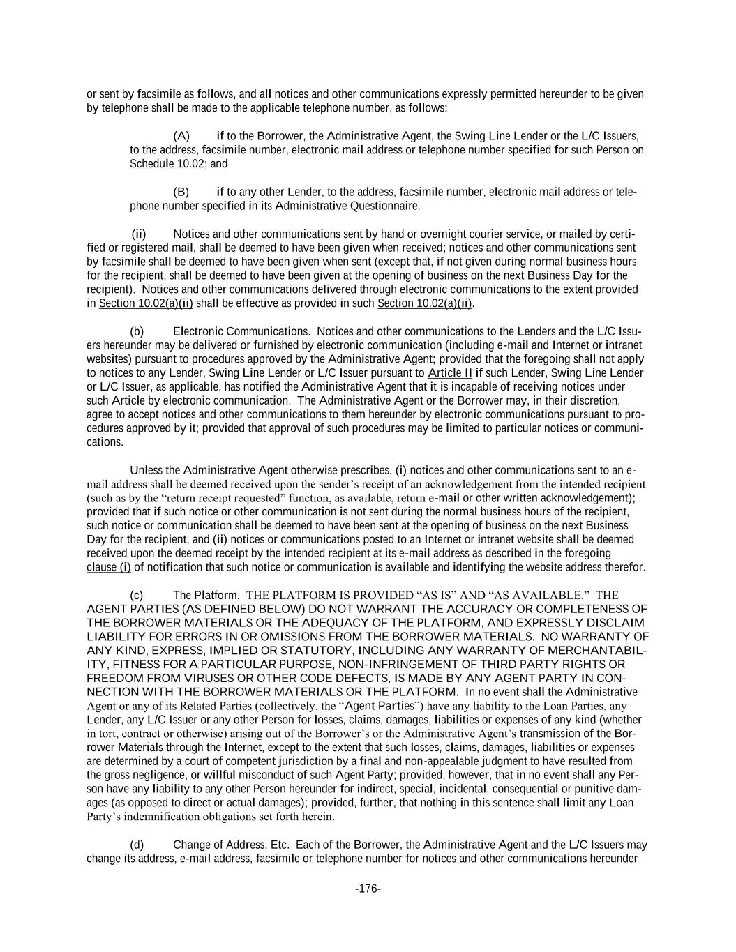 -176- or sent by facsimile as follows, and all notices and other communications expressly permitted hereunder to be given by telephone shall be made to the applicable telephone number, as follows: (A) if to the Borrower, the Administrative Agent, the Swing Line Lender or the L/C Issuers, to the address, facsimile number, electronic mail address or telephone number specified for such Person on Schedule 10.02; and (B) if to any other Lender, to the address, facsimile number, electronic mail address or tele- phone number specified in its Administrative Questionnaire. (ii) Notices and other communications sent by hand or overnight courier service, or mailed by certi- fied or registered mail, shall be deemed to have been given when received; notices and other communications sent by facsimile shall be deemed to have been given when sent (except that, if not given during normal business hours for the recipient, shall be deemed to have been given at the opening of business on the next Business Day for the recipient). Notices and other communications delivered through electronic communications to the extent provided in Section 10.02(a)(ii) shall be effective as provided in such Section 10.02(a)(ii). (b) Electronic Communications. Notices and other communications to the Lenders and the L/C Issu- ers hereunder may be delivered or furnished by electronic communication (including e-mail and Internet or intranet websites) pursuant to procedures approved by the Administrative Agent; provided that the foregoing shall not apply to notices to any Lender, Swing Line Lender or L/C Issuer pursuant to Article II if such Lender, Swing Line Lender or L/C Issuer, as applicable, has notified the Administrative Agent that it is incapable of receiving notices under such Article by electronic communication. The Administrative Agent or the Borrower may, in their discretion, agree to accept notices and other communications to them hereunder by electronic communications pursuant to pro- cedures approved by it; provided that approval of such procedures may be limited to particular notices or communi- cations. Unless the Administrative Agent otherwise prescribes, (i) notices and other communications sent to an e- mail address shall be deemed received upon the sender’s receipt of an acknowledgement from the intended recipient (such as by the “return receipt requested” function, as available, return e-mail or other written acknowledgement); provided that if such notice or other communication is not sent during the normal business hours of the recipient, such notice or communication shall be deemed to have been sent at the opening of business on the next Business Day for the recipient, and (ii) notices or communications posted to an Internet or intranet website shall be deemed received upon the deemed receipt by the intended recipient at its e-mail address as described in the foregoing clause (i) of notification that such notice or communication is available and identifying the website address therefor. (c) The Platform. THE PLATFORM IS PROVIDED “AS IS” AND “AS AVAILABLE.” THE AGENT PARTIES (AS DEFINED BELOW) DO NOT WARRANT THE ACCURACY OR COMPLETENESS OF THE BORROWER MATERIALS OR THE ADEQUACY OF THE PLATFORM, AND EXPRESSLY DISCLAIM LIABILITY FOR ERRORS IN OR OMISSIONS FROM THE BORROWER MATERIALS. NO WARRANTY OF ANY KIND, EXPRESS, IMPLIED OR STATUTORY, INCLUDING ANY WARRANTY OF MERCHANTABIL- ITY, FITNESS FOR A PARTICULAR PURPOSE, NON-INFRINGEMENT OF THIRD PARTY RIGHTS OR FREEDOM FROM VIRUSES OR OTHER CODE DEFECTS, IS MADE BY ANY AGENT PARTY IN CON- NECTION WITH THE BORROWER MATERIALS OR THE PLATFORM. In no event shall the Administrative Agent or any of its Related Parties (collectively, the “Agent Parties”) have any liability to the Loan Parties, any Lender, any L/C Issuer or any other Person for losses, claims, damages, liabilities or expenses of any kind (whether in tort, contract or otherwise) arising out of the Borrower’s or the Administrative Agent’s transmission of the Bor- rower Materials through the Internet, except to the extent that such losses, claims, damages, liabilities or expenses are determined by a court of competent jurisdiction by a final and non-appealable judgment to have resulted from the gross negligence, or willful misconduct of such Agent Party; provided, however, that in no event shall any Per- son have any liability to any other Person hereunder for indirect, special, incidental, consequential or punitive dam- ages (as opposed to direct or actual damages); provided, further, that nothing in this sentence shall limit any Loan Party’s indemnification obligations set forth herein. (d) Change of Address, Etc. Each of the Borrower, the Administrative Agent and the L/C Issuers may change its address, e-mail address, facsimile or telephone number for notices and other communications hereunder