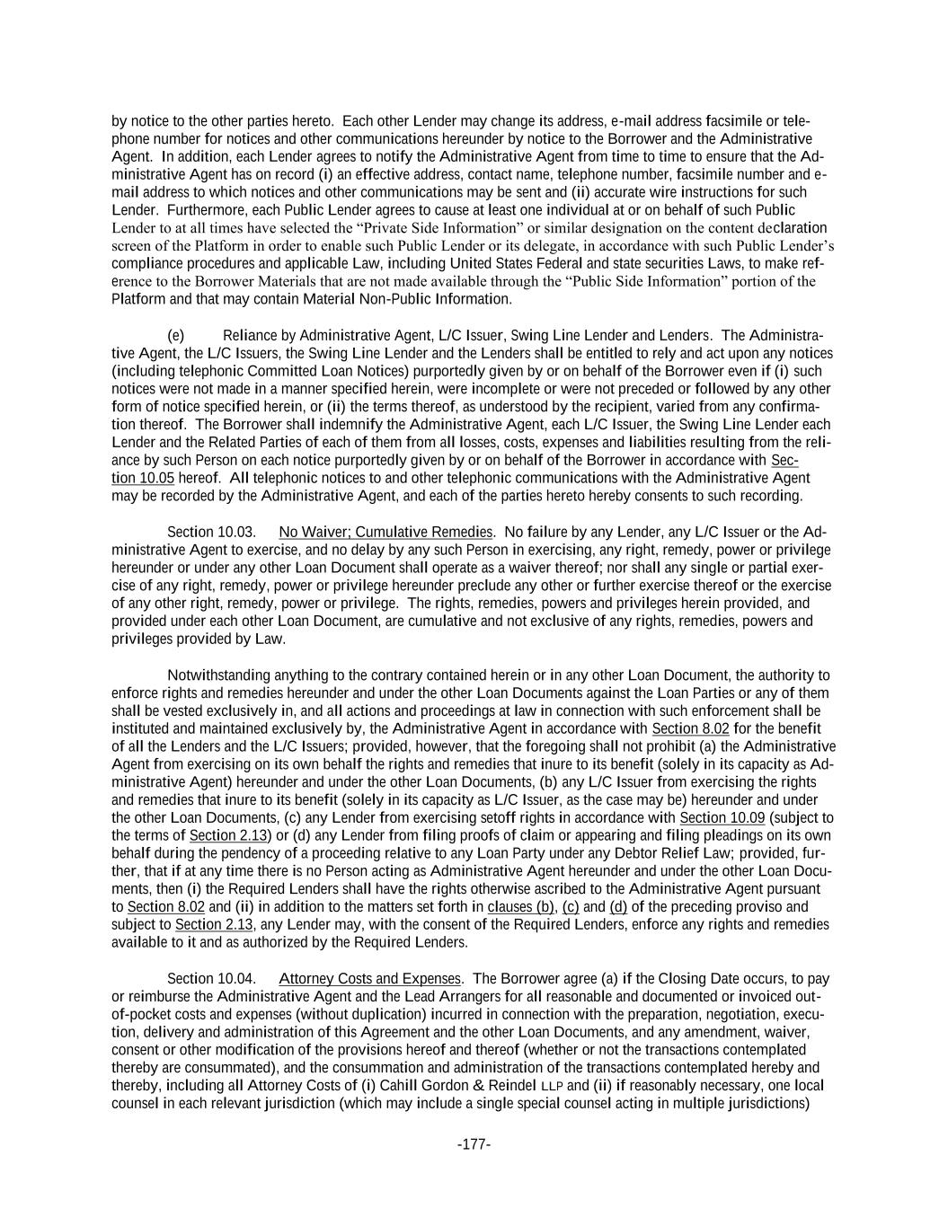 -177- by notice to the other parties hereto. Each other Lender may change its address, e-mail address facsimile or tele- phone number for notices and other communications hereunder by notice to the Borrower and the Administrative Agent. In addition, each Lender agrees to notify the Administrative Agent from time to time to ensure that the Ad- ministrative Agent has on record (i) an effective address, contact name, telephone number, facsimile number and e- mail address to which notices and other communications may be sent and (ii) accurate wire instructions for such Lender. Furthermore, each Public Lender agrees to cause at least one individual at or on behalf of such Public Lender to at all times have selected the “Private Side Information” or similar designation on the content declaration screen of the Platform in order to enable such Public Lender or its delegate, in accordance with such Public Lender’s compliance procedures and applicable Law, including United States Federal and state securities Laws, to make ref- erence to the Borrower Materials that are not made available through the “Public Side Information” portion of the Platform and that may contain Material Non-Public Information. (e) Reliance by Administrative Agent, L/C Issuer, Swing Line Lender and Lenders. The Administra- tive Agent, the L/C Issuers, the Swing Line Lender and the Lenders shall be entitled to rely and act upon any notices (including telephonic Committed Loan Notices) purportedly given by or on behalf of the Borrower even if (i) such notices were not made in a manner specified herein, were incomplete or were not preceded or followed by any other form of notice specified herein, or (ii) the terms thereof, as understood by the recipient, varied from any confirma- tion thereof. The Borrower shall indemnify the Administrative Agent, each L/C Issuer, the Swing Line Lender each Lender and the Related Parties of each of them from all losses, costs, expenses and liabilities resulting from the reli- ance by such Person on each notice purportedly given by or on behalf of the Borrower in accordance with Sec- tion 10.05 hereof. All telephonic notices to and other telephonic communications with the Administrative Agent may be recorded by the Administrative Agent, and each of the parties hereto hereby consents to such recording. Section 10.03. No Waiver; Cumulative Remedies. No failure by any Lender, any L/C Issuer or the Ad- ministrative Agent to exercise, and no delay by any such Person in exercising, any right, remedy, power or privilege hereunder or under any other Loan Document shall operate as a waiver thereof; nor shall any single or partial exer- cise of any right, remedy, power or privilege hereunder preclude any other or further exercise thereof or the exercise of any other right, remedy, power or privilege. The rights, remedies, powers and privileges herein provided, and provided under each other Loan Document, are cumulative and not exclusive of any rights, remedies, powers and privileges provided by Law. Notwithstanding anything to the contrary contained herein or in any other Loan Document, the authority to enforce rights and remedies hereunder and under the other Loan Documents against the Loan Parties or any of them shall be vested exclusively in, and all actions and proceedings at law in connection with such enforcement shall be instituted and maintained exclusively by, the Administrative Agent in accordance with Section 8.02 for the benefit of all the Lenders and the L/C Issuers; provided, however, that the foregoing shall not prohibit (a) the Administrative Agent from exercising on its own behalf the rights and remedies that inure to its benefit (solely in its capacity as Ad- ministrative Agent) hereunder and under the other Loan Documents, (b) any L/C Issuer from exercising the rights and remedies that inure to its benefit (solely in its capacity as L/C Issuer, as the case may be) hereunder and under the other Loan Documents, (c) any Lender from exercising setoff rights in accordance with Section 10.09 (subject to the terms of Section 2.13) or (d) any Lender from filing proofs of claim or appearing and filing pleadings on its own behalf during the pendency of a proceeding relative to any Loan Party under any Debtor Relief Law; provided, fur- ther, that if at any time there is no Person acting as Administrative Agent hereunder and under the other Loan Docu- ments, then (i) the Required Lenders shall have the rights otherwise ascribed to the Administrative Agent pursuant to Section 8.02 and (ii) in addition to the matters set forth in clauses (b), (c) and (d) of the preceding proviso and subject to Section 2.13, any Lender may, with the consent of the Required Lenders, enforce any rights and remedies available to it and as authorized by the Required Lenders. Section 10.04. Attorney Costs and Expenses. The Borrower agree (a) if the Closing Date occurs, to pay or reimburse the Administrative Agent and the Lead Arrangers for all reasonable and documented or invoiced out- of-pocket costs and expenses (without duplication) incurred in connection with the preparation, negotiation, execu- tion, delivery and administration of this Agreement and the other Loan Documents, and any amendment, waiver, consent or other modification of the provisions hereof and thereof (whether or not the transactions contemplated thereby are consummated), and the consummation and administration of the transactions contemplated hereby and thereby, including all Attorney Costs of (i) Cahill Gordon & Reindel LLP and (ii) if reasonably necessary, one local counsel in each relevant jurisdiction (which may include a single special counsel acting in multiple jurisdictions)