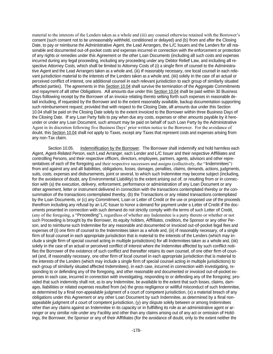 -178- material to the interests of the Lenders taken as a whole and (iii) any counsel otherwise retained with the Borrower’s consent (such consent not to be unreasonably withheld, conditioned or delayed) and (b) from and after the Closing Date, to pay or reimburse the Administrative Agent, the Lead Arrangers, the L/C Issuers and the Lenders for all rea- sonable and documented out-of-pocket costs and expenses incurred in connection with the enforcement or protection of any rights or remedies under this Agreement or the other Loan Documents (including all such costs and expenses incurred during any legal proceeding, including any proceeding under any Debtor Relief Law, and including all re- spective Attorney Costs, which shall be limited to Attorney Costs of (i) a single firm of counsel to the Administra- tive Agent and the Lead Arrangers taken as a whole and, (ii) if reasonably necessary, one local counsel in each rele- vant jurisdiction material to the interests of the Lenders taken as a whole and, (iii) solely in the case of an actual or perceived conflict of interest, one additional counsel in each relevant jurisdiction to each group of similarly situated affected parties). The agreements in this Section 10.04 shall survive the termination of the Aggregate Commitments and repayment of all other Obligations. All amounts due under this Section 10.04 shall be paid within 30 Business Days following receipt by the Borrower of an invoice relating thereto setting forth such expenses in reasonable de- tail including, if requested by the Borrower and to the extent reasonably available, backup documentation supporting such reimbursement request; provided that with respect to the Closing Date, all amounts due under this Section 10.04 shall be paid on the Closing Date solely to the extent invoiced to the Borrower within three Business Days of the Closing Date. If any Loan Party fails to pay when due any costs, expenses or other amounts payable by it here- under or under any Loan Document, such amount may be paid on behalf of such Loan Party by the Administrative Agent in its discretion following five Business Days’ prior written notice to the Borrower. For the avoidance of doubt, this Section 10.04 shall not apply to Taxes, except any Taxes that represent costs and expenses arising from any non-Tax claim. Section 10.05. Indemnification by the Borrower. The Borrower shall indemnify and hold harmless each Agent, Agent-Related Person, each Lead Arranger, each Lender and L/C Issuer and their respective Affiliates and controlling Persons, and their respective officers, directors, employees, partners, agents, advisors and other repre- sentatives of each of the foregoing and their respective successors and assigns (collectively, the “Indemnitees”) from and against any and all liabilities, obligations, losses, damages, penalties, claims, demands, actions, judgments, suits, costs, expenses and disbursements, joint or several, to which such Indemnitee may become subject (including, for the avoidance of doubt, any Environmental Liability) to the extent arising out of, or resulting from or in connec- tion with (a) the execution, delivery, enforcement, performance or administration of any Loan Document or any other agreement, letter or instrument delivered in connection with the transactions contemplated thereby or the con- summation of the transactions contemplated thereby, (b) the Transactions or any related transactions contemplated by the Loan Documents, or (c) any Commitment, Loan or Letter of Credit or the use or proposed use of the proceeds therefrom including any refusal by an L/C Issuer to honor a demand for payment under a Letter of Credit if the doc- uments presented in connection with such demand do not strictly comply with the terms of such Letter of Credit, (any of the foregoing, a “Proceeding”), regardless of whether any Indemnitee is a party thereto or whether or not such Proceeding is brought by the Borrower, its equity holders, Affiliates, creditors, the Sponsor or any other Per- son, and to reimburse such Indemnitee for any reasonable and documented or invoiced out-of-pocket legal fees and expenses of (i) one firm of counsel to the Indemnitees taken as a whole and, (ii) if reasonably necessary, of a single firm of local counsel in each appropriate jurisdiction that is material to the interests of the Lenders (which may in- clude a single firm of special counsel acting in multiple jurisdictions) for all Indemnitees taken as a whole and, (iii) solely in the case of an actual or perceived conflict of interest where the Indemnitee affected by such conflict noti- fies the Borrower of the existence of such conflict and thereafter retains its own counsel, of one other firm of coun- sel (and, if reasonably necessary, one other firm of local counsel in each appropriate jurisdiction that is material to the interests of the Lenders (which may include a single firm of special counsel acting in multiple jurisdictions) to each group of similarly situated affected Indemnitees), in each case, incurred in connection with investigating, re- sponding to or defending any of the foregoing, and other reasonable and documented or invoiced out-of-pocket ex- penses in each case, incurred in connection with investigating, responding to or defending any of the foregoing; pro- vided that such indemnity shall not, as to any Indemnitee, be available to the extent that such losses, claims, dam- ages, liabilities or related expenses resulted from (w) the gross negligence or willful misconduct of such Indemnitee, as determined by a final non-appealable judgment of a court of competent jurisdiction, (x) a material breach of any obligations under this Agreement or any other Loan Document by such Indemnitee, as determined by a final non- appealable judgment of a court of competent jurisdiction, (y) any dispute solely between or among Indemnitees other than any claims against an Indemnitee in its capacity or in fulf