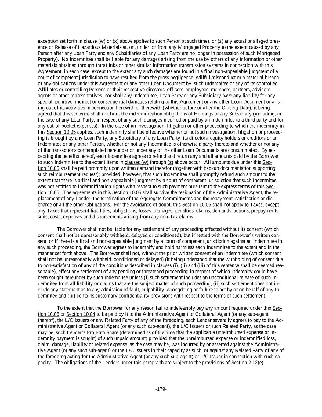 -179- exception set forth in clause (w) or (x) above applies to such Person at such time), or (z) any actual or alleged pres- ence or Release of Hazardous Materials at, on, under, or from any Mortgaged Property to the extent caused by any Person after any Loan Party and any Subsidiaries of any Loan Party are no longer in possession of such Mortgaged Property). No Indemnitee shall be liable for any damages arising from the use by others of any information or other materials obtained through IntraLinks or other similar information transmission systems in connection with this Agreement, in each case, except to the extent any such damages are found in a final non-appealable judgment of a court of competent jurisdiction to have resulted from the gross negligence, willful misconduct or a material breach of any obligations under this Agreement or any other Loan Document by, such Indemnitee or any of its controlled Affiliates or controlling Persons or their respective directors, officers, employees, members, partners, advisors, agents or other representatives, nor shall any Indemnitee, Loan Party or any Subsidiary have any liability for any special, punitive, indirect or consequential damages relating to this Agreement or any other Loan Document or aris- ing out of its activities in connection herewith or therewith (whether before or after the Closing Date); it being agreed that this sentence shall not limit the indemnification obligations of Holdings or any Subsidiary (including, in the case of any Loan Party, in respect of any such damages incurred or paid by an Indemnitee to a third party and for any out-of-pocket expenses). In the case of an investigation, litigation or other proceeding to which the indemnity in this Section 10.05 applies, such indemnity shall be effective whether or not such investigation, litigation or proceed- ing is brought by any Loan Party, any Subsidiary of any Loan Party, its directors, equity holders or creditors or an Indemnitee or any other Person, whether or not any Indemnitee is otherwise a party thereto and whether or not any of the transactions contemplated hereunder or under any of the other Loan Documents are consummated. By ac- cepting the benefits hereof, each Indemnitee agrees to refund and return any and all amounts paid by the Borrower to such Indemnitee to the extent items in clauses (w) through (z) above occur. All amounts due under this Sec- tion 10.05 shall be paid promptly upon written demand therefor (together with backup documentation supporting such reimbursement request); provided, however, that such Indemnitee shall promptly refund such amount to the extent that there is a final and non-appealable judgment by a court of competent jurisdiction that such Indemnitee was not entitled to indemnification rights with respect to such payment pursuant to the express terms of this Sec- tion 10.05. The agreements in this Section 10.05 shall survive the resignation of the Administrative Agent, the re- placement of any Lender, the termination of the Aggregate Commitments and the repayment, satisfaction or dis- charge of all the other Obligations. For the avoidance of doubt, this Section 10.05 shall not apply to Taxes, except any Taxes that represent liabilities, obligations, losses, damages, penalties, claims, demands, actions, prepayments, suits, costs, expenses and disbursements arising from any non-Tax claims. The Borrower shall not be liable for any settlement of any proceeding effected without its consent (which consent shall not be unreasonably withheld, delayed or conditioned), but if settled with the Borrower’s written con- sent, or if there is a final and non-appealable judgment by a court of competent jurisdiction against an Indemnitee in any such proceeding, the Borrower agrees to indemnify and hold harmless each Indemnitee to the extent and in the manner set forth above. The Borrower shall not, without the prior written consent of an Indemnitee (which consent shall not be unreasonably withheld, conditioned or delayed) (it being understood that the withholding of consent due to non-satisfaction of any of the conditions described in clauses (i), (ii) and (iii) of this sentence shall be deemed rea- sonable), effect any settlement of any pending or threatened proceeding in respect of which indemnity could have been sought hereunder by such Indemnitee unless (i) such settlement includes an unconditional release of such In- demnitee from all liability or claims that are the subject matter of such proceeding, (ii) such settlement does not in- clude any statement as to any admission of fault, culpability, wrongdoing or failure to act by or on behalf of any In- demnitee and (iii) contains customary confidentiality provisions with respect to the terms of such settlement. To the extent that the Borrower for any reason fail to indefeasibly pay any amount required under this Sec- tion 10.05 or Section 10.04 to be paid by it to the Administrative Agent or Collateral Agent (or any sub-agent thereof), the L/C Issuers or any Related Party of any of the foregoing, each Lender severally agrees to pay to the Ad- ministrative Agent or Collateral Agent (or any such sub-agent), the L/C Issuers or such Related Party, as the case may be, such Lender’s Pro Rata Share (determined as of the time that the applicable unreimbursed expense or in- demnity payment is sought) of such unpaid amount; provided that the unreimbursed expense or indemnified loss, claim, damage, liability or related expense, as the case may be, was incurred by or asserted against the Administra- tive Agent (or any such sub-agent) or the L/C Issuers in their capacity as such, or against any Related Party of any of the foregoing acting for the Administrative Agent (or any such sub-agent) or L/C Issuer in connection with such ca- pacity. The obligations of the Lenders under this paragraph are subject to the provisions of Section 2.12(e).