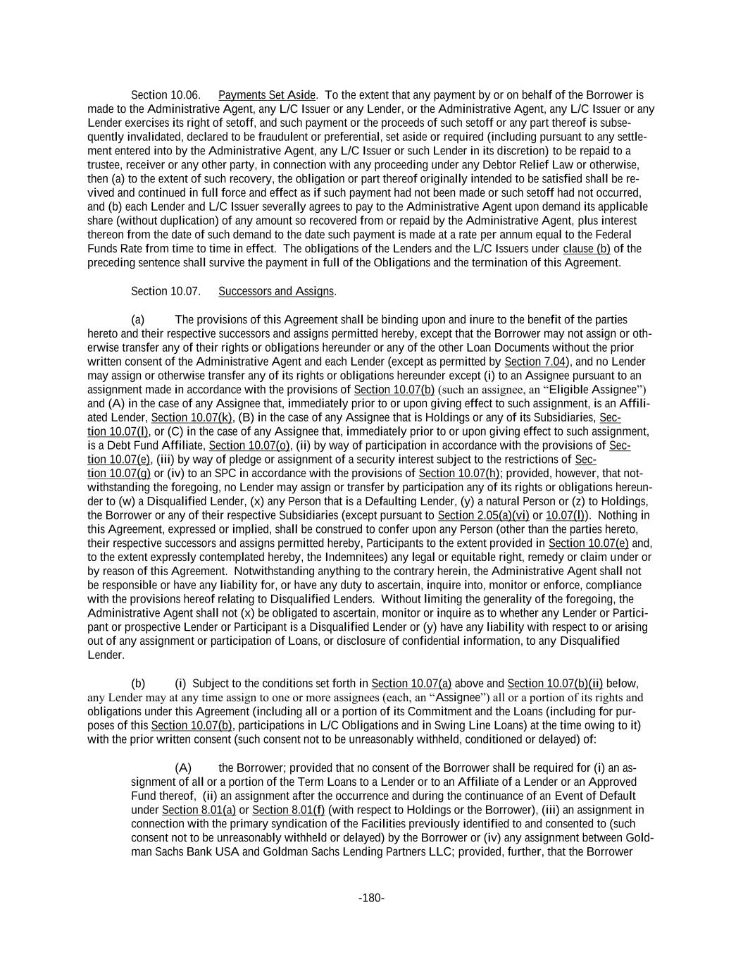-180- Section 10.06. Payments Set Aside. To the extent that any payment by or on behalf of the Borrower is made to the Administrative Agent, any L/C Issuer or any Lender, or the Administrative Agent, any L/C Issuer or any Lender exercises its right of setoff, and such payment or the proceeds of such setoff or any part thereof is subse- quently invalidated, declared to be fraudulent or preferential, set aside or required (including pursuant to any settle- ment entered into by the Administrative Agent, any L/C Issuer or such Lender in its discretion) to be repaid to a trustee, receiver or any other party, in connection with any proceeding under any Debtor Relief Law or otherwise, then (a) to the extent of such recovery, the obligation or part thereof originally intended to be satisfied shall be re- vived and continued in full force and effect as if such payment had not been made or such setoff had not occurred, and (b) each Lender and L/C Issuer severally agrees to pay to the Administrative Agent upon demand its applicable share (without duplication) of any amount so recovered from or repaid by the Administrative Agent, plus interest thereon from the date of such demand to the date such payment is made at a rate per annum equal to the Federal Funds Rate from time to time in effect. The obligations of the Lenders and the L/C Issuers under clause (b) of the preceding sentence shall survive the payment in full of the Obligations and the termination of this Agreement. Section 10.07. Successors and Assigns. (a) The provisions of this Agreement shall be binding upon and inure to the benefit of the parties hereto and their respective successors and assigns permitted hereby, except that the Borrower may not assign or oth- erwise transfer any of their rights or obligations hereunder or any of the other Loan Documents without the prior written consent of the Administrative Agent and each Lender (except as permitted by Section 7.04), and no Lender may assign or otherwise transfer any of its rights or obligations hereunder except (i) to an Assignee pursuant to an assignment made in accordance with the provisions of Section 10.07(b) (such an assignee, an “Eligible Assignee”) and (A) in the case of any Assignee that, immediately prior to or upon giving effect to such assignment, is an Affili- ated Lender, Section 10.07(k), (B) in the case of any Assignee that is Holdings or any of its Subsidiaries, Sec- tion 10.07(l), or (C) in the case of any Assignee that, immediately prior to or upon giving effect to such assignment, is a Debt Fund Affiliate, Section 10.07(o), (ii) by way of participation in accordance with the provisions of Sec- tion 10.07(e), (iii) by way of pledge or assignment of a security interest subject to the restrictions of Sec- tion 10.07(g) or (iv) to an SPC in accordance with the provisions of Section 10.07(h); provided, however, that not- withstanding the foregoing, no Lender may assign or transfer by participation any of its rights or obligations hereun- der to (w) a Disqualified Lender, (x) any Person that is a Defaulting Lender, (y) a natural Person or (z) to Holdings, the Borrower or any of their respective Subsidiaries (except pursuant to Section 2.05(a)(vi) or 10.07(l)). Nothing in this Agreement, expressed or implied, shall be construed to confer upon any Person (other than the parties hereto, their respective successors and assigns permitted hereby, Participants to the extent provided in Section 10.07(e) and, to the extent expressly contemplated hereby, the Indemnitees) any legal or equitable right, remedy or claim under or by reason of this Agreement. Notwithstanding anything to the contrary herein, the Administrative Agent shall not be responsible or have any liability for, or have any duty to ascertain, inquire into, monitor or enforce, compliance with the provisions hereof relating to Disqualified Lenders. Without limiting the generality of the foregoing, the Administrative Agent shall not (x) be obligated to ascertain, monitor or inquire as to whether any Lender or Partici- pant or prospective Lender or Participant is a Disqualified Lender or (y) have any liability with respect to or arising out of any assignment or participation of Loans, or disclosure of confidential information, to any Disqualified Lender. (b) (i) Subject to the conditions set forth in Section 10.07(a) above and Section 10.07(b)(ii) below, any Lender may at any time assign to one or more assignees (each, an “Assignee”) all or a portion of its rights and obligations under this Agreement (including all or a portion of its Commitment and the Loans (including for pur- poses of this Section 10.07(b), participations in L/C Obligations and in Swing Line Loans) at the time owing to it) with the prior written consent (such consent not to be unreasonably withheld, conditioned or delayed) of: (A) the Borrower; provided that no consent of the Borrower shall be required for (i) an as- signment of all or a portion of the Term Loans to a Lender or to an Affiliate of a Lender or an Approved Fund thereof, (ii) an assignment after the occurrence and during the continuance of an Event of Default under Section 8.01(a) or Section 8.01(f) (with respect to Holdings or the Borrower), (iii) an assignment in connection with the primary syndication of the Facilities previously identified to and consented to (such consent not to be unreasonably withheld or delayed) by the Borrower or (iv) any assignment between Gold- man Sachs Bank USA and Goldman Sachs Lending Partners LLC; provided, further, that the Borrower