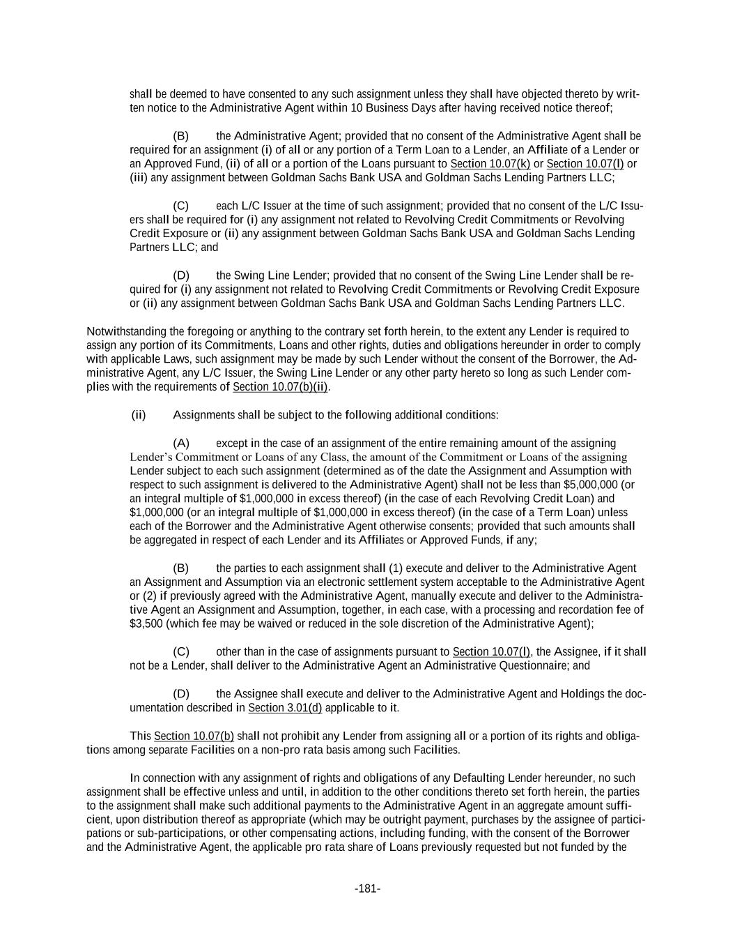 -181- shall be deemed to have consented to any such assignment unless they shall have objected thereto by writ- ten notice to the Administrative Agent within 10 Business Days after having received notice thereof; (B) the Administrative Agent; provided that no consent of the Administrative Agent shall be required for an assignment (i) of all or any portion of a Term Loan to a Lender, an Affiliate of a Lender or an Approved Fund, (ii) of all or a portion of the Loans pursuant to Section 10.07(k) or Section 10.07(l) or (iii) any assignment between Goldman Sachs Bank USA and Goldman Sachs Lending Partners LLC; (C) each L/C Issuer at the time of such assignment; provided that no consent of the L/C Issu- ers shall be required for (i) any assignment not related to Revolving Credit Commitments or Revolving Credit Exposure or (ii) any assignment between Goldman Sachs Bank USA and Goldman Sachs Lending Partners LLC; and (D) the Swing Line Lender; provided that no consent of the Swing Line Lender shall be re- quired for (i) any assignment not related to Revolving Credit Commitments or Revolving Credit Exposure or (ii) any assignment between Goldman Sachs Bank USA and Goldman Sachs Lending Partners LLC. Notwithstanding the foregoing or anything to the contrary set forth herein, to the extent any Lender is required to assign any portion of its Commitments, Loans and other rights, duties and obligations hereunder in order to comply with applicable Laws, such assignment may be made by such Lender without the consent of the Borrower, the Ad- ministrative Agent, any L/C Issuer, the Swing Line Lender or any other party hereto so long as such Lender com- plies with the requirements of Section 10.07(b)(ii). (ii) Assignments shall be subject to the following additional conditions: (A) except in the case of an assignment of the entire remaining amount of the assigning Lender’s Commitment or Loans of any Class, the amount of the Commitment or Loans of the assigning Lender subject to each such assignment (determined as of the date the Assignment and Assumption with respect to such assignment is delivered to the Administrative Agent) shall not be less than $5,000,000 (or an integral multiple of $1,000,000 in excess thereof) (in the case of each Revolving Credit Loan) and $1,000,000 (or an integral multiple of $1,000,000 in excess thereof) (in the case of a Term Loan) unless each of the Borrower and the Administrative Agent otherwise consents; provided that such amounts shall be aggregated in respect of each Lender and its Affiliates or Approved Funds, if any; (B) the parties to each assignment shall (1) execute and deliver to the Administrative Agent an Assignment and Assumption via an electronic settlement system acceptable to the Administrative Agent or (2) if previously agreed with the Administrative Agent, manually execute and deliver to the Administra- tive Agent an Assignment and Assumption, together, in each case, with a processing and recordation fee of $3,500 (which fee may be waived or reduced in the sole discretion of the Administrative Agent); (C) other than in the case of assignments pursuant to Section 10.07(l), the Assignee, if it shall not be a Lender, shall deliver to the Administrative Agent an Administrative Questionnaire; and (D) the Assignee shall execute and deliver to the Administrative Agent and Holdings the doc- umentation described in Section 3.01(d) applicable to it. This Section 10.07(b) shall not prohibit any Lender from assigning all or a portion of its rights and obliga- tions among separate Facilities on a non-pro rata basis among such Facilities. In connection with any assignment of rights and obligations of any Defaulting Lender hereunder, no such assignment shall be effective unless and until, in addition to the other conditions thereto set forth herein, the parties to the assignment shall make such additional payments to the Administrative Agent in an aggregate amount suffi- cient, upon distribution thereof as appropriate (which may be outright payment, purchases by the assignee of partici- pations or sub-participations, or other compensating actions, including funding, with the consent of the Borrower and the Administrative Agent, the applicable pro rata share of Loans previously requested but not funded by the