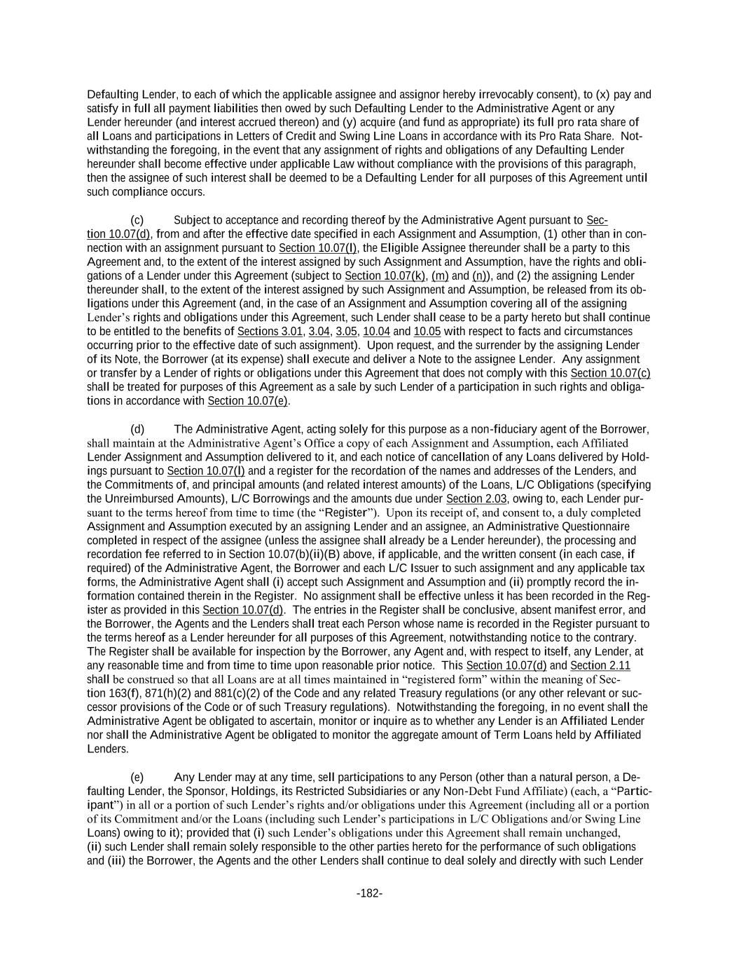 -182- Defaulting Lender, to each of which the applicable assignee and assignor hereby irrevocably consent), to (x) pay and satisfy in full all payment liabilities then owed by such Defaulting Lender to the Administrative Agent or any Lender hereunder (and interest accrued thereon) and (y) acquire (and fund as appropriate) its full pro rata share of all Loans and participations in Letters of Credit and Swing Line Loans in accordance with its Pro Rata Share. Not- withstanding the foregoing, in the event that any assignment of rights and obligations of any Defaulting Lender hereunder shall become effective under applicable Law without compliance with the provisions of this paragraph, then the assignee of such interest shall be deemed to be a Defaulting Lender for all purposes of this Agreement until such compliance occurs. (c) Subject to acceptance and recording thereof by the Administrative Agent pursuant to Sec- tion 10.07(d), from and after the effective date specified in each Assignment and Assumption, (1) other than in con- nection with an assignment pursuant to Section 10.07(l), the Eligible Assignee thereunder shall be a party to this Agreement and, to the extent of the interest assigned by such Assignment and Assumption, have the rights and obli- gations of a Lender under this Agreement (subject to Section 10.07(k), (m) and (n)), and (2) the assigning Lender thereunder shall, to the extent of the interest assigned by such Assignment and Assumption, be released from its ob- ligations under this Agreement (and, in the case of an Assignment and Assumption covering all of the assigning Lender’s rights and obligations under this Agreement, such Lender shall cease to be a party hereto but shall continue to be entitled to the benefits of Sections 3.01, 3.04, 3.05, 10.04 and 10.05 with respect to facts and circumstances occurring prior to the effective date of such assignment). Upon request, and the surrender by the assigning Lender of its Note, the Borrower (at its expense) shall execute and deliver a Note to the assignee Lender. Any assignment or transfer by a Lender of rights or obligations under this Agreement that does not comply with this Section 10.07(c) shall be treated for purposes of this Agreement as a sale by such Lender of a participation in such rights and obliga- tions in accordance with Section 10.07(e). (d) The Administrative Agent, acting solely for this purpose as a non-fiduciary agent of the Borrower, shall maintain at the Administrative Agent’s Office a copy of each Assignment and Assumption, each Affiliated Lender Assignment and Assumption delivered to it, and each notice of cancellation of any Loans delivered by Hold- ings pursuant to Section 10.07(l) and a register for the recordation of the names and addresses of the Lenders, and the Commitments of, and principal amounts (and related interest amounts) of the Loans, L/C Obligations (specifying the Unreimbursed Amounts), L/C Borrowings and the amounts due under Section 2.03, owing to, each Lender pur- suant to the terms hereof from time to time (the “Register”). Upon its receipt of, and consent to, a duly completed Assignment and Assumption executed by an assigning Lender and an assignee, an Administrative Questionnaire completed in respect of the assignee (unless the assignee shall already be a Lender hereunder), the processing and recordation fee referred to in Section 10.07(b)(ii)(B) above, if applicable, and the written consent (in each case, if required) of the Administrative Agent, the Borrower and each L/C Issuer to such assignment and any applicable tax forms, the Administrative Agent shall (i) accept such Assignment and Assumption and (ii) promptly record the in- formation contained therein in the Register. No assignment shall be effective unless it has been recorded in the Reg- ister as provided in this Section 10.07(d). The entries in the Register shall be conclusive, absent manifest error, and the Borrower, the Agents and the Lenders shall treat each Person whose name is recorded in the Register pursuant to the terms hereof as a Lender hereunder for all purposes of this Agreement, notwithstanding notice to the contrary. The Register shall be available for inspection by the Borrower, any Agent and, with respect to itself, any Lender, at any reasonable time and from time to time upon reasonable prior notice. This Section 10.07(d) and Section 2.11 shall be construed so that all Loans are at all times maintained in “registered form” within the meaning of Sec- tion 163(f), 871(h)(2) and 881(c)(2) of the Code and any related Treasury regulations (or any other relevant or suc- cessor provisions of the Code or of such Treasury regulations). Notwithstanding the foregoing, in no event shall the Administrative Agent be obligated to ascertain, monitor or inquire as to whether any Lender is an Affiliated Lender nor shall the Administrative Agent be obligated to monitor the aggregate amount of Term Loans held by Affiliated Lenders. (e) Any Lender may at any time, sell participations to any Person (other than a natural person, a De- faulting Lender, the Sponsor, Holdings, its Restricted Subsidiaries or any Non-Debt Fund Affiliate) (each, a “Partic- ipant”) in all or a portion of such Lender’s rights and/or obligations under this Agreement (including all or a portion of its Commitment and/or the Loans (including such Lender’s participations in L/C Obligations and/or Swing Line Loans) owing to it); provided that (i) such Lender’s obligations under this Agreement shall remain unchanged, (ii) such Lender shall remain solely responsible to the other parties hereto for the performance of such obligations and (iii) the Borrower, the Agents and the other Lenders shall continue to deal solely and directly with such Lender