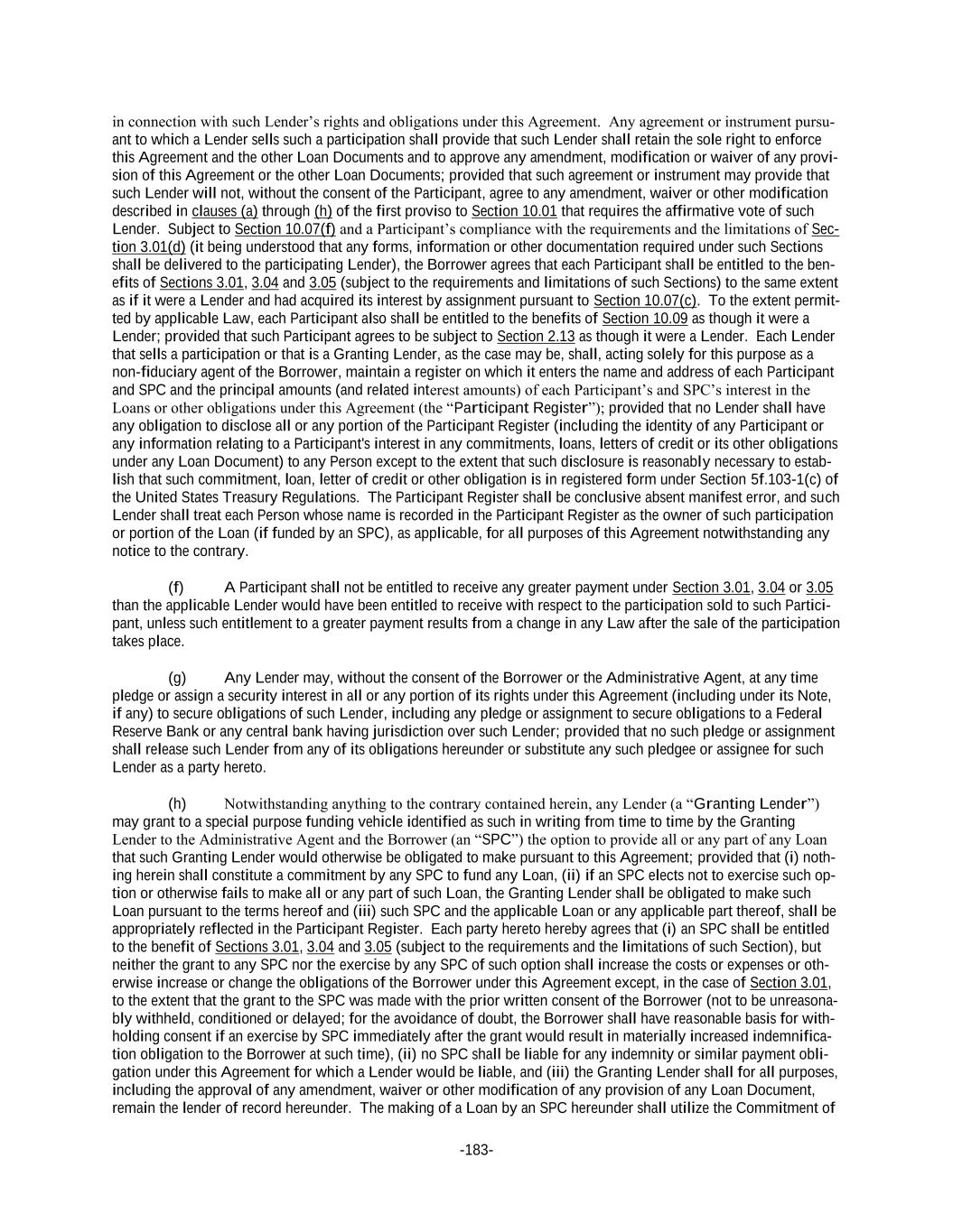 -183- in connection with such Lender’s rights and obligations under this Agreement. Any agreement or instrument pursu- ant to which a Lender sells such a participation shall provide that such Lender shall retain the sole right to enforce this Agreement and the other Loan Documents and to approve any amendment, modification or waiver of any provi- sion of this Agreement or the other Loan Documents; provided that such agreement or instrument may provide that such Lender will not, without the consent of the Participant, agree to any amendment, waiver or other modification described in clauses (a) through (h) of the first proviso to Section 10.01 that requires the affirmative vote of such Lender. Subject to Section 10.07(f) and a Participant’s compliance with the requirements and the limitations of Sec- tion 3.01(d) (it being understood that any forms, information or other documentation required under such Sections shall be delivered to the participating Lender), the Borrower agrees that each Participant shall be entitled to the ben- efits of Sections 3.01, 3.04 and 3.05 (subject to the requirements and limitations of such Sections) to the same extent as if it were a Lender and had acquired its interest by assignment pursuant to Section 10.07(c). To the extent permit- ted by applicable Law, each Participant also shall be entitled to the benefits of Section 10.09 as though it were a Lender; provided that such Participant agrees to be subject to Section 2.13 as though it were a Lender. Each Lender that sells a participation or that is a Granting Lender, as the case may be, shall, acting solely for this purpose as a non-fiduciary agent of the Borrower, maintain a register on which it enters the name and address of each Participant and SPC and the principal amounts (and related interest amounts) of each Participant’s and SPC’s interest in the Loans or other obligations under this Agreement (the “Participant Register”); provided that no Lender shall have any obligation to disclose all or any portion of the Participant Register (including the identity of any Participant or any information relating to a Participant's interest in any commitments, loans, letters of credit or its other obligations under any Loan Document) to any Person except to the extent that such disclosure is reasonably necessary to estab- lish that such commitment, loan, letter of credit or other obligation is in registered form under Section 5f.103-1(c) of the United States Treasury Regulations. The Participant Register shall be conclusive absent manifest error, and such Lender shall treat each Person whose name is recorded in the Participant Register as the owner of such participation or portion of the Loan (if funded by an SPC), as applicable, for all purposes of this Agreement notwithstanding any notice to the contrary. (f) A Participant shall not be entitled to receive any greater payment under Section 3.01, 3.04 or 3.05 than the applicable Lender would have been entitled to receive with respect to the participation sold to such Partici- pant, unless such entitlement to a greater payment results from a change in any Law after the sale of the participation takes place. (g) Any Lender may, without the consent of the Borrower or the Administrative Agent, at any time pledge or assign a security interest in all or any portion of its rights under this Agreement (including under its Note, if any) to secure obligations of such Lender, including any pledge or assignment to secure obligations to a Federal Reserve Bank or any central bank having jurisdiction over such Lender; provided that no such pledge or assignment shall release such Lender from any of its obligations hereunder or substitute any such pledgee or assignee for such Lender as a party hereto. (h) Notwithstanding anything to the contrary contained herein, any Lender (a “Granting Lender”) may grant to a special purpose funding vehicle identified as such in writing from time to time by the Granting Lender to the Administrative Agent and the Borrower (an “SPC”) the option to provide all or any part of any Loan that such Granting Lender would otherwise be obligated to make pursuant to this Agreement; provided that (i) noth- ing herein shall constitute a commitment by any SPC to fund any Loan, (ii) if an SPC elects not to exercise such op- tion or otherwise fails to make all or any part of such Loan, the Granting Lender shall be obligated to make such Loan pursuant to the terms hereof and (iii) such SPC and the applicable Loan or any applicable part thereof, shall be appropriately reflected in the Participant Register. Each party hereto hereby agrees that (i) an SPC shall be entitled to the benefit of Sections 3.01, 3.04 and 3.05 (subject to the requirements and the limitations of such Section), but neither the grant to any SPC nor the exercise by any SPC of such option shall increase the costs or expenses or oth- erwise increase or change the obligations of the Borrower under this Agreement except, in the case of Section 3.01, to the extent that the grant to the SPC was made with the prior written consent of the Borrower (not to be unreasona- bly withheld, conditioned or delayed; for the avoidance of doubt, the Borrower shall have reasonable basis for with- holding consent if an exercise by SPC immediately after the grant would result in materially increased indemnifica- tion obligation to the Borrower at such time), (ii) no SPC shall be liable for any indemnity or similar payment obli- gation under this Agreement for which a Lender would be liable, and (iii) the Granting Lender shall for all purposes, including the approval of any amendment, waiver or other modification of any provision of any Loan Document, remain the lender of record hereunder. The making of a Loan by an SPC hereunder shall utilize the Commitment of
