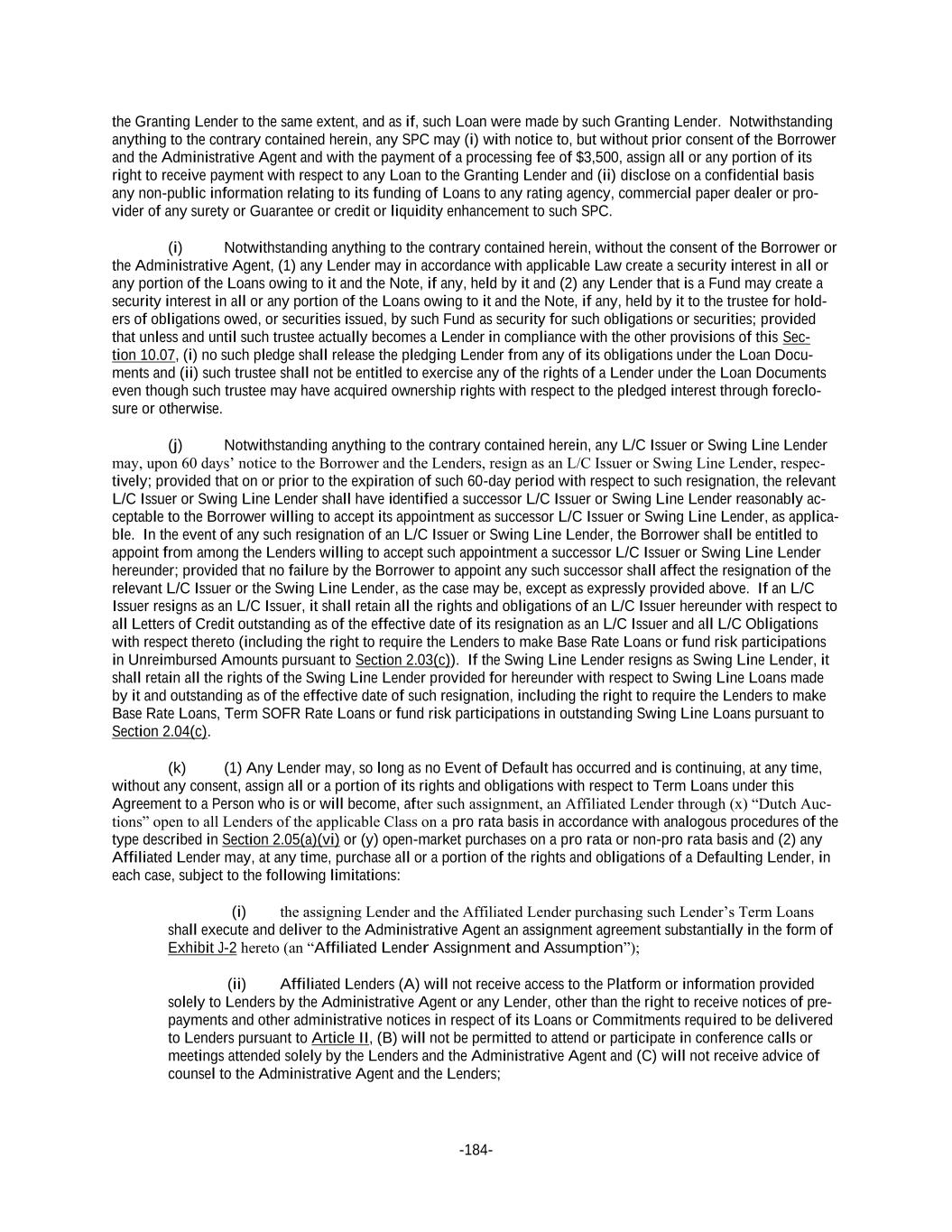 -184- the Granting Lender to the same extent, and as if, such Loan were made by such Granting Lender. Notwithstanding anything to the contrary contained herein, any SPC may (i) with notice to, but without prior consent of the Borrower and the Administrative Agent and with the payment of a processing fee of $3,500, assign all or any portion of its right to receive payment with respect to any Loan to the Granting Lender and (ii) disclose on a confidential basis any non-public information relating to its funding of Loans to any rating agency, commercial paper dealer or pro- vider of any surety or Guarantee or credit or liquidity enhancement to such SPC. (i) Notwithstanding anything to the contrary contained herein, without the consent of the Borrower or the Administrative Agent, (1) any Lender may in accordance with applicable Law create a security interest in all or any portion of the Loans owing to it and the Note, if any, held by it and (2) any Lender that is a Fund may create a security interest in all or any portion of the Loans owing to it and the Note, if any, held by it to the trustee for hold- ers of obligations owed, or securities issued, by such Fund as security for such obligations or securities; provided that unless and until such trustee actually becomes a Lender in compliance with the other provisions of this Sec- tion 10.07, (i) no such pledge shall release the pledging Lender from any of its obligations under the Loan Docu- ments and (ii) such trustee shall not be entitled to exercise any of the rights of a Lender under the Loan Documents even though such trustee may have acquired ownership rights with respect to the pledged interest through foreclo- sure or otherwise. (j) Notwithstanding anything to the contrary contained herein, any L/C Issuer or Swing Line Lender may, upon 60 days’ notice to the Borrower and the Lenders, resign as an L/C Issuer or Swing Line Lender, respec- tively; provided that on or prior to the expiration of such 60-day period with respect to such resignation, the relevant L/C Issuer or Swing Line Lender shall have identified a successor L/C Issuer or Swing Line Lender reasonably ac- ceptable to the Borrower willing to accept its appointment as successor L/C Issuer or Swing Line Lender, as applica- ble. In the event of any such resignation of an L/C Issuer or Swing Line Lender, the Borrower shall be entitled to appoint from among the Lenders willing to accept such appointment a successor L/C Issuer or Swing Line Lender hereunder; provided that no failure by the Borrower to appoint any such successor shall affect the resignation of the relevant L/C Issuer or the Swing Line Lender, as the case may be, except as expressly provided above. If an L/C Issuer resigns as an L/C Issuer, it shall retain all the rights and obligations of an L/C Issuer hereunder with respect to all Letters of Credit outstanding as of the effective date of its resignation as an L/C Issuer and all L/C Obligations with respect thereto (including the right to require the Lenders to make Base Rate Loans or fund risk participations in Unreimbursed Amounts pursuant to Section 2.03(c)). If the Swing Line Lender resigns as Swing Line Lender, it shall retain all the rights of the Swing Line Lender provided for hereunder with respect to Swing Line Loans made by it and outstanding as of the effective date of such resignation, including the right to require the Lenders to make Base Rate Loans, Term SOFR Rate Loans or fund risk participations in outstanding Swing Line Loans pursuant to Section 2.04(c). (k) (1) Any Lender may, so long as no Event of Default has occurred and is continuing, at any time, without any consent, assign all or a portion of its rights and obligations with respect to Term Loans under this Agreement to a Person who is or will become, after such assignment, an Affiliated Lender through (x) “Dutch Auc- tions” open to all Lenders of the applicable Class on a pro rata basis in accordance with analogous procedures of the type described in Section 2.05(a)(vi) or (y) open-market purchases on a pro rata or non-pro rata basis and (2) any Affiliated Lender may, at any time, purchase all or a portion of the rights and obligations of a Defaulting Lender, in each case, subject to the following limitations: (i) the assigning Lender and the Affiliated Lender purchasing such Lender’s Term Loans shall execute and deliver to the Administrative Agent an assignment agreement substantially in the form of Exhibit J-2 hereto (an “Affiliated Lender Assignment and Assumption”); (ii) Affiliated Lenders (A) will not receive access to the Platform or information provided solely to Lenders by the Administrative Agent or any Lender, other than the right to receive notices of pre- payments and other administrative notices in respect of its Loans or Commitments required to be delivered to Lenders pursuant to Article II, (B) will not be permitted to attend or participate in conference calls or meetings attended solely by the Lenders and the Administrative Agent and (C) will not receive advice of counsel to the Administrative Agent and the Lenders;