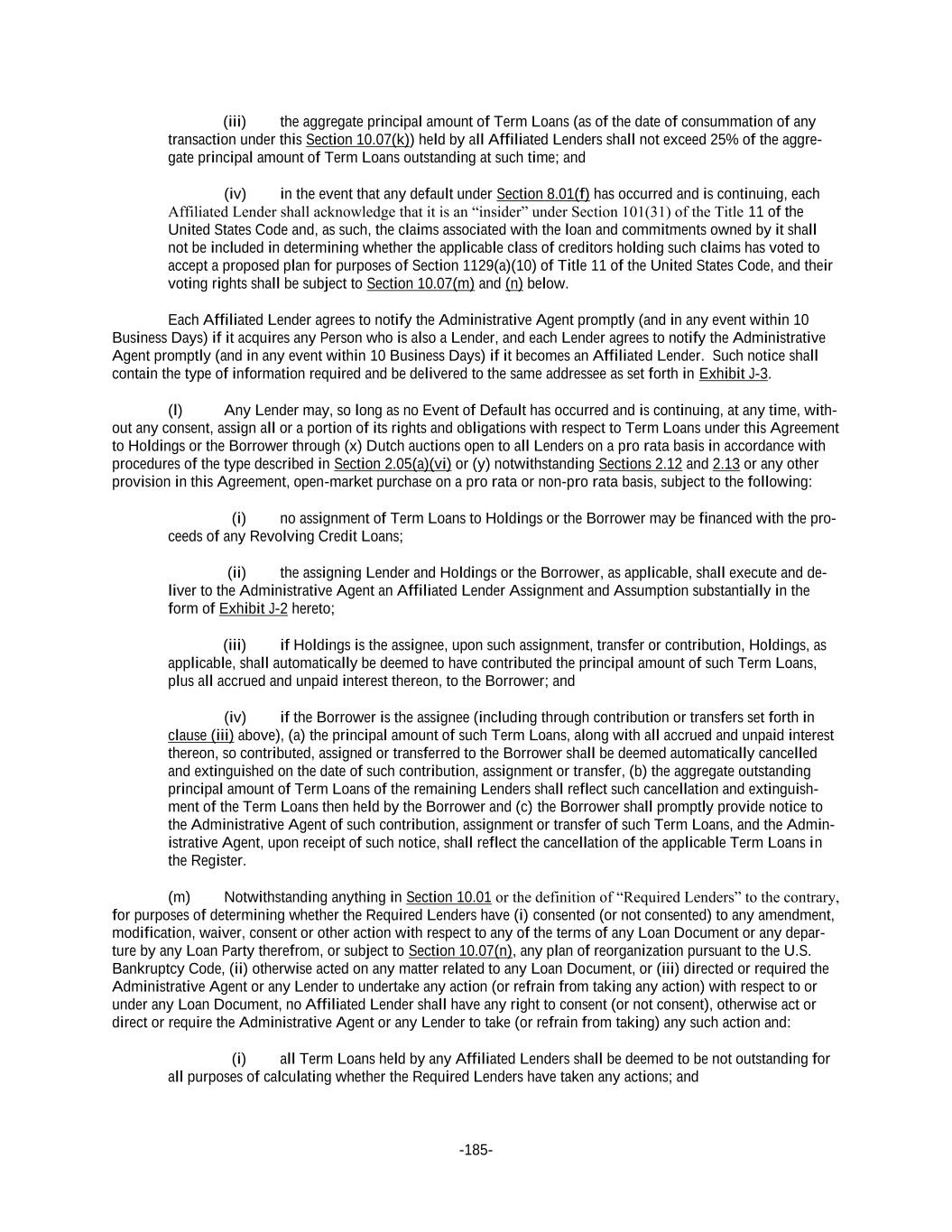 -185- (iii) the aggregate principal amount of Term Loans (as of the date of consummation of any transaction under this Section 10.07(k)) held by all Affiliated Lenders shall not exceed 25% of the aggre- gate principal amount of Term Loans outstanding at such time; and (iv) in the event that any default under Section 8.01(f) has occurred and is continuing, each Affiliated Lender shall acknowledge that it is an “insider” under Section 101(31) of the Title 11 of the United States Code and, as such, the claims associated with the loan and commitments owned by it shall not be included in determining whether the applicable class of creditors holding such claims has voted to accept a proposed plan for purposes of Section 1129(a)(10) of Title 11 of the United States Code, and their voting rights shall be subject to Section 10.07(m) and (n) below. Each Affiliated Lender agrees to notify the Administrative Agent promptly (and in any event within 10 Business Days) if it acquires any Person who is also a Lender, and each Lender agrees to notify the Administrative Agent promptly (and in any event within 10 Business Days) if it becomes an Affiliated Lender. Such notice shall contain the type of information required and be delivered to the same addressee as set forth in Exhibit J-3. (l) Any Lender may, so long as no Event of Default has occurred and is continuing, at any time, with- out any consent, assign all or a portion of its rights and obligations with respect to Term Loans under this Agreement to Holdings or the Borrower through (x) Dutch auctions open to all Lenders on a pro rata basis in accordance with procedures of the type described in Section 2.05(a)(vi) or (y) notwithstanding Sections 2.12 and 2.13 or any other provision in this Agreement, open-market purchase on a pro rata or non-pro rata basis, subject to the following: (i) no assignment of Term Loans to Holdings or the Borrower may be financed with the pro- ceeds of any Revolving Credit Loans; (ii) the assigning Lender and Holdings or the Borrower, as applicable, shall execute and de- liver to the Administrative Agent an Affiliated Lender Assignment and Assumption substantially in the form of Exhibit J-2 hereto; (iii) if Holdings is the assignee, upon such assignment, transfer or contribution, Holdings, as applicable, shall automatically be deemed to have contributed the principal amount of such Term Loans, plus all accrued and unpaid interest thereon, to the Borrower; and (iv) if the Borrower is the assignee (including through contribution or transfers set forth in clause (iii) above), (a) the principal amount of such Term Loans, along with all accrued and unpaid interest thereon, so contributed, assigned or transferred to the Borrower shall be deemed automatically cancelled and extinguished on the date of such contribution, assignment or transfer, (b) the aggregate outstanding principal amount of Term Loans of the remaining Lenders shall reflect such cancellation and extinguish- ment of the Term Loans then held by the Borrower and (c) the Borrower shall promptly provide notice to the Administrative Agent of such contribution, assignment or transfer of such Term Loans, and the Admin- istrative Agent, upon receipt of such notice, shall reflect the cancellation of the applicable Term Loans in the Register. (m) Notwithstanding anything in Section 10.01 or the definition of “Required Lenders” to the contrary, for purposes of determining whether the Required Lenders have (i) consented (or not consented) to any amendment, modification, waiver, consent or other action with respect to any of the terms of any Loan Document or any depar- ture by any Loan Party therefrom, or subject to Section 10.07(n), any plan of reorganization pursuant to the U.S. Bankruptcy Code, (ii) otherwise acted on any matter related to any Loan Document, or (iii) directed or required the Administrative Agent or any Lender to undertake any action (or refrain from taking any action) with respect to or under any Loan Document, no Affiliated Lender shall have any right to consent (or not consent), otherwise act or direct or require the Administrative Agent or any Lender to take (or refrain from taking) any such action and: (i) all Term Loans held by any Affiliated Lenders shall be deemed to be not outstanding for all purposes of calculating whether the Required Lenders have taken any actions; and