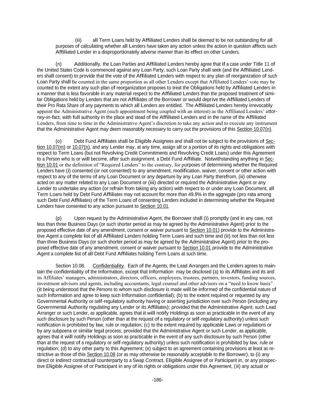-186- (ii) all Term Loans held by Affiliated Lenders shall be deemed to be not outstanding for all purposes of calculating whether all Lenders have taken any action unless the action in question affects such Affiliated Lender in a disproportionately adverse manner than its effect on other Lenders. (n) Additionally, the Loan Parties and Affiliated Lenders hereby agree that if a case under Title 11 of the United States Code is commenced against any Loan Party, such Loan Party shall seek (and the Affiliated Lend- ers shall consent) to provide that the vote of the Affiliated Lenders with respect to any plan of reorganization of such Loan Party shall be counted in the same proportion as all other Lenders except that Affiliated Lenders’ vote may be counted to the extent any such plan of reorganization proposes to treat the Obligations held by Affiliated Lenders in a manner that is less favorable in any material respect to the Affiliated Lenders than the proposed treatment of simi- lar Obligations held by Lenders that are not Affiliates of the Borrower or would deprive the Affiliated Lenders of their Pro Rata Share of any payments to which all Lenders are entitled. The Affiliated Lenders hereby irrevocably appoint the Administrative Agent (such appointment being coupled with an interest) as the Affiliated Lenders’ attor- ney-in-fact, with full authority in the place and stead of the Affiliated Lenders and in the name of the Affiliated Lenders, from time to time in the Administrative Agent’s discretion to take any action and to execute any instrument that the Administrative Agent may deem reasonably necessary to carry out the provisions of this Section 10.07(n). (o) Debt Fund Affiliates shall be Eligible Assignees and shall not be subject to the provisions of Sec- tion 10.07(m) or 10.07(n), and any Lender may, at any time, assign all or a portion of its rights and obligations with respect to Term Loans (but not Revolving Credit Commitments and Revolving Credit Loans) under this Agreement to a Person who is or will become, after such assignment, a Debt Fund Affiliate. Notwithstanding anything in Sec- tion 10.01 or the definition of “Required Lenders” to the contrary, for purposes of determining whether the Required Lenders have (i) consented (or not consented) to any amendment, modification, waiver, consent or other action with respect to any of the terms of any Loan Document or any departure by any Loan Party therefrom, (ii) otherwise acted on any matter related to any Loan Document or (iii) directed or required the Administrative Agent or any Lender to undertake any action (or refrain from taking any action) with respect to or under any Loan Document, all Term Loans held by Debt Fund Affiliates may not account for more than 49.9% in the aggregate (pro rata among such Debt Fund Affiliates) of the Term Loans of consenting Lenders included in determining whether the Required Lenders have consented to any action pursuant to Section 10.01. (p) Upon request by the Administrative Agent, the Borrower shall (i) promptly (and in any case, not less than three Business Days (or such shorter period as may be agreed by the Administrative Agent) prior to the proposed effective date of any amendment, consent or waiver pursuant to Section 10.01) provide to the Administra- tive Agent a complete list of all Affiliated Lenders holding Term Loans and such time and (ii) not less than not less than three Business Days (or such shorter period as may be agreed by the Administrative Agent) prior to the pro- posed effective date of any amendment, consent or waiver pursuant to Section 10.01 provide to the Administrative Agent a complete list of all Debt Fund Affiliates holding Term Loans at such time. Section 10.08. Confidentiality. Each of the Agents, the Lead Arrangers and the Lenders agrees to main- tain the confidentiality of the Information, except that Information may be disclosed (a) to its Affiliates and its and its Affiliates’ managers, administrators, directors, officers, employees, trustees, partners, investors, funding sources, investment advisors and agents, including accountants, legal counsel and other advisors on a “need to know basis” (it being understood that the Persons to whom such disclosure is made will be informed of the confidential nature of such Information and agree to keep such Information confidential); (b) to the extent required or requested by any Governmental Authority or self-regulatory authority having or asserting jurisdiction over such Person (including any Governmental Authority regulating any Lender or its Affiliates); provided that the Administrative Agent, such Lead Arranger or such Lender, as applicable, agrees that it will notify Holdings as soon as practicable in the event of any such disclosure by such Person (other than at the request of a regulatory or self-regulatory authority) unless such notification is prohibited by law, rule or regulation; (c) to the extent required by applicable Laws or regulations or by any subpoena or similar legal process; provided that the Administrative Agent or such Lender, as applicable, agrees that it will notify Holdings as soon as practicable in the event of any such disclosure by such Person (other than at the request of a regulatory or self-regulatory authority) unless such notification is prohibited by law, rule or regulation; (d) to any other party to this Agreement; (e) subject to an agreement containing provisions at least as re- strictive as those of this Section 10.08 (or as may otherwise be reasonably acceptable to the Borrower), to (i) any direct or indirect contractual counterparty to a Swap Contract, Eligible Assignee of or Participant in, or any prospec- tive Eligible Assignee of or Participant in any of its rights or obligations under this Agreement, (ii) any actual or