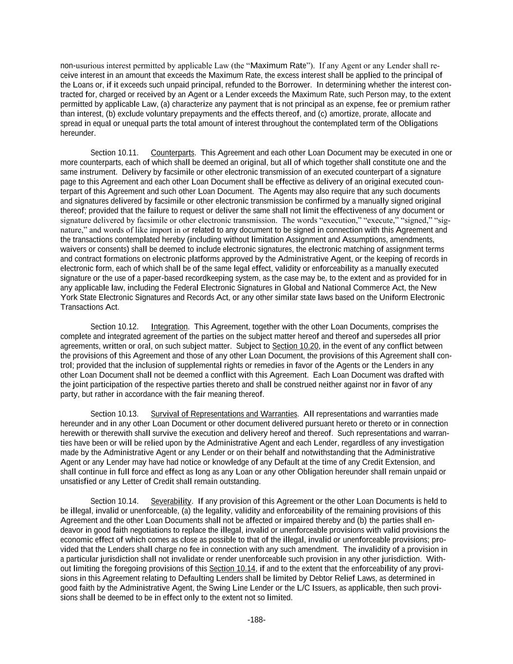 -188- non-usurious interest permitted by applicable Law (the “Maximum Rate”). If any Agent or any Lender shall re- ceive interest in an amount that exceeds the Maximum Rate, the excess interest shall be applied to the principal of the Loans or, if it exceeds such unpaid principal, refunded to the Borrower. In determining whether the interest con- tracted for, charged or received by an Agent or a Lender exceeds the Maximum Rate, such Person may, to the extent permitted by applicable Law, (a) characterize any payment that is not principal as an expense, fee or premium rather than interest, (b) exclude voluntary prepayments and the effects thereof, and (c) amortize, prorate, allocate and spread in equal or unequal parts the total amount of interest throughout the contemplated term of the Obligations hereunder. Section 10.11. Counterparts. This Agreement and each other Loan Document may be executed in one or more counterparts, each of which shall be deemed an original, but all of which together shall constitute one and the same instrument. Delivery by facsimile or other electronic transmission of an executed counterpart of a signature page to this Agreement and each other Loan Document shall be effective as delivery of an original executed coun- terpart of this Agreement and such other Loan Document. The Agents may also require that any such documents and signatures delivered by facsimile or other electronic transmission be confirmed by a manually signed original thereof; provided that the failure to request or deliver the same shall not limit the effectiveness of any document or signature delivered by facsimile or other electronic transmission. The words “execution,” “execute,” “signed,” “sig- nature,” and words of like import in or related to any document to be signed in connection with this Agreement and the transactions contemplated hereby (including without limitation Assignment and Assumptions, amendments, waivers or consents) shall be deemed to include electronic signatures, the electronic matching of assignment terms and contract formations on electronic platforms approved by the Administrative Agent, or the keeping of records in electronic form, each of which shall be of the same legal effect, validity or enforceability as a manually executed signature or the use of a paper-based recordkeeping system, as the case may be, to the extent and as provided for in any applicable law, including the Federal Electronic Signatures in Global and National Commerce Act, the New York State Electronic Signatures and Records Act, or any other similar state laws based on the Uniform Electronic Transactions Act. Section 10.12. Integration. This Agreement, together with the other Loan Documents, comprises the complete and integrated agreement of the parties on the subject matter hereof and thereof and supersedes all prior agreements, written or oral, on such subject matter. Subject to Section 10.20, in the event of any conflict between the provisions of this Agreement and those of any other Loan Document, the provisions of this Agreement shall con- trol; provided that the inclusion of supplemental rights or remedies in favor of the Agents or the Lenders in any other Loan Document shall not be deemed a conflict with this Agreement. Each Loan Document was drafted with the joint participation of the respective parties thereto and shall be construed neither against nor in favor of any party, but rather in accordance with the fair meaning thereof. Section 10.13. Survival of Representations and Warranties. All representations and warranties made hereunder and in any other Loan Document or other document delivered pursuant hereto or thereto or in connection herewith or therewith shall survive the execution and delivery hereof and thereof. Such representations and warran- ties have been or will be relied upon by the Administrative Agent and each Lender, regardless of any investigation made by the Administrative Agent or any Lender or on their behalf and notwithstanding that the Administrative Agent or any Lender may have had notice or knowledge of any Default at the time of any Credit Extension, and shall continue in full force and effect as long as any Loan or any other Obligation hereunder shall remain unpaid or unsatisfied or any Letter of Credit shall remain outstanding. Section 10.14. Severability. If any provision of this Agreement or the other Loan Documents is held to be illegal, invalid or unenforceable, (a) the legality, validity and enforceability of the remaining provisions of this Agreement and the other Loan Documents shall not be affected or impaired thereby and (b) the parties shall en- deavor in good faith negotiations to replace the illegal, invalid or unenforceable provisions with valid provisions the economic effect of which comes as close as possible to that of the illegal, invalid or unenforceable provisions; pro- vided that the Lenders shall charge no fee in connection with any such amendment. The invalidity of a provision in a particular jurisdiction shall not invalidate or render unenforceable such provision in any other jurisdiction. With- out limiting the foregoing provisions of this Section 10.14, if and to the extent that the enforceability of any provi- sions in this Agreement relating to Defaulting Lenders shall be limited by Debtor Relief Laws, as determined in good faith by the Administrative Agent, the Swing Line Lender or the L/C Issuers, as applicable, then such provi- sions shall be deemed to be in effect only to the extent not so limited.
