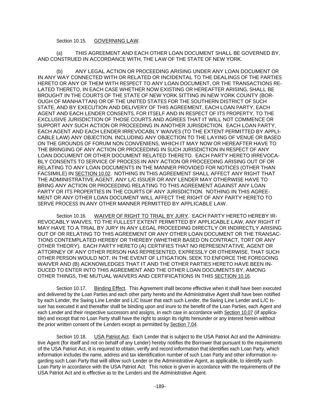 -189- Section 10.15. GOVERNING LAW. (a) THIS AGREEMENT AND EACH OTHER LOAN DOCUMENT SHALL BE GOVERNED BY, AND CONSTRUED IN ACCORDANCE WITH, THE LAW OF THE STATE OF NEW YORK. (b) ANY LEGAL ACTION OR PROCEEDING ARISING UNDER ANY LOAN DOCUMENT OR IN ANY WAY CONNECTED WITH OR RELATED OR INCIDENTAL TO THE DEALINGS OF THE PARTIES HERETO OR ANY OF THEM WITH RESPECT TO ANY LOAN DOCUMENT, OR THE TRANSACTIONS RE- LATED THERETO, IN EACH CASE WHETHER NOW EXISTING OR HEREAFTER ARISING, SHALL BE BROUGHT IN THE COURTS OF THE STATE OF NEW YORK SITTING IN NEW YORK COUNTY (BOR- OUGH OF MANHATTAN) OR OF THE UNITED STATES FOR THE SOUTHERN DISTRICT OF SUCH STATE, AND BY EXECUTION AND DELIVERY OF THIS AGREEMENT, EACH LOAN PARTY, EACH AGENT AND EACH LENDER CONSENTS, FOR ITSELF AND IN RESPECT OF ITS PROPERTY, TO THE EXCLUSIVE JURISDICTION OF THOSE COURTS AND AGREES THAT IT WILL NOT COMMENCE OR SUPPORT ANY SUCH ACTION OR PROCEEDING IN ANOTHER JURISDICTION. EACH LOAN PARTY, EACH AGENT AND EACH LENDER IRREVOCABLY WAIVES (TO THE EXTENT PERMITTED BY APPLI- CABLE LAW) ANY OBJECTION, INCLUDING ANY OBJECTION TO THE LAYING OF VENUE OR BASED ON THE GROUNDS OF FORUM NON CONVENIENS, WHICH IT MAY NOW OR HEREAFTER HAVE TO THE BRINGING OF ANY ACTION OR PROCEEDING IN SUCH JURISDICTION IN RESPECT OF ANY LOAN DOCUMENT OR OTHER DOCUMENT RELATED THERETO. EACH PARTY HERETO IRREVOCA- BLY CONSENTS TO SERVICE OF PROCESS IN ANY ACTION OR PROCEEDING ARISING OUT OF OR RELATING TO ANY LOAN DOCUMENTS IN THE MANNER PROVIDED FOR NOTICES (OTHER THAN FACSIMILE) IN SECTION 10.02. NOTHING IN THIS AGREEMENT SHALL AFFECT ANY RIGHT THAT THE ADMINISTRATIVE AGENT, ANY L/C ISSUER OR ANY LENDER MAY OTHERWISE HAVE TO BRING ANY ACTION OR PROCEEDING RELATING TO THIS AGREEMENT AGAINST ANY LOAN PARTY OR ITS PROPERTIES IN THE COURTS OF ANY JURISDICTION. NOTHING IN THIS AGREE- MENT OR ANY OTHER LOAN DOCUMENT WILL AFFECT THE RIGHT OF ANY PARTY HERETO TO SERVE PROCESS IN ANY OTHER MANNER PERMITTED BY APPLICABLE LAW. Section 10.16. WAIVER OF RIGHT TO TRIAL BY JURY. EACH PARTY HERETO HEREBY IR- REVOCABLY WAIVES, TO THE FULLEST EXTENT PERMITTED BY APPLICABLE LAW, ANY RIGHT IT MAY HAVE TO A TRIAL BY JURY IN ANY LEGAL PROCEEDING DIRECTLY OR INDIRECTLY ARISING OUT OF OR RELATING TO THIS AGREEMENT OR ANY OTHER LOAN DOCUMENT OR THE TRANSAC- TIONS CONTEMPLATED HEREBY OR THEREBY (WHETHER BASED ON CONTRACT, TORT OR ANY OTHER THEORY). EACH PARTY HERETO (A) CERTIFIES THAT NO REPRESENTATIVE, AGENT OR ATTORNEY OF ANY OTHER PERSON HAS REPRESENTED, EXPRESSLY OR OTHERWISE, THAT SUCH OTHER PERSON WOULD NOT, IN THE EVENT OF LITIGATION, SEEK TO ENFORCE THE FOREGOING WAIVER AND (B) ACKNOWLEDGES THAT IT AND THE OTHER PARTIES HERETO HAVE BEEN IN- DUCED TO ENTER INTO THIS AGREEMENT AND THE OTHER LOAN DOCUMENTS BY, AMONG OTHER THINGS, THE MUTUAL WAIVERS AND CERTIFICATIONS IN THIS SECTION 10.16. Section 10.17. Binding Effect. This Agreement shall become effective when it shall have been executed and delivered by the Loan Parties and each other party hereto and the Administrative Agent shall have been notified by each Lender, the Swing Line Lender and L/C Issuer that each such Lender, the Swing Line Lender and L/C Is- suer has executed it and thereafter shall be binding upon and inure to the benefit of the Loan Parties, each Agent and each Lender and their respective successors and assigns, in each case in accordance with Section 10.07 (if applica- ble) and except that no Loan Party shall have the right to assign its rights hereunder or any interest herein without the prior written consent of the Lenders except as permitted by Section 7.04. Section 10.18. USA Patriot Act. Each Lender that is subject to the USA Patriot Act and the Administra- tive Agent (for itself and not on behalf of any Lender) hereby notifies the Borrower that pursuant to the requirements of the USA Patriot Act, it is required to obtain, verify and record information that identifies each Loan Party, which information includes the name, address and tax identification number of such Loan Party and other information re- garding such Loan Party that will allow such Lender or the Administrative Agent, as applicable, to identify such Loan Party in accordance with the USA Patriot Act. This notice is given in accordance with the requirements of the USA Patriot Act and is effective as to the Lenders and the Administrative Agent.