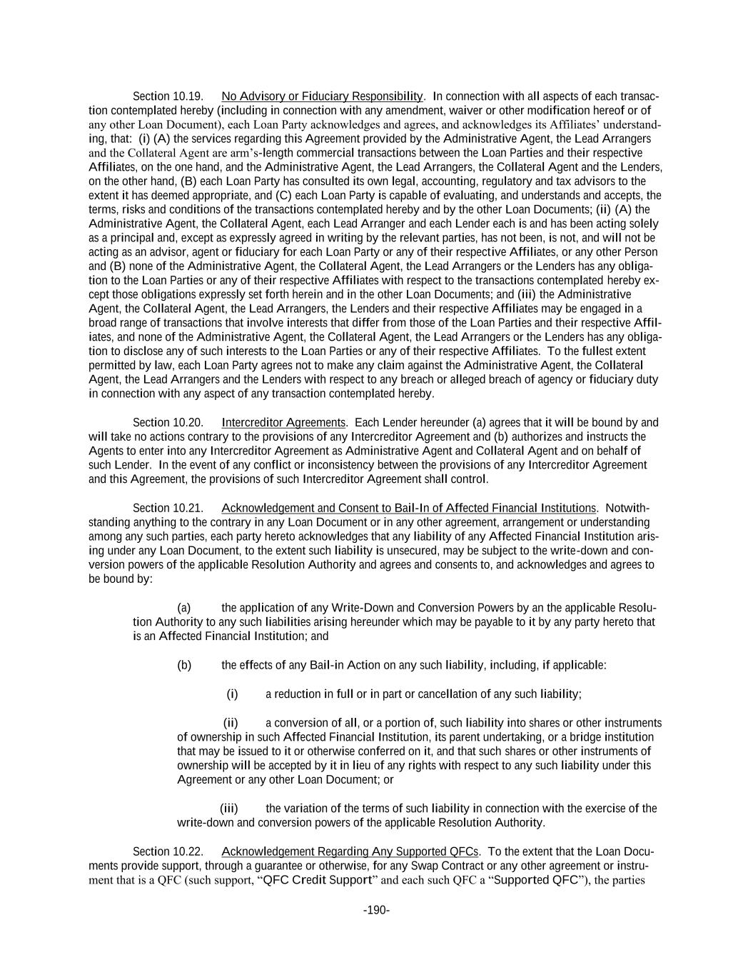 -190- Section 10.19. No Advisory or Fiduciary Responsibility. In connection with all aspects of each transac- tion contemplated hereby (including in connection with any amendment, waiver or other modification hereof or of any other Loan Document), each Loan Party acknowledges and agrees, and acknowledges its Affiliates’ understand- ing, that: (i) (A) the services regarding this Agreement provided by the Administrative Agent, the Lead Arrangers and the Collateral Agent are arm’s-length commercial transactions between the Loan Parties and their respective Affiliates, on the one hand, and the Administrative Agent, the Lead Arrangers, the Collateral Agent and the Lenders, on the other hand, (B) each Loan Party has consulted its own legal, accounting, regulatory and tax advisors to the extent it has deemed appropriate, and (C) each Loan Party is capable of evaluating, and understands and accepts, the terms, risks and conditions of the transactions contemplated hereby and by the other Loan Documents; (ii) (A) the Administrative Agent, the Collateral Agent, each Lead Arranger and each Lender each is and has been acting solely as a principal and, except as expressly agreed in writing by the relevant parties, has not been, is not, and will not be acting as an advisor, agent or fiduciary for each Loan Party or any of their respective Affiliates, or any other Person and (B) none of the Administrative Agent, the Collateral Agent, the Lead Arrangers or the Lenders has any obliga- tion to the Loan Parties or any of their respective Affiliates with respect to the transactions contemplated hereby ex- cept those obligations expressly set forth herein and in the other Loan Documents; and (iii) the Administrative Agent, the Collateral Agent, the Lead Arrangers, the Lenders and their respective Affiliates may be engaged in a broad range of transactions that involve interests that differ from those of the Loan Parties and their respective Affil- iates, and none of the Administrative Agent, the Collateral Agent, the Lead Arrangers or the Lenders has any obliga- tion to disclose any of such interests to the Loan Parties or any of their respective Affiliates. To the fullest extent permitted by law, each Loan Party agrees not to make any claim against the Administrative Agent, the Collateral Agent, the Lead Arrangers and the Lenders with respect to any breach or alleged breach of agency or fiduciary duty in connection with any aspect of any transaction contemplated hereby. Section 10.20. Intercreditor Agreements. Each Lender hereunder (a) agrees that it will be bound by and will take no actions contrary to the provisions of any Intercreditor Agreement and (b) authorizes and instructs the Agents to enter into any Intercreditor Agreement as Administrative Agent and Collateral Agent and on behalf of such Lender. In the event of any conflict or inconsistency between the provisions of any Intercreditor Agreement and this Agreement, the provisions of such Intercreditor Agreement shall control. Section 10.21. Acknowledgement and Consent to Bail-In of Affected Financial Institutions. Notwith- standing anything to the contrary in any Loan Document or in any other agreement, arrangement or understanding among any such parties, each party hereto acknowledges that any liability of any Affected Financial Institution aris- ing under any Loan Document, to the extent such liability is unsecured, may be subject to the write-down and con- version powers of the applicable Resolution Authority and agrees and consents to, and acknowledges and agrees to be bound by: (a) the application of any Write-Down and Conversion Powers by an the applicable Resolu- tion Authority to any such liabilities arising hereunder which may be payable to it by any party hereto that is an Affected Financial Institution; and (b) the effects of any Bail-in Action on any such liability, including, if applicable: (i) a reduction in full or in part or cancellation of any such liability; (ii) a conversion of all, or a portion of, such liability into shares or other instruments of ownership in such Affected Financial Institution, its parent undertaking, or a bridge institution that may be issued to it or otherwise conferred on it, and that such shares or other instruments of ownership will be accepted by it in lieu of any rights with respect to any such liability under this Agreement or any other Loan Document; or (iii) the variation of the terms of such liability in connection with the exercise of the write-down and conversion powers of the applicable Resolution Authority. Section 10.22. Acknowledgement Regarding Any Supported QFCs. To the extent that the Loan Docu- ments provide support, through a guarantee or otherwise, for any Swap Contract or any other agreement or instru- ment that is a QFC (such support, “QFC Credit Support” and each such QFC a “Supported QFC”), the parties