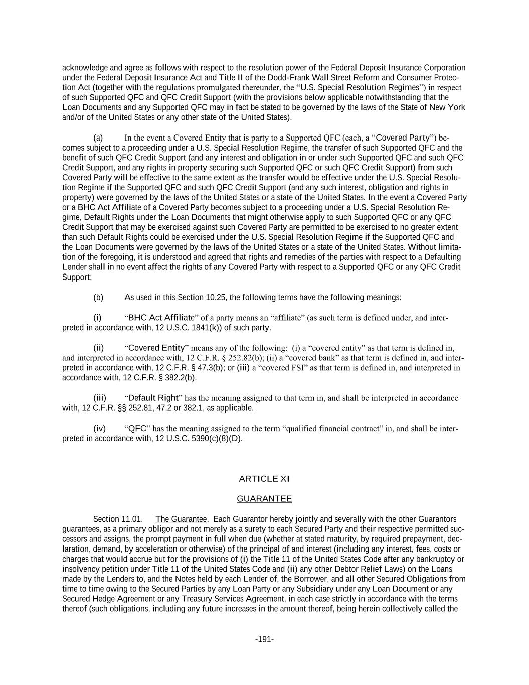 -191- acknowledge and agree as follows with respect to the resolution power of the Federal Deposit Insurance Corporation under the Federal Deposit Insurance Act and Title II of the Dodd-Frank Wall Street Reform and Consumer Protec- tion Act (together with the regulations promulgated thereunder, the “U.S. Special Resolution Regimes”) in respect of such Supported QFC and QFC Credit Support (with the provisions below applicable notwithstanding that the Loan Documents and any Supported QFC may in fact be stated to be governed by the laws of the State of New York and/or of the United States or any other state of the United States). (a) In the event a Covered Entity that is party to a Supported QFC (each, a “Covered Party”) be- comes subject to a proceeding under a U.S. Special Resolution Regime, the transfer of such Supported QFC and the benefit of such QFC Credit Support (and any interest and obligation in or under such Supported QFC and such QFC Credit Support, and any rights in property securing such Supported QFC or such QFC Credit Support) from such Covered Party will be effective to the same extent as the transfer would be effective under the U.S. Special Resolu- tion Regime if the Supported QFC and such QFC Credit Support (and any such interest, obligation and rights in property) were governed by the laws of the United States or a state of the United States. In the event a Covered Party or a BHC Act Affiliate of a Covered Party becomes subject to a proceeding under a U.S. Special Resolution Re- gime, Default Rights under the Loan Documents that might otherwise apply to such Supported QFC or any QFC Credit Support that may be exercised against such Covered Party are permitted to be exercised to no greater extent than such Default Rights could be exercised under the U.S. Special Resolution Regime if the Supported QFC and the Loan Documents were governed by the laws of the United States or a state of the United States. Without limita- tion of the foregoing, it is understood and agreed that rights and remedies of the parties with respect to a Defaulting Lender shall in no event affect the rights of any Covered Party with respect to a Supported QFC or any QFC Credit Support; (b) As used in this Section 10.25, the following terms have the following meanings: (i) “BHC Act Affiliate” of a party means an “affiliate” (as such term is defined under, and inter- preted in accordance with, 12 U.S.C. 1841(k)) of such party. (ii) “Covered Entity” means any of the following: (i) a “covered entity” as that term is defined in, and interpreted in accordance with, 12 C.F.R. § 252.82(b); (ii) a “covered bank” as that term is defined in, and inter- preted in accordance with, 12 C.F.R. § 47.3(b); or (iii) a “covered FSI” as that term is defined in, and interpreted in accordance with, 12 C.F.R. § 382.2(b). (iii) “Default Right” has the meaning assigned to that term in, and shall be interpreted in accordance with, 12 C.F.R. §§ 252.81, 47.2 or 382.1, as applicable. (iv) “QFC” has the meaning assigned to the term “qualified financial contract” in, and shall be inter- preted in accordance with, 12 U.S.C. 5390(c)(8)(D). ARTICLE XI GUARANTEE Section 11.01. The Guarantee. Each Guarantor hereby jointly and severally with the other Guarantors guarantees, as a primary obligor and not merely as a surety to each Secured Party and their respective permitted suc- cessors and assigns, the prompt payment in full when due (whether at stated maturity, by required prepayment, dec- laration, demand, by acceleration or otherwise) of the principal of and interest (including any interest, fees, costs or charges that would accrue but for the provisions of (i) the Title 11 of the United States Code after any bankruptcy or insolvency petition under Title 11 of the United States Code and (ii) any other Debtor Relief Laws) on the Loans made by the Lenders to, and the Notes held by each Lender of, the Borrower, and all other Secured Obligations from time to time owing to the Secured Parties by any Loan Party or any Subsidiary under any Loan Document or any Secured Hedge Agreement or any Treasury Services Agreement, in each case strictly in accordance with the terms thereof (such obligations, including any future increases in the amount thereof, being herein collectively called the