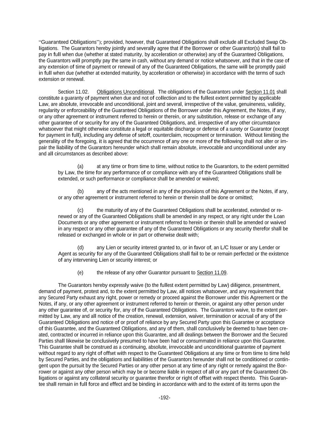-192- “Guaranteed Obligations”); provided, however, that Guaranteed Obligations shall exclude all Excluded Swap Ob- ligations. The Guarantors hereby jointly and severally agree that if the Borrower or other Guarantor(s) shall fail to pay in full when due (whether at stated maturity, by acceleration or otherwise) any of the Guaranteed Obligations, the Guarantors will promptly pay the same in cash, without any demand or notice whatsoever, and that in the case of any extension of time of payment or renewal of any of the Guaranteed Obligations, the same will be promptly paid in full when due (whether at extended maturity, by acceleration or otherwise) in accordance with the terms of such extension or renewal. Section 11.02. Obligations Unconditional. The obligations of the Guarantors under Section 11.01 shall constitute a guaranty of payment when due and not of collection and to the fullest extent permitted by applicable Law, are absolute, irrevocable and unconditional, joint and several, irrespective of the value, genuineness, validity, regularity or enforceability of the Guaranteed Obligations of the Borrower under this Agreement, the Notes, if any, or any other agreement or instrument referred to herein or therein, or any substitution, release or exchange of any other guarantee of or security for any of the Guaranteed Obligations, and, irrespective of any other circumstance whatsoever that might otherwise constitute a legal or equitable discharge or defense of a surety or Guarantor (except for payment in full), including any defense of setoff, counterclaim, recoupment or termination. Without limiting the generality of the foregoing, it is agreed that the occurrence of any one or more of the following shall not alter or im- pair the liability of the Guarantors hereunder which shall remain absolute, irrevocable and unconditional under any and all circumstances as described above: (a) at any time or from time to time, without notice to the Guarantors, to the extent permitted by Law, the time for any performance of or compliance with any of the Guaranteed Obligations shall be extended, or such performance or compliance shall be amended or waived; (b) any of the acts mentioned in any of the provisions of this Agreement or the Notes, if any, or any other agreement or instrument referred to herein or therein shall be done or omitted; (c) the maturity of any of the Guaranteed Obligations shall be accelerated, extended or re- newed or any of the Guaranteed Obligations shall be amended in any respect, or any right under the Loan Documents or any other agreement or instrument referred to herein or therein shall be amended or waived in any respect or any other guarantee of any of the Guaranteed Obligations or any security therefor shall be released or exchanged in whole or in part or otherwise dealt with; (d) any Lien or security interest granted to, or in favor of, an L/C Issuer or any Lender or Agent as security for any of the Guaranteed Obligations shall fail to be or remain perfected or the existence of any intervening Lien or security interest; or (e) the release of any other Guarantor pursuant to Section 11.09. The Guarantors hereby expressly waive (to the fullest extent permitted by Law) diligence, presentment, demand of payment, protest and, to the extent permitted by Law, all notices whatsoever, and any requirement that any Secured Party exhaust any right, power or remedy or proceed against the Borrower under this Agreement or the Notes, if any, or any other agreement or instrument referred to herein or therein, or against any other person under any other guarantee of, or security for, any of the Guaranteed Obligations. The Guarantors waive, to the extent per- mitted by Law, any and all notice of the creation, renewal, extension, waiver, termination or accrual of any of the Guaranteed Obligations and notice of or proof of reliance by any Secured Party upon this Guarantee or acceptance of this Guarantee, and the Guaranteed Obligations, and any of them, shall conclusively be deemed to have been cre- ated, contracted or incurred in reliance upon this Guarantee, and all dealings between the Borrower and the Secured Parties shall likewise be conclusively presumed to have been had or consummated in reliance upon this Guarantee. This Guarantee shall be construed as a continuing, absolute, irrevocable and unconditional guarantee of payment without regard to any right of offset with respect to the Guaranteed Obligations at any time or from time to time held by Secured Parties, and the obligations and liabilities of the Guarantors hereunder shall not be conditioned or contin- gent upon the pursuit by the Secured Parties or any other person at any time of any right or remedy against the Bor- rower or against any other person which may be or become liable in respect of all or any part of the Guaranteed Ob- ligations or against any collateral security or guarantee therefor or right of offset with respect thereto. This Guaran- tee shall remain in full force and effect and be binding in accordance with and to the extent of its terms upon the