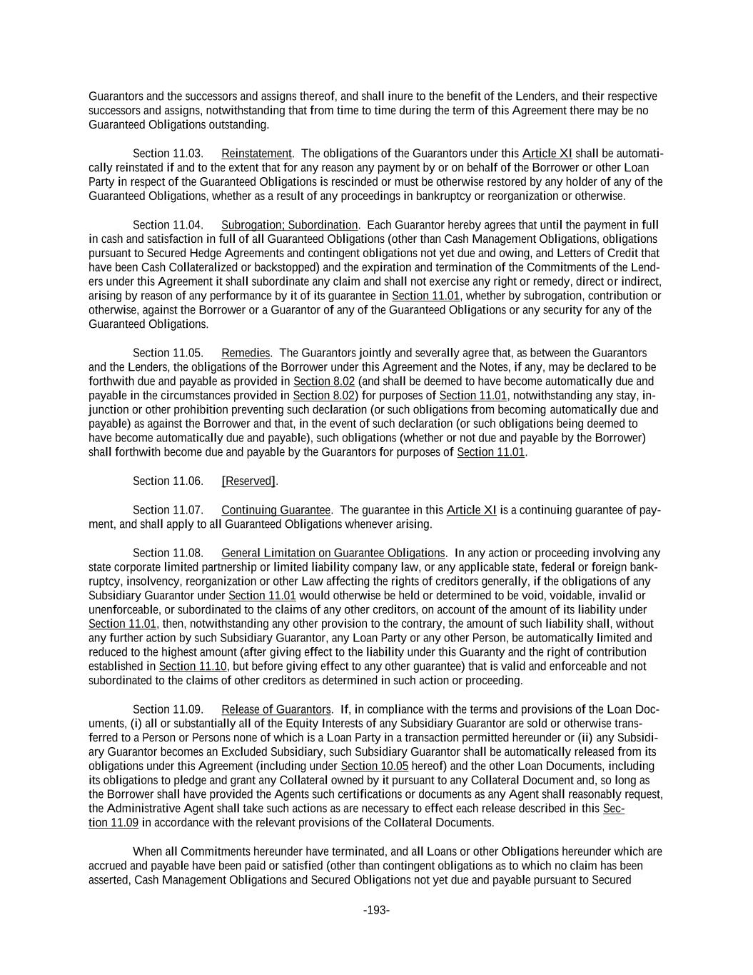 -193- Guarantors and the successors and assigns thereof, and shall inure to the benefit of the Lenders, and their respective successors and assigns, notwithstanding that from time to time during the term of this Agreement there may be no Guaranteed Obligations outstanding. Section 11.03. Reinstatement. The obligations of the Guarantors under this Article XI shall be automati- cally reinstated if and to the extent that for any reason any payment by or on behalf of the Borrower or other Loan Party in respect of the Guaranteed Obligations is rescinded or must be otherwise restored by any holder of any of the Guaranteed Obligations, whether as a result of any proceedings in bankruptcy or reorganization or otherwise. Section 11.04. Subrogation; Subordination. Each Guarantor hereby agrees that until the payment in full in cash and satisfaction in full of all Guaranteed Obligations (other than Cash Management Obligations, obligations pursuant to Secured Hedge Agreements and contingent obligations not yet due and owing, and Letters of Credit that have been Cash Collateralized or backstopped) and the expiration and termination of the Commitments of the Lend- ers under this Agreement it shall subordinate any claim and shall not exercise any right or remedy, direct or indirect, arising by reason of any performance by it of its guarantee in Section 11.01, whether by subrogation, contribution or otherwise, against the Borrower or a Guarantor of any of the Guaranteed Obligations or any security for any of the Guaranteed Obligations. Section 11.05. Remedies. The Guarantors jointly and severally agree that, as between the Guarantors and the Lenders, the obligations of the Borrower under this Agreement and the Notes, if any, may be declared to be forthwith due and payable as provided in Section 8.02 (and shall be deemed to have become automatically due and payable in the circumstances provided in Section 8.02) for purposes of Section 11.01, notwithstanding any stay, in- junction or other prohibition preventing such declaration (or such obligations from becoming automatically due and payable) as against the Borrower and that, in the event of such declaration (or such obligations being deemed to have become automatically due and payable), such obligations (whether or not due and payable by the Borrower) shall forthwith become due and payable by the Guarantors for purposes of Section 11.01. Section 11.06. [Reserved]. Section 11.07. Continuing Guarantee. The guarantee in this Article XI is a continuing guarantee of pay- ment, and shall apply to all Guaranteed Obligations whenever arising. Section 11.08. General Limitation on Guarantee Obligations. In any action or proceeding involving any state corporate limited partnership or limited liability company law, or any applicable state, federal or foreign bank- ruptcy, insolvency, reorganization or other Law affecting the rights of creditors generally, if the obligations of any Subsidiary Guarantor under Section 11.01 would otherwise be held or determined to be void, voidable, invalid or unenforceable, or subordinated to the claims of any other creditors, on account of the amount of its liability under Section 11.01, then, notwithstanding any other provision to the contrary, the amount of such liability shall, without any further action by such Subsidiary Guarantor, any Loan Party or any other Person, be automatically limited and reduced to the highest amount (after giving effect to the liability under this Guaranty and the right of contribution established in Section 11.10, but before giving effect to any other guarantee) that is valid and enforceable and not subordinated to the claims of other creditors as determined in such action or proceeding. Section 11.09. Release of Guarantors. If, in compliance with the terms and provisions of the Loan Doc- uments, (i) all or substantially all of the Equity Interests of any Subsidiary Guarantor are sold or otherwise trans- ferred to a Person or Persons none of which is a Loan Party in a transaction permitted hereunder or (ii) any Subsidi- ary Guarantor becomes an Excluded Subsidiary, such Subsidiary Guarantor shall be automatically released from its obligations under this Agreement (including under Section 10.05 hereof) and the other Loan Documents, including its obligations to pledge and grant any Collateral owned by it pursuant to any Collateral Document and, so long as the Borrower shall have provided the Agents such certifications or documents as any Agent shall reasonably request, the Administrative Agent shall take such actions as are necessary to effect each release described in this Sec- tion 11.09 in accordance with the relevant provisions of the Collateral Documents. When all Commitments hereunder have terminated, and all Loans or other Obligations hereunder which are accrued and payable have been paid or satisfied (other than contingent obligations as to which no claim has been asserted, Cash Management Obligations and Secured Obligations not yet due and payable pursuant to Secured
