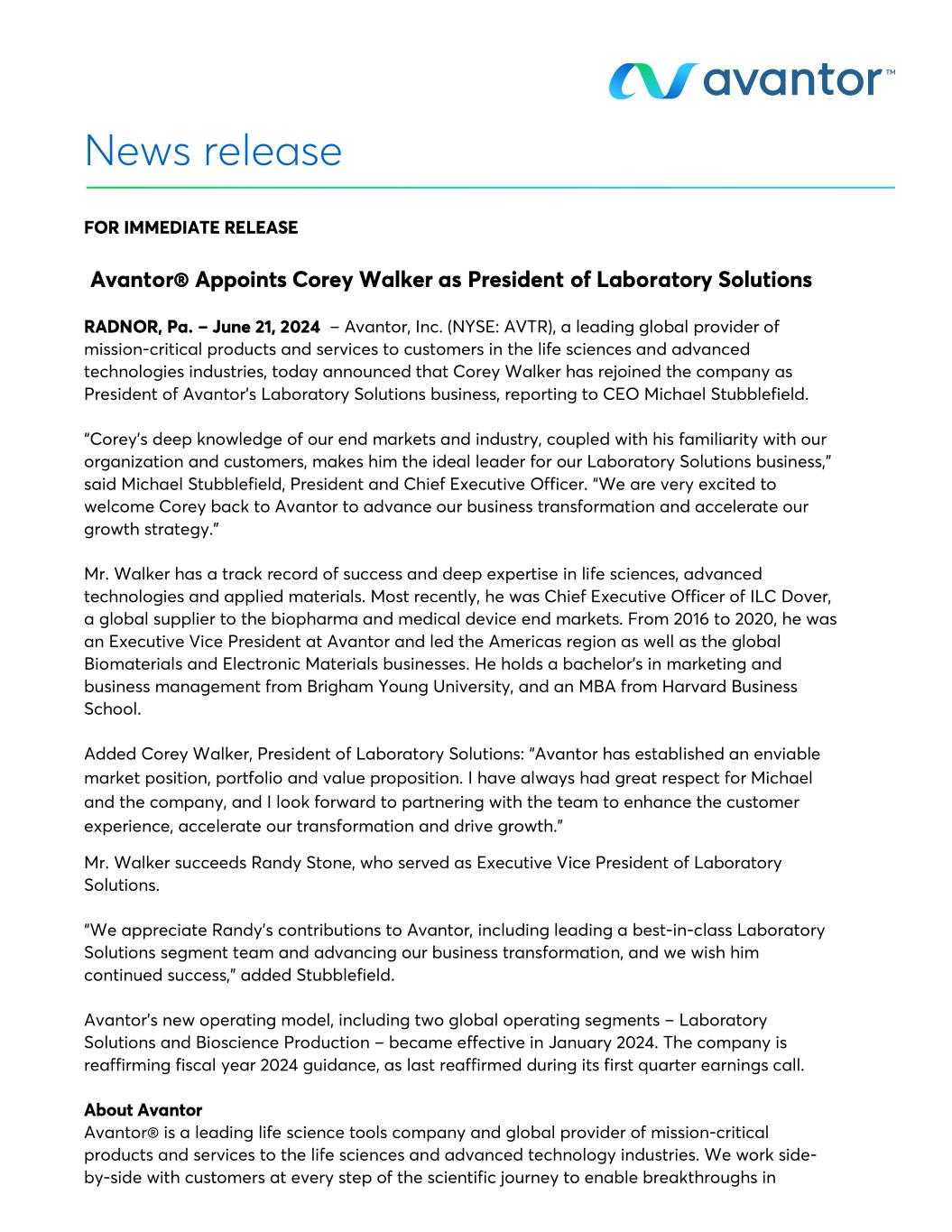 News release FOR IMMEDIATE RELEASE Avantor® Appoints Corey Walker as President of Laboratory Solutions RADNOR, Pa. – June 21, 2024 – Avantor, Inc. (NYSE: AVTR), a leading global provider of mission-critical products and services to customers in the life sciences and advanced technologies industries, today announced that Corey Walker has rejoined the company as President of Avantor’s Laboratory Solutions business, reporting to CEO Michael Stubblefield. “Corey’s deep knowledge of our end markets and industry, coupled with his familiarity with our organization and customers, makes him the ideal leader for our Laboratory Solutions business,” said Michael Stubblefield, President and Chief Executive Officer. “We are very excited to welcome Corey back to Avantor to advance our business transformation and accelerate our growth strategy.” Mr. Walker has a track record of success and deep expertise in life sciences, advanced technologies and applied materials. Most recently, he was Chief Executive Officer of ILC Dover, a global supplier to the biopharma and medical device end markets. From 2016 to 2020, he was an Executive Vice President at Avantor and led the Americas region as well as the global Biomaterials and Electronic Materials businesses. He holds a bachelor’s in marketing and business management from Brigham Young University, and an MBA from Harvard Business School. Added Corey Walker, President of Laboratory Solutions: “Avantor has established an enviable market position, portfolio and value proposition. I have always had great respect for Michael and the company, and I look forward to partnering with the team to enhance the customer experience, accelerate our transformation and drive growth.” Mr. Walker succeeds Randy Stone, who served as Executive Vice President of Laboratory Solutions. “We appreciate Randy’s contributions to Avantor, including leading a best-in-class Laboratory Solutions segment team and advancing our business transformation, and we wish him continued success,” added Stubblefield. Avantor’s new operating model, including two global operating segments – Laboratory Solutions and Bioscience Production – became effective in January 2024. The company is reaffirming fiscal year 2024 guidance, as last reaffirmed during its first quarter earnings call. About Avantor Avantor® is a leading life science tools company and global provider of mission-critical products and services to the life sciences and advanced technology industries. We work side- by-side with customers at every step of the scientific journey to enable breakthroughs in