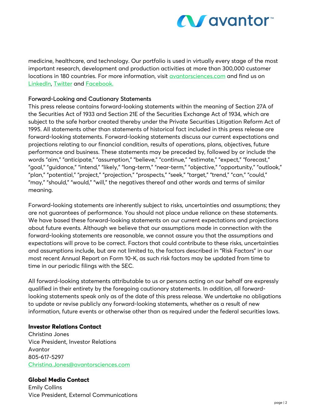 page | 2 medicine, healthcare, and technology. Our portfolio is used in virtually every stage of the most important research, development and production activities at more than 300,000 customer locations in 180 countries. For more information, visit avantorsciences.com and find us on LinkedIn, Twitter and Facebook. Forward-Looking and Cautionary Statements This press release contains forward-looking statements within the meaning of Section 27A of the Securities Act of 1933 and Section 21E of the Securities Exchange Act of 1934, which are subject to the safe harbor created thereby under the Private Securities Litigation Reform Act of 1995. All statements other than statements of historical fact included in this press release are forward-looking statements. Forward-looking statements discuss our current expectations and projections relating to our financial condition, results of operations, plans, objectives, future performance and business. These statements may be preceded by, followed by or include the words “aim,” “anticipate,” “assumption,” “believe,” “continue,” “estimate,” “expect,” “forecast,” “goal,” “guidance,” “intend,” “likely,” “long-term,” “near-term,” “objective,” “opportunity,” “outlook,” “plan,” “potential,” “project,” “projection,” “prospects,” “seek,” “target,” “trend,” “can,” “could,” “may,” “should,” “would,” “will,” the negatives thereof and other words and terms of similar meaning. Forward-looking statements are inherently subject to risks, uncertainties and assumptions; they are not guarantees of performance. You should not place undue reliance on these statements. We have based these forward-looking statements on our current expectations and projections about future events. Although we believe that our assumptions made in connection with the forward-looking statements are reasonable, we cannot assure you that the assumptions and expectations will prove to be correct. Factors that could contribute to these risks, uncertainties and assumptions include, but are not limited to, the factors described in “Risk Factors” in our most recent Annual Report on Form 10-K, as such risk factors may be updated from time to time in our periodic filings with the SEC. All forward-looking statements attributable to us or persons acting on our behalf are expressly qualified in their entirety by the foregoing cautionary statements. In addition, all forward- looking statements speak only as of the date of this press release. We undertake no obligations to update or revise publicly any forward-looking statements, whether as a result of new information, future events or otherwise other than as required under the federal securities laws. Investor Relations Contact Christina Jones Vice President, Investor Relations Avantor 805-617-5297 Christina.Jones@avantorsciences.com Global Media Contact Emily Collins Vice President, External Communications