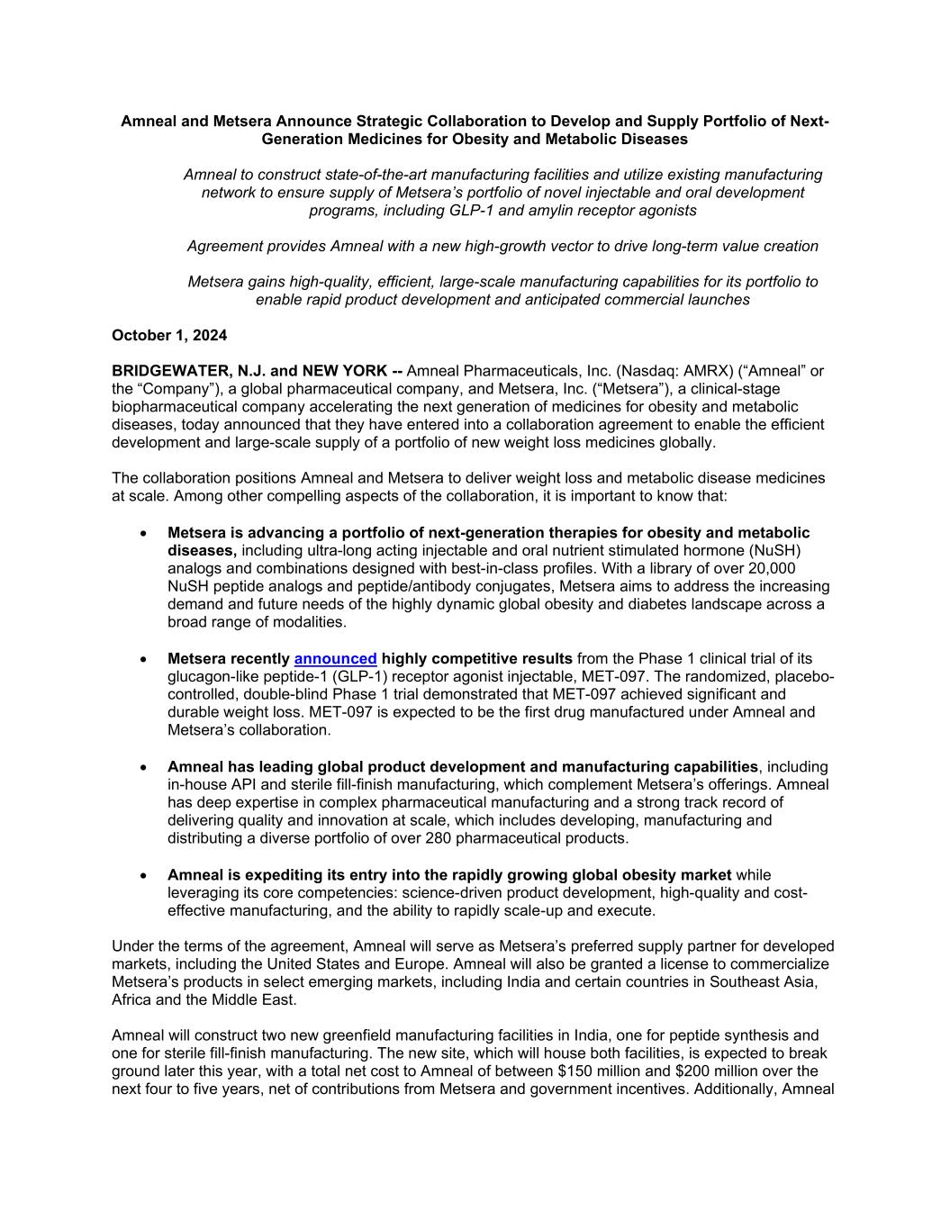 Amneal and Metsera Announce Strategic Collaboration to Develop and Supply Portfolio of Next- Generation Medicines for Obesity and Metabolic Diseases Amneal to construct state-of-the-art manufacturing facilities and utilize existing manufacturing network to ensure supply of Metsera’s portfolio of novel injectable and oral development programs, including GLP-1 and amylin receptor agonists Agreement provides Amneal with a new high-growth vector to drive long-term value creation Metsera gains high-quality, efficient, large-scale manufacturing capabilities for its portfolio to enable rapid product development and anticipated commercial launches October 1, 2024 BRIDGEWATER, N.J. and NEW YORK -- Amneal Pharmaceuticals, Inc. (Nasdaq: AMRX) (“Amneal” or the “Company”), a global pharmaceutical company, and Metsera, Inc. (“Metsera”), a clinical-stage biopharmaceutical company accelerating the next generation of medicines for obesity and metabolic diseases, today announced that they have entered into a collaboration agreement to enable the efficient development and large-scale supply of a portfolio of new weight loss medicines globally. The collaboration positions Amneal and Metsera to deliver weight loss and metabolic disease medicines at scale. Among other compelling aspects of the collaboration, it is important to know that: • Metsera is advancing a portfolio of next-generation therapies for obesity and metabolic diseases, including ultra-long acting injectable and oral nutrient stimulated hormone (NuSH) analogs and combinations designed with best-in-class profiles. With a library of over 20,000 NuSH peptide analogs and peptide/antibody conjugates, Metsera aims to address the increasing demand and future needs of the highly dynamic global obesity and diabetes landscape across a broad range of modalities. • Metsera recently announced highly competitive results from the Phase 1 clinical trial of its glucagon-like peptide-1 (GLP-1) receptor agonist injectable, MET-097. The randomized, placebo- controlled, double-blind Phase 1 trial demonstrated that MET-097 achieved significant and durable weight loss. MET-097 is expected to be the first drug manufactured under Amneal and Metsera’s collaboration. • Amneal has leading global product development and manufacturing capabilities, including in-house API and sterile fill-finish manufacturing, which complement Metsera’s offerings. Amneal has deep expertise in complex pharmaceutical manufacturing and a strong track record of delivering quality and innovation at scale, which includes developing, manufacturing and distributing a diverse portfolio of over 280 pharmaceutical products. • Amneal is expediting its entry into the rapidly growing global obesity market while leveraging its core competencies: science-driven product development, high-quality and cost- effective manufacturing, and the ability to rapidly scale-up and execute. Under the terms of the agreement, Amneal will serve as Metsera’s preferred supply partner for developed markets, including the United States and Europe. Amneal will also be granted a license to commercialize Metsera’s products in select emerging markets, including India and certain countries in Southeast Asia, Africa and the Middle East. Amneal will construct two new greenfield manufacturing facilities in India, one for peptide synthesis and one for sterile fill-finish manufacturing. The new site, which will house both facilities, is expected to break ground later this year, with a total net cost to Amneal of between $150 million and $200 million over the next four to five years, net of contributions from Metsera and government incentives. Additionally, Amneal