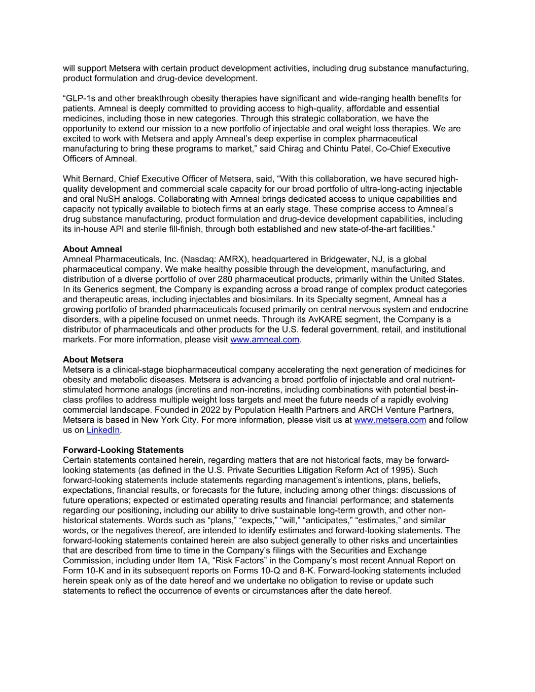 will support Metsera with certain product development activities, including drug substance manufacturing, product formulation and drug-device development. “GLP-1s and other breakthrough obesity therapies have significant and wide-ranging health benefits for patients. Amneal is deeply committed to providing access to high-quality, affordable and essential medicines, including those in new categories. Through this strategic collaboration, we have the opportunity to extend our mission to a new portfolio of injectable and oral weight loss therapies. We are excited to work with Metsera and apply Amneal’s deep expertise in complex pharmaceutical manufacturing to bring these programs to market,” said Chirag and Chintu Patel, Co-Chief Executive Officers of Amneal. Whit Bernard, Chief Executive Officer of Metsera, said, “With this collaboration, we have secured high- quality development and commercial scale capacity for our broad portfolio of ultra-long-acting injectable and oral NuSH analogs. Collaborating with Amneal brings dedicated access to unique capabilities and capacity not typically available to biotech firms at an early stage. These comprise access to Amneal’s drug substance manufacturing, product formulation and drug-device development capabilities, including its in-house API and sterile fill-finish, through both established and new state-of-the-art facilities.” About Amneal Amneal Pharmaceuticals, Inc. (Nasdaq: AMRX), headquartered in Bridgewater, NJ, is a global pharmaceutical company. We make healthy possible through the development, manufacturing, and distribution of a diverse portfolio of over 280 pharmaceutical products, primarily within the United States. In its Generics segment, the Company is expanding across a broad range of complex product categories and therapeutic areas, including injectables and biosimilars. In its Specialty segment, Amneal has a growing portfolio of branded pharmaceuticals focused primarily on central nervous system and endocrine disorders, with a pipeline focused on unmet needs. Through its AvKARE segment, the Company is a distributor of pharmaceuticals and other products for the U.S. federal government, retail, and institutional markets. For more information, please visit www.amneal.com. About Metsera Metsera is a clinical-stage biopharmaceutical company accelerating the next generation of medicines for obesity and metabolic diseases. Metsera is advancing a broad portfolio of injectable and oral nutrient- stimulated hormone analogs (incretins and non-incretins, including combinations with potential best-in- class profiles to address multiple weight loss targets and meet the future needs of a rapidly evolving commercial landscape. Founded in 2022 by Population Health Partners and ARCH Venture Partners, Metsera is based in New York City. For more information, please visit us at www.metsera.com and follow us on LinkedIn. Forward-Looking Statements Certain statements contained herein, regarding matters that are not historical facts, may be forward- looking statements (as defined in the U.S. Private Securities Litigation Reform Act of 1995). Such forward-looking statements include statements regarding management’s intentions, plans, beliefs, expectations, financial results, or forecasts for the future, including among other things: discussions of future operations; expected or estimated operating results and financial performance; and statements regarding our positioning, including our ability to drive sustainable long-term growth, and other non- historical statements. Words such as “plans,” “expects,” “will,” “anticipates,” “estimates,” and similar words, or the negatives thereof, are intended to identify estimates and forward-looking statements. The forward-looking statements contained herein are also subject generally to other risks and uncertainties that are described from time to time in the Company’s filings with the Securities and Exchange Commission, including under Item 1A, “Risk Factors” in the Company’s most recent Annual Report on Form 10-K and in its subsequent reports on Forms 10-Q and 8-K. Forward-looking statements included herein speak only as of the date hereof and we undertake no obligation to revise or update such statements to reflect the occurrence of events or circumstances after the date hereof.