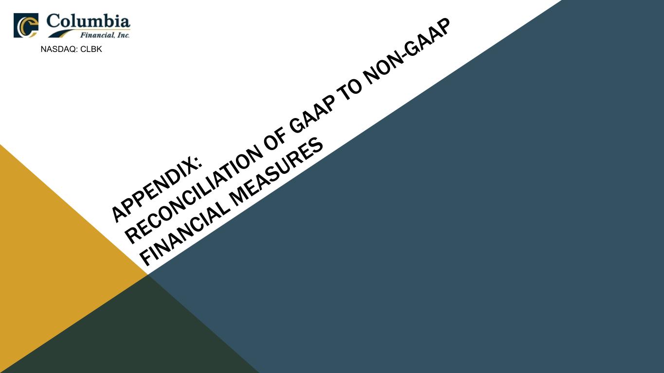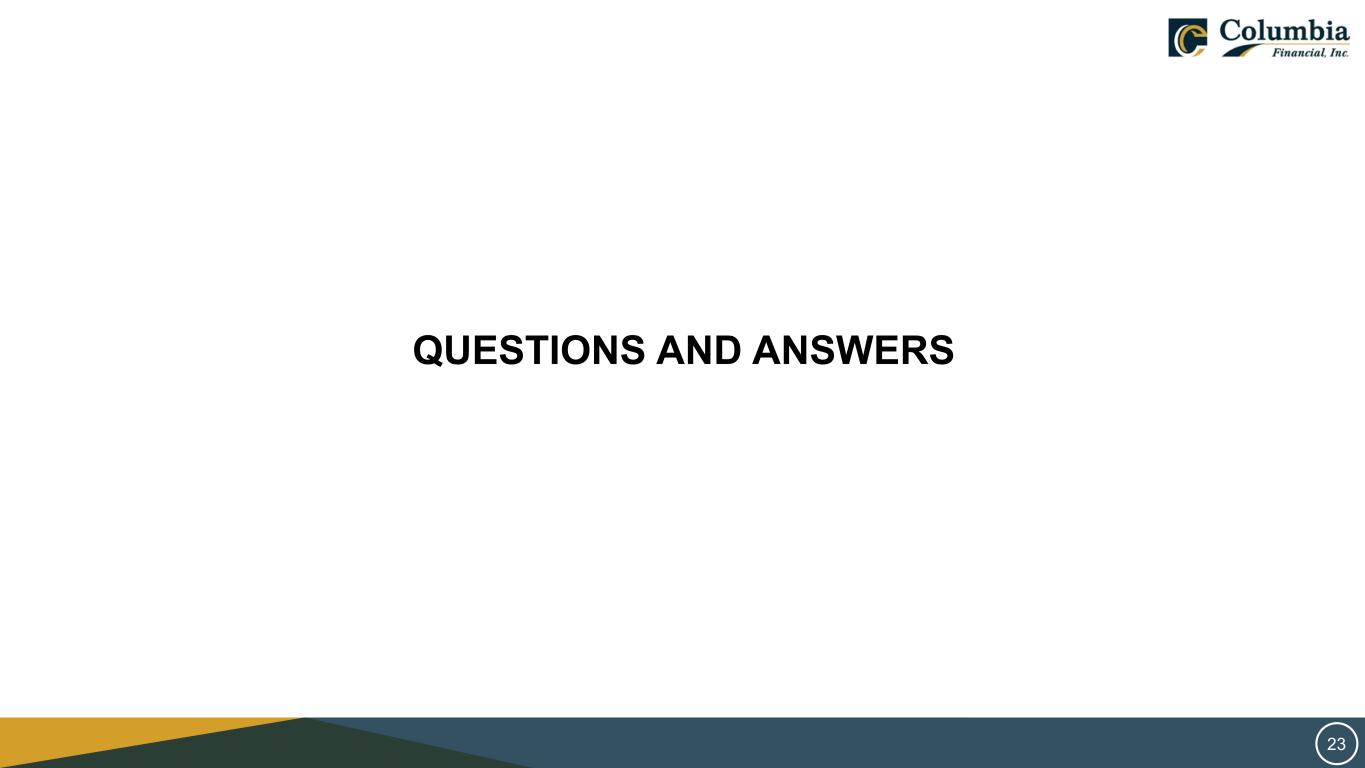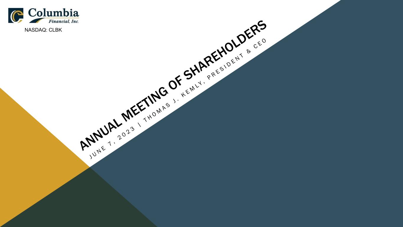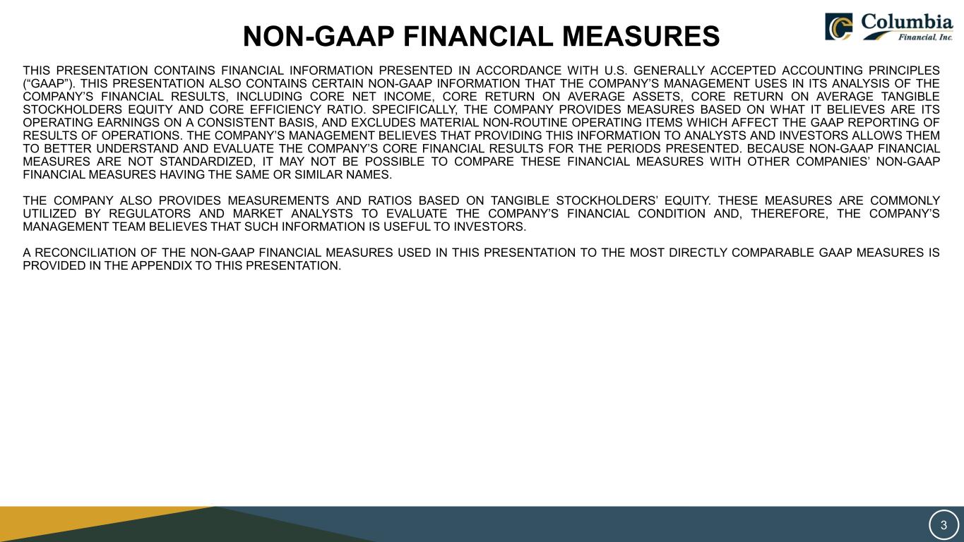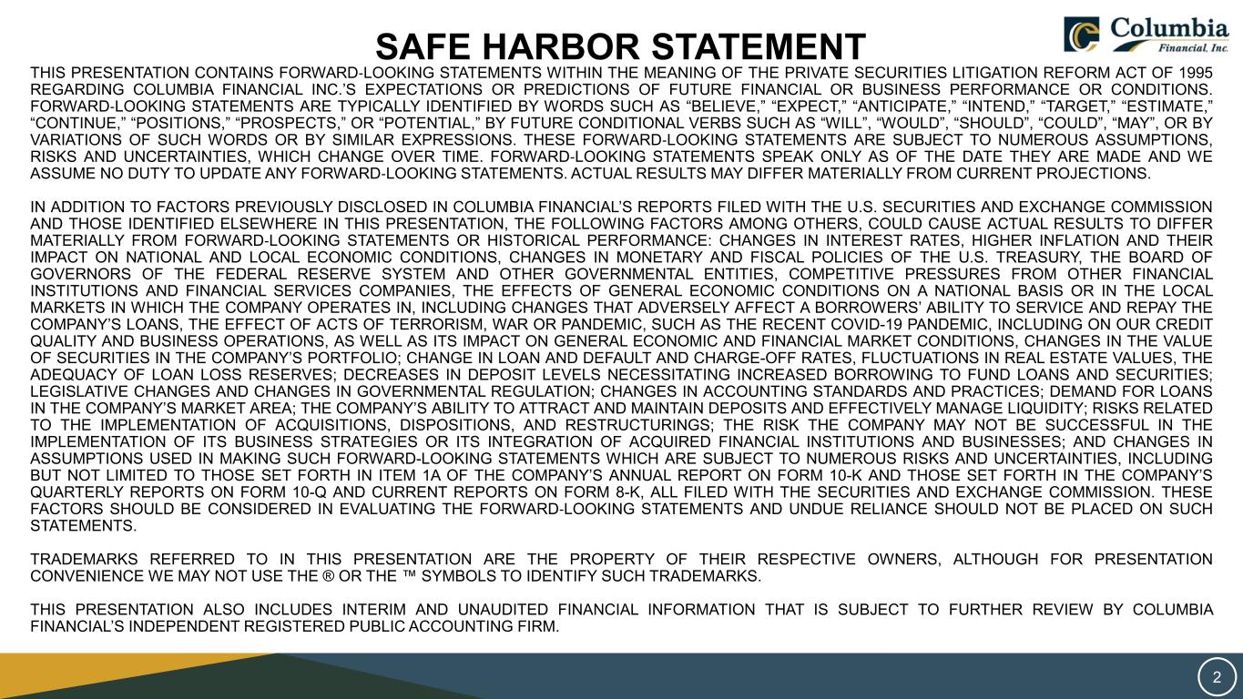 SAFE HARBOR STATEMENT THIS PRESENTATION CONTAINS FORWARD‐LOOKING STATEMENTS WITHIN THE MEANING OF THE PRIVATE SECURITIES LITIGATION REFORM ACT OF 1995 REGARDING COLUMBIA FINANCIAL INC.’S EXPECTATIONS OR PREDICTIONS OF FUTURE FINANCIAL OR BUSINESS PERFORMANCE OR CONDITIONS. FORWARD‐LOOKING STATEMENTS ARE TYPICALLY IDENTIFIED BY WORDS SUCH AS “BELIEVE,” “EXPECT,” “ANTICIPATE,” “INTEND,” “TARGET,” “ESTIMATE,” “CONTINUE,” “POSITIONS,” “PROSPECTS,” OR “POTENTIAL,” BY FUTURE CONDITIONAL VERBS SUCH AS “WILL”, “WOULD”, “SHOULD”, “COULD”, “MAY”, OR BY VARIATIONS OF SUCH WORDS OR BY SIMILAR EXPRESSIONS. THESE FORWARD‐LOOKING STATEMENTS ARE SUBJECT TO NUMEROUS ASSUMPTIONS, RISKS AND UNCERTAINTIES, WHICH CHANGE OVER TIME. FORWARD‐LOOKING STATEMENTS SPEAK ONLY AS OF THE DATE THEY ARE MADE AND WE ASSUME NO DUTY TO UPDATE ANY FORWARD‐LOOKING STATEMENTS. ACTUAL RESULTS MAY DIFFER MATERIALLY FROM CURRENT PROJECTIONS. IN ADDITION TO FACTORS PREVIOUSLY DISCLOSED IN COLUMBIA FINANCIAL’S REPORTS FILED WITH THE U.S. SECURITIES AND EXCHANGE COMMISSION AND THOSE IDENTIFIED ELSEWHERE IN THIS PRESENTATION, THE FOLLOWING FACTORS AMONG OTHERS, COULD CAUSE ACTUAL RESULTS TO DIFFER MATERIALLY FROM FORWARD‐LOOKING STATEMENTS OR HISTORICAL PERFORMANCE: CHANGES IN INTEREST RATES, HIGHER INFLATION AND THEIR IMPACT ON NATIONAL AND LOCAL ECONOMIC CONDITIONS, CHANGES IN MONETARY AND FISCAL POLICIES OF THE U.S. TREASURY, THE BOARD OF GOVERNORS OF THE FEDERAL RESERVE SYSTEM AND OTHER GOVERNMENTAL ENTITIES, COMPETITIVE PRESSURES FROM OTHER FINANCIAL INSTITUTIONS AND FINANCIAL SERVICES COMPANIES, THE EFFECTS OF GENERAL ECONOMIC CONDITIONS ON A NATIONAL BASIS OR IN THE LOCAL MARKETS IN WHICH THE COMPANY OPERATES IN, INCLUDING CHANGES THAT ADVERSELY AFFECT A BORROWERS’ ABILITY TO SERVICE AND REPAY THE COMPANY’S LOANS, THE EFFECT OF ACTS OF TERRORISM, WAR OR PANDEMIC, SUCH AS THE RECENT COVID-19 PANDEMIC, INCLUDING ON OUR CREDIT QUALITY AND BUSINESS OPERATIONS, AS WELL AS ITS IMPACT ON GENERAL ECONOMIC AND FINANCIAL MARKET CONDITIONS, CHANGES IN THE VALUE OF SECURITIES IN THE COMPANY’S PORTFOLIO; CHANGE IN LOAN AND DEFAULT AND CHARGE-OFF RATES, FLUCTUATIONS IN REAL ESTATE VALUES, THE ADEQUACY OF LOAN LOSS RESERVES; DECREASES IN DEPOSIT LEVELS NECESSITATING INCREASED BORROWING TO FUND LOANS AND SECURITIES; LEGISLATIVE CHANGES AND CHANGES IN GOVERNMENTAL REGULATION; CHANGES IN ACCOUNTING STANDARDS AND PRACTICES; DEMAND FOR LOANS IN THE COMPANY’S MARKET AREA; THE COMPANY’S ABILITY TO ATTRACT AND MAINTAIN DEPOSITS AND EFFECTIVELY MANAGE LIQUIDITY; RISKS RELATED TO THE IMPLEMENTATION OF ACQUISITIONS, DISPOSITIONS, AND RESTRUCTURINGS; THE RISK THE COMPANY MAY NOT BE SUCCESSFUL IN THE IMPLEMENTATION OF ITS BUSINESS STRATEGIES OR ITS INTEGRATION OF ACQUIRED FINANCIAL INSTITUTIONS AND BUSINESSES; AND CHANGES IN ASSUMPTIONS USED IN MAKING SUCH FORWARD-LOOKING STATEMENTS WHICH ARE SUBJECT TO NUMEROUS RISKS AND UNCERTAINTIES, INCLUDING BUT NOT LIMITED TO THOSE SET FORTH IN ITEM 1A OF THE COMPANY’S ANNUAL REPORT ON FORM 10-K AND THOSE SET FORTH IN THE COMPANY’S QUARTERLY REPORTS ON FORM 10-Q AND CURRENT REPORTS ON FORM 8-K, ALL FILED WITH THE SECURITIES AND EXCHANGE COMMISSION. THESE FACTORS SHOULD BE CONSIDERED IN EVALUATING THE FORWARD‐LOOKING STATEMENTS AND UNDUE RELIANCE SHOULD NOT BE PLACED ON SUCH STATEMENTS. TRADEMARKS REFERRED TO IN THIS PRESENTATION ARE THE PROPERTY OF THEIR RESPECTIVE OWNERS, ALTHOUGH FOR PRESENTATION CONVENIENCE WE MAY NOT USE THE ® OR THE ™ SYMBOLS TO IDENTIFY SUCH TRADEMARKS. THIS PRESENTATION ALSO INCLUDES INTERIM AND UNAUDITED FINANCIAL INFORMATION THAT IS SUBJECT TO FURTHER REVIEW BY COLUMBIA FINANCIAL’S INDEPENDENT REGISTERED PUBLIC ACCOUNTING FIRM. 2