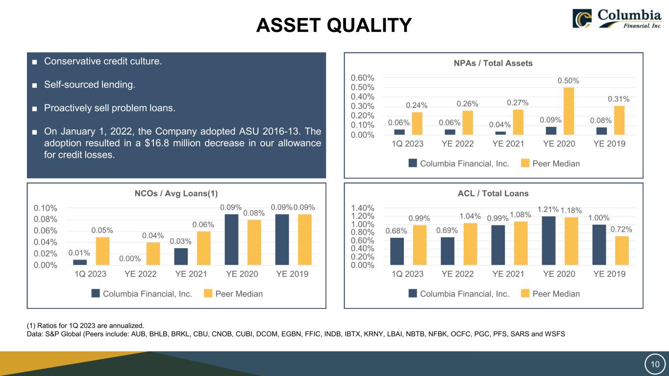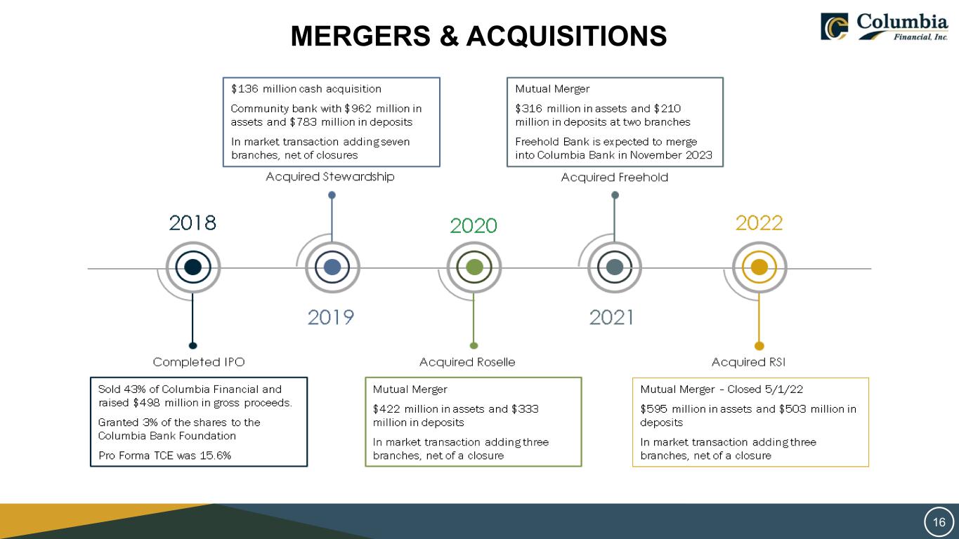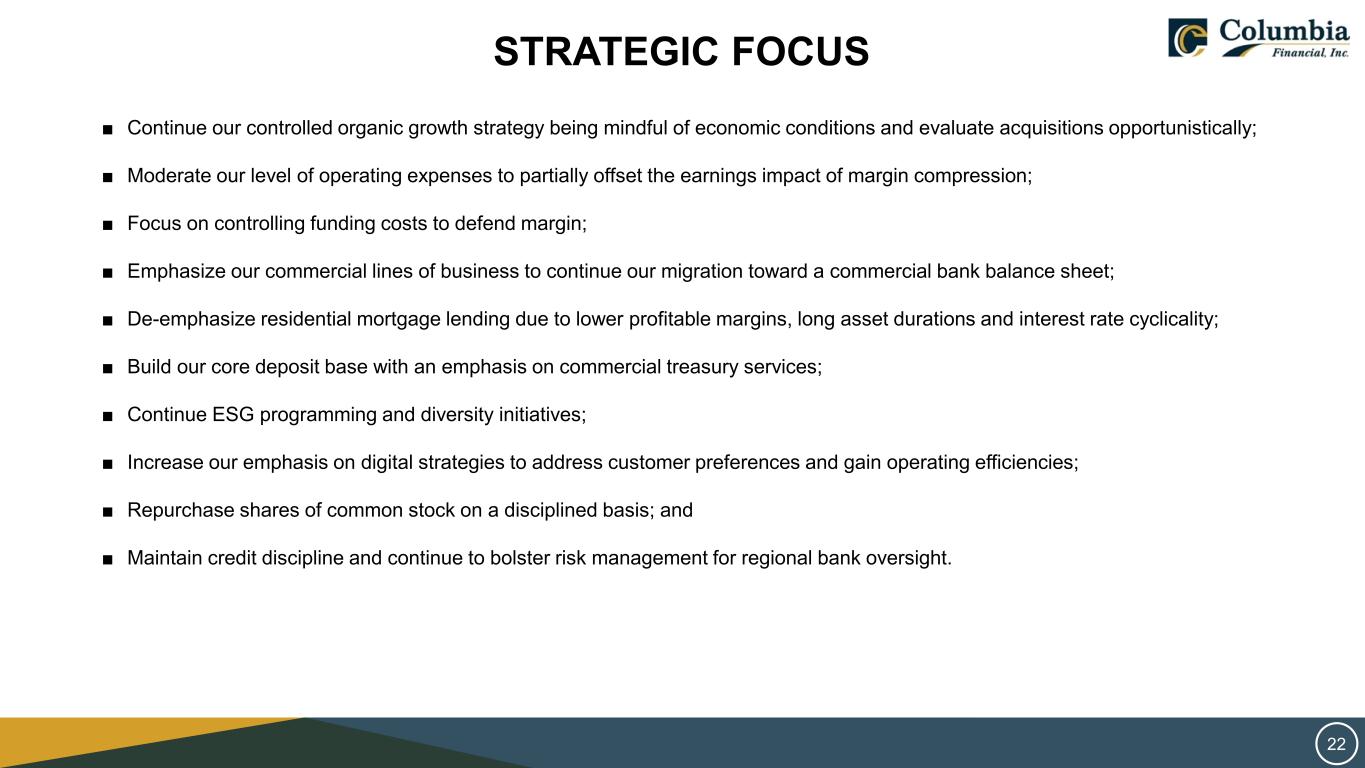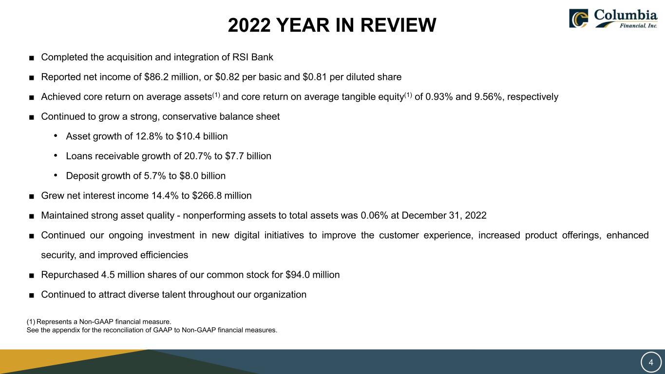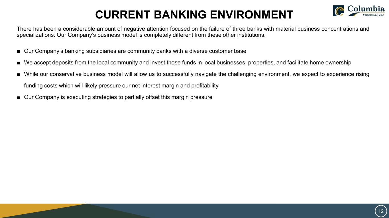 SAFE HARBOR STATEMENT THIS PRESENTATION CONTAINS FORWARD‐LOOKING STATEMENTS WITHIN THE MEANING OF THE PRIVATE SECURITIES LITIGATION REFORM ACT OF 1995 REGARDING COLUMBIA FINANCIAL INC.’S EXPECTATIONS OR PREDICTIONS OF FUTURE FINANCIAL OR BUSINESS PERFORMANCE OR CONDITIONS. FORWARD‐LOOKING STATEMENTS ARE TYPICALLY IDENTIFIED BY WORDS SUCH AS “BELIEVE,” “EXPECT,” “ANTICIPATE,” “INTEND,” “TARGET,” “ESTIMATE,” “CONTINUE,” “POSITIONS,” “PROSPECTS,” OR “POTENTIAL,” BY FUTURE CONDITIONAL VERBS SUCH AS “WILL”, “WOULD”, “SHOULD”, “COULD”, “MAY”, OR BY VARIATIONS OF SUCH WORDS OR BY SIMILAR EXPRESSIONS. THESE FORWARD‐LOOKING STATEMENTS ARE SUBJECT TO NUMEROUS ASSUMPTIONS, RISKS AND UNCERTAINTIES, WHICH CHANGE OVER TIME. FORWARD‐LOOKING STATEMENTS SPEAK ONLY AS OF THE DATE THEY ARE MADE AND WE ASSUME NO DUTY TO UPDATE ANY FORWARD‐LOOKING STATEMENTS. ACTUAL RESULTS MAY DIFFER MATERIALLY FROM CURRENT PROJECTIONS. IN ADDITION TO FACTORS PREVIOUSLY DISCLOSED IN COLUMBIA FINANCIAL’S REPORTS FILED WITH THE U.S. SECURITIES AND EXCHANGE COMMISSION AND THOSE IDENTIFIED ELSEWHERE IN THIS PRESENTATION, THE FOLLOWING FACTORS AMONG OTHERS, COULD CAUSE ACTUAL RESULTS TO DIFFER MATERIALLY FROM FORWARD‐LOOKING STATEMENTS OR HISTORICAL PERFORMANCE: CHANGES IN INTEREST RATES, HIGHER INFLATION AND THEIR IMPACT ON NATIONAL AND LOCAL ECONOMIC CONDITIONS, CHANGES IN MONETARY AND FISCAL POLICIES OF THE U.S. TREASURY, THE BOARD OF GOVERNORS OF THE FEDERAL RESERVE SYSTEM AND OTHER GOVERNMENTAL ENTITIES, COMPETITIVE PRESSURES FROM OTHER FINANCIAL INSTITUTIONS AND FINANCIAL SERVICES COMPANIES, THE EFFECTS OF GENERAL ECONOMIC CONDITIONS ON A NATIONAL BASIS OR IN THE LOCAL MARKETS IN WHICH THE COMPANY OPERATES IN, INCLUDING CHANGES THAT ADVERSELY AFFECT A BORROWERS’ ABILITY TO SERVICE AND REPAY THE COMPANY’S LOANS, THE EFFECT OF ACTS OF TERRORISM, WAR OR PANDEMIC, SUCH AS THE RECENT COVID-19 PANDEMIC, INCLUDING ON OUR CREDIT QUALITY AND BUSINESS OPERATIONS, AS WELL AS ITS IMPACT ON GENERAL ECONOMIC AND FINANCIAL MARKET CONDITIONS, CHANGES IN THE VALUE OF SECURITIES IN THE COMPANY’S PORTFOLIO; CHANGE IN LOAN AND DEFAULT AND CHARGE-OFF RATES, FLUCTUATIONS IN REAL ESTATE VALUES, THE ADEQUACY OF LOAN LOSS RESERVES; DECREASES IN DEPOSIT LEVELS NECESSITATING INCREASED BORROWING TO FUND LOANS AND SECURITIES; LEGISLATIVE CHANGES AND CHANGES IN GOVERNMENTAL REGULATION; CHANGES IN ACCOUNTING STANDARDS AND PRACTICES; DEMAND FOR LOANS IN THE COMPANY’S MARKET AREA; THE COMPANY’S ABILITY TO ATTRACT AND MAINTAIN DEPOSITS AND EFFECTIVELY MANAGE LIQUIDITY; RISKS RELATED TO THE IMPLEMENTATION OF ACQUISITIONS, DISPOSITIONS, AND RESTRUCTURINGS; THE RISK THE COMPANY MAY NOT BE SUCCESSFUL IN THE IMPLEMENTATION OF ITS BUSINESS STRATEGIES OR ITS INTEGRATION OF ACQUIRED FINANCIAL INSTITUTIONS AND BUSINESSES; AND CHANGES IN ASSUMPTIONS USED IN MAKING SUCH FORWARD-LOOKING STATEMENTS WHICH ARE SUBJECT TO NUMEROUS RISKS AND UNCERTAINTIES, INCLUDING BUT NOT LIMITED TO THOSE SET FORTH IN ITEM 1A OF THE COMPANY’S ANNUAL REPORT ON FORM 10-K AND THOSE SET FORTH IN THE COMPANY’S QUARTERLY REPORTS ON FORM 10-Q AND CURRENT REPORTS ON FORM 8-K, ALL FILED WITH THE SECURITIES AND EXCHANGE COMMISSION. THESE FACTORS SHOULD BE CONSIDERED IN EVALUATING THE FORWARD‐LOOKING STATEMENTS AND UNDUE RELIANCE SHOULD NOT BE PLACED ON SUCH STATEMENTS. TRADEMARKS REFERRED TO IN THIS PRESENTATION ARE THE PROPERTY OF THEIR RESPECTIVE OWNERS, ALTHOUGH FOR PRESENTATION CONVENIENCE WE MAY NOT USE THE ® OR THE ™ SYMBOLS TO IDENTIFY SUCH TRADEMARKS. THIS PRESENTATION ALSO INCLUDES INTERIM AND UNAUDITED FINANCIAL INFORMATION THAT IS SUBJECT TO FURTHER REVIEW BY COLUMBIA FINANCIAL’S INDEPENDENT REGISTERED PUBLIC ACCOUNTING FIRM. 2