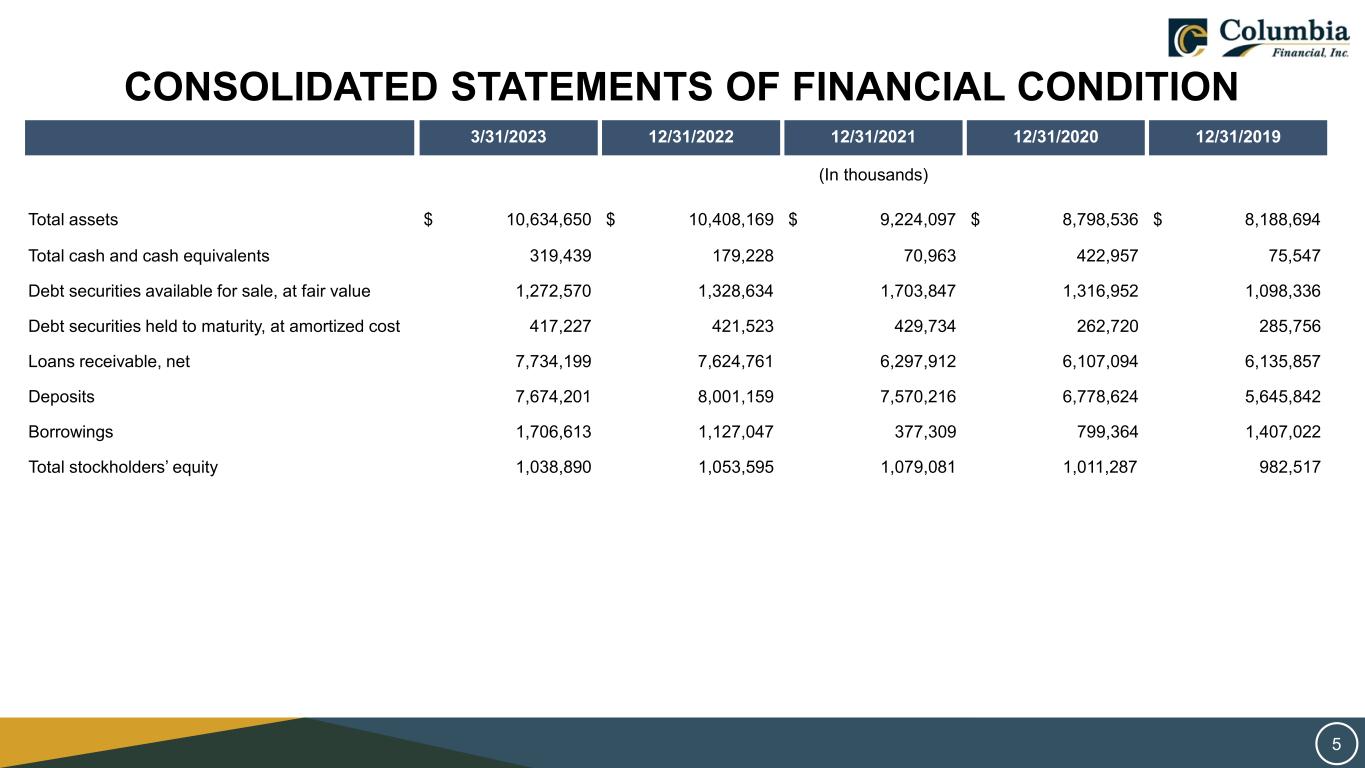 CONSOLIDATED STATEMENTS OF FINANCIAL CONDITION 3/31/2023 12/31/2022 12/31/2021 12/31/2020 12/31/2019 (In thousands) Total assets $ 10,634,650 $ 10,408,169 $ 9,224,097 $ 8,798,536 $ 8,188,694 Total cash and cash equivalents 319,439 179,228 70,963 422,957 75,547 Debt securities available for sale, at fair value 1,272,570 1,328,634 1,703,847 1,316,952 1,098,336 Debt securities held to maturity, at amortized cost 417,227 421,523 429,734 262,720 285,756 Loans receivable, net 7,734,199 7,624,761 6,297,912 6,107,094 6,135,857 Deposits 7,674,201 8,001,159 7,570,216 6,778,624 5,645,842 Borrowings 1,706,613 1,127,047 377,309 799,364 1,407,022 Total stockholders’ equity 1,038,890 1,053,595 1,079,081 1,011,287 982,517 5
