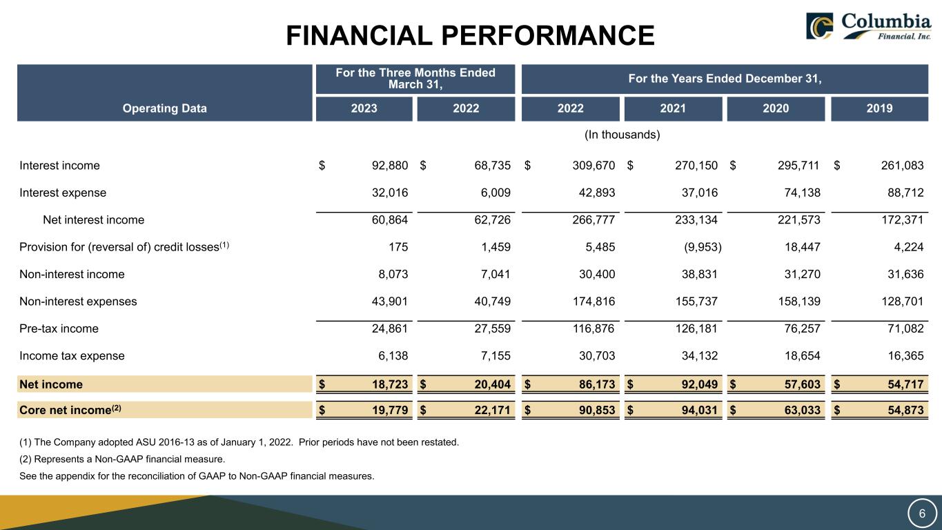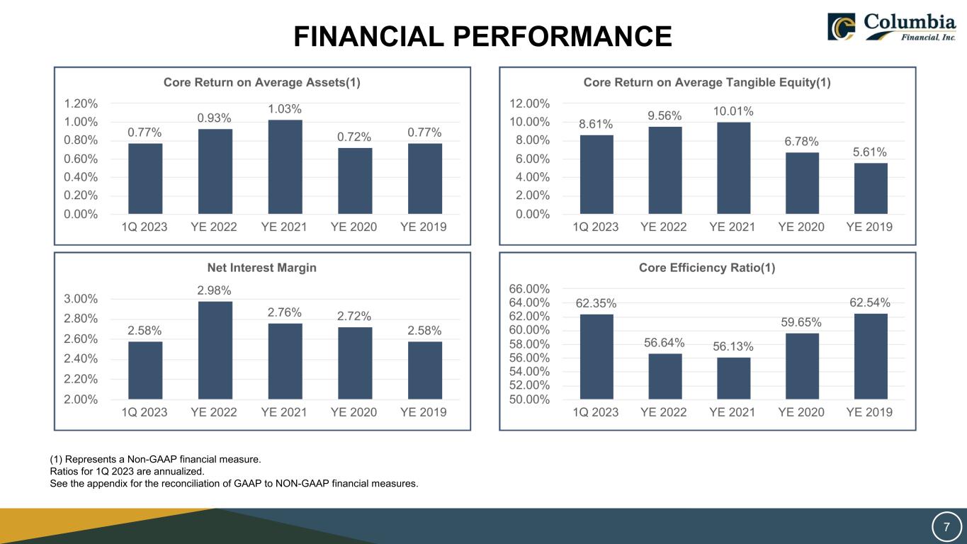 FINANCIAL PERFORMANCE For the Three Months Ended March 31, For the Years Ended December 31, Operating Data 2023 2022 2022 2021 2020 2019 (In thousands) Interest income $ 92,880 $ 68,735 $ 309,670 $ 270,150 $ 295,711 $ 261,083 Interest expense 32,016 6,009 42,893 37,016 74,138 88,712 Net interest income 60,864 62,726 266,777 233,134 221,573 172,371 Provision for (reversal of) credit losses(1) 175 1,459 5,485 (9,953) 18,447 4,224 Non-interest income 8,073 7,041 30,400 38,831 31,270 31,636 Non-interest expenses 43,901 40,749 174,816 155,737 158,139 128,701 Pre-tax income 24,861 27,559 116,876 126,181 76,257 71,082 Income tax expense 6,138 7,155 30,703 34,132 18,654 16,365 Net income $ 18,723 $ 20,404 $ 86,173 $ 92,049 $ 57,603 $ 54,717 Core net income(2) $ 19,779 $ 22,171 $ 90,853 $ 94,031 $ 63,033 $ 54,873 (1) The Company adopted ASU 2016-13 as of January 1, 2022. Prior periods have not been restated. (2) Represents a Non-GAAP financial measure. See the appendix for the reconciliation of GAAP to Non-GAAP financial measures. 6