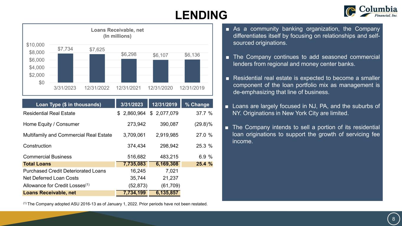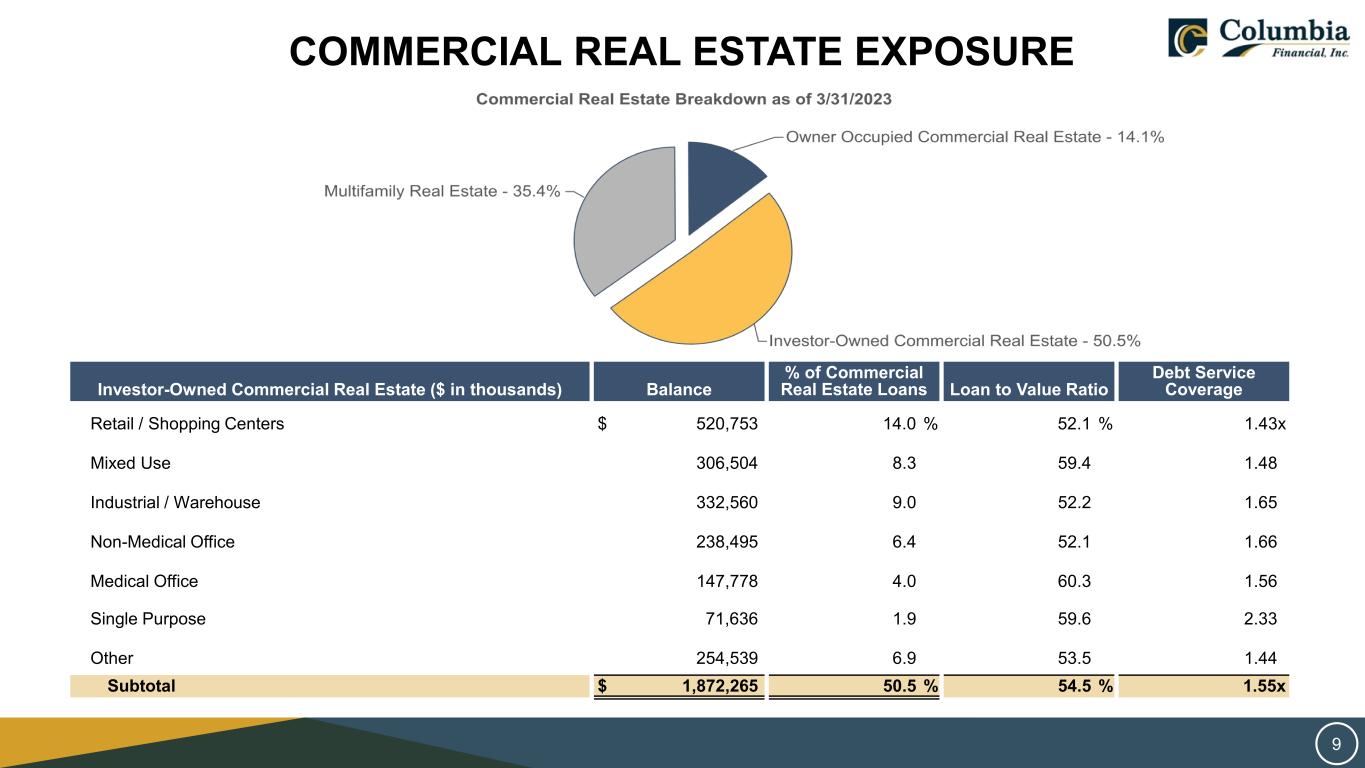 LENDING Loan Type ($ in thousands) 3/31/2023 12/31/2019 % Change Residential Real Estate $ 2,860,964 $ 2,077,079 37.7 % Home Equity / Consumer 273,942 390,087 (29.8)% Multifamily and Commercial Real Estate 3,709,061 2,919,985 27.0 % Construction 374,434 298,942 25.3 % Commercial Business 516,682 483,215 6.9 % Total Loans 7,735,083 6,169,308 25.4 % Purchased Credit Deteriorated Loans 16,245 7,021 Net Deferred Loan Costs 35,744 21,237 Allowance for Credit Losses(1) (52,873) (61,709) Loans Receivable, net 7,734,199 6,135,857 (1) The Company adopted ASU 2016-13 as of January 1, 2022. Prior periods have not been restated. ■ As a community banking organization, the Company differentiates itself by focusing on relationships and self- sourced originations. ■ The Company continues to add seasoned commercial lenders from regional and money center banks. ■ Residential real estate is expected to become a smaller component of the loan portfolio mix as management is de-emphasizing that line of business. ■ Loans are largely focused in NJ, PA, and the suburbs of NY. Originations in New York City are limited. ■ The Company intends to sell a portion of its residential loan originations to support the growth of servicing fee income. 8