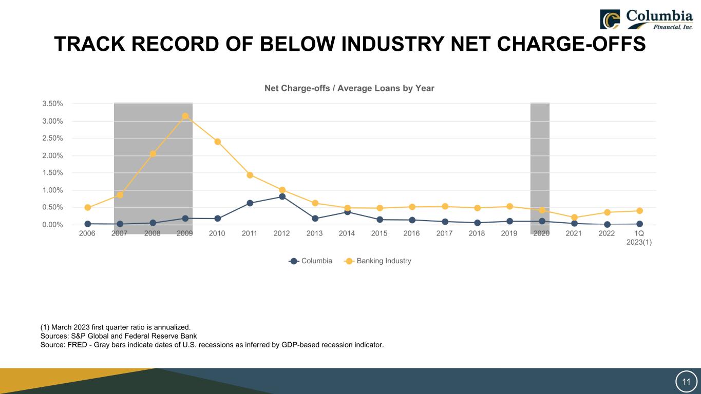 ASSET QUALITY ■ Conservative credit culture. ■ Self-sourced lending. ■ Proactively sell problem loans. ■ On January 1, 2022, the Company adopted ASU 2016-13. The adoption resulted in a $16.8 million decrease in our allowance for credit losses. (1) Ratios for 1Q 2023 are annualized. Data: S&P Global (Peers include: AUB, BHLB, BRKL, CBU, CNOB, CUBI, DCOM, EGBN, FFIC, INDB, IBTX, KRNY, LBAI, NBTB, NFBK, OCFC, PGC, PFS, SARS and WSFS 10
