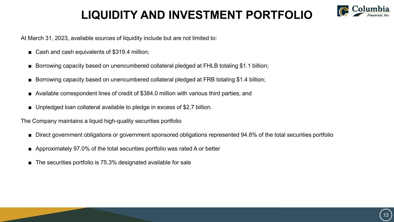 CURRENT BANKING ENVIRONMENT There has been a considerable amount of negative attention focused on the failure of three banks with material business concentrations and specializations. Our Company’s business model is completely different from these other institutions. ■ Our Company’s banking subsidiaries are community banks with a diverse customer base ■ We accept deposits from the local community and invest those funds in local businesses, properties, and facilitate home ownership ■ While our conservative business model will allow us to successfully navigate the challenging environment, we expect to experience rising funding costs which will likely pressure our net interest margin and profitability ■ Our Company is executing strategies to partially offset this margin pressure 12