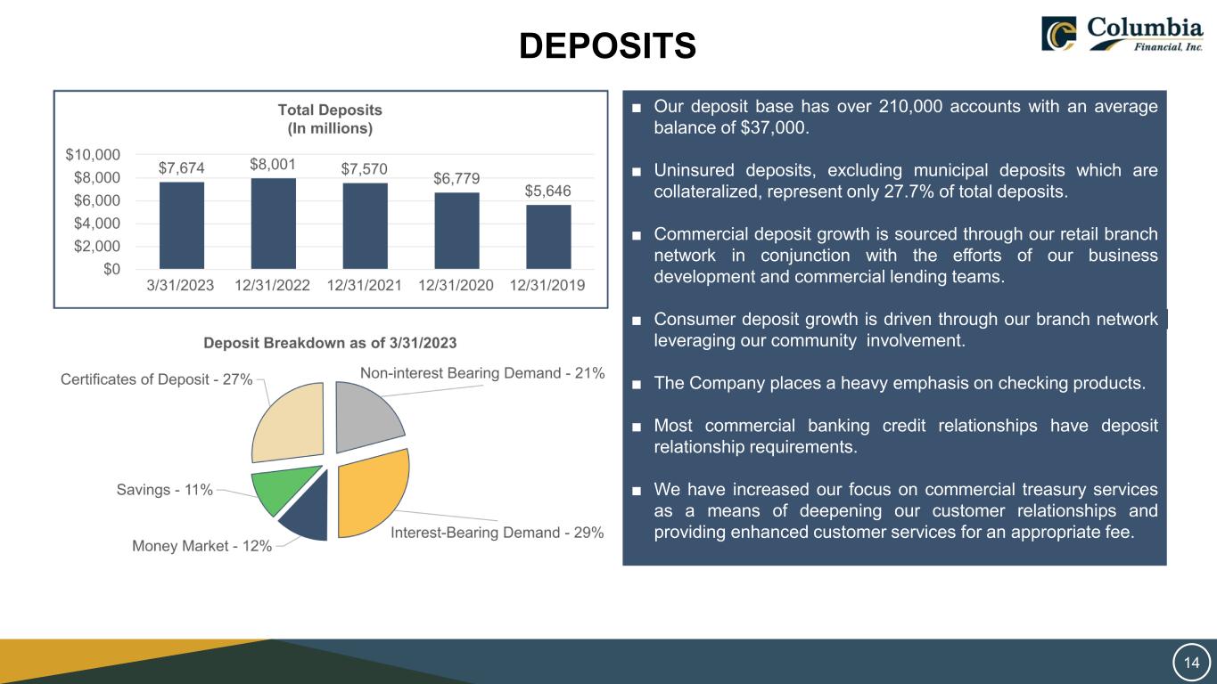 LIQUIDITY AND INVESTMENT PORTFOLIO At March 31, 2023, available sources of liquidity include but are not limited to: ■ Cash and cash equivalents of $319.4 million; ■ Borrowing capacity based on unencumbered collateral pledged at FHLB totaling $1.1 billion; ■ Borrowing capacity based on unencumbered collateral pledged at FRB totaling $1.4 billion; ■ Available correspondent lines of credit of $384.0 million with various third parties; and ■ Unpledged loan collateral available to pledge in excess of $2.7 billion. The Company maintains a liquid high-quality securities portfolio ■ Direct government obligations or government sponsored obligations represented 94.8% of the total securities portfolio ■ Approximately 97.0% of the total securities portfolio was rated A or better ■ The securities portfolio is 75.3% designated available for sale 13