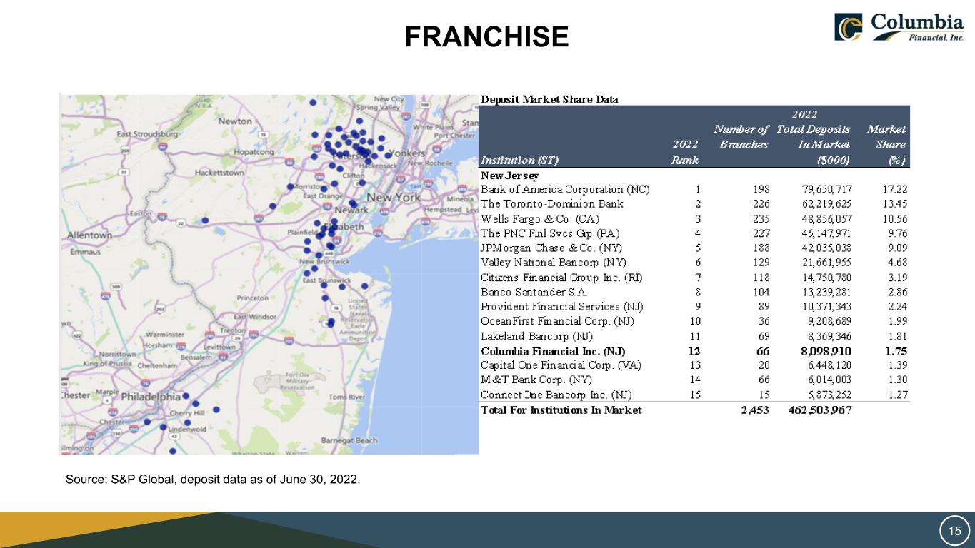 Source: S&P Global, deposit data as of June 30, 2022. FRANCHISE 15