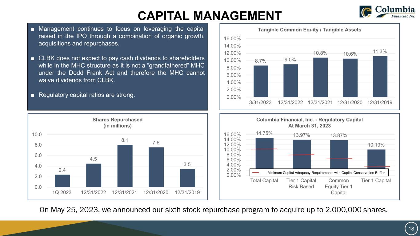 CAPITAL MANAGEMENT ■ Management continues to focus on leveraging the capital raised in the IPO through a combination of organic growth, acquisitions and repurchases. ■ CLBK does not expect to pay cash dividends to shareholders while in the MHC structure as it is not a “grandfathered” MHC under the Dodd Frank Act and therefore the MHC cannot waive dividends from CLBK. ■ Regulatory capital ratios are strong. Minimum Capital Adequacy Requirements with Capital Conservation Buffer 18 On May 25, 2023, we announced our sixth stock repurchase program to acquire up to 2,000,000 shares.