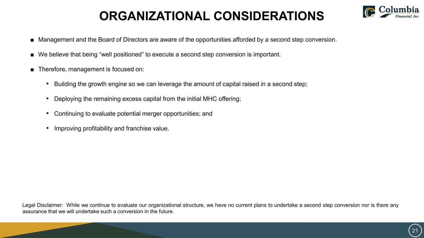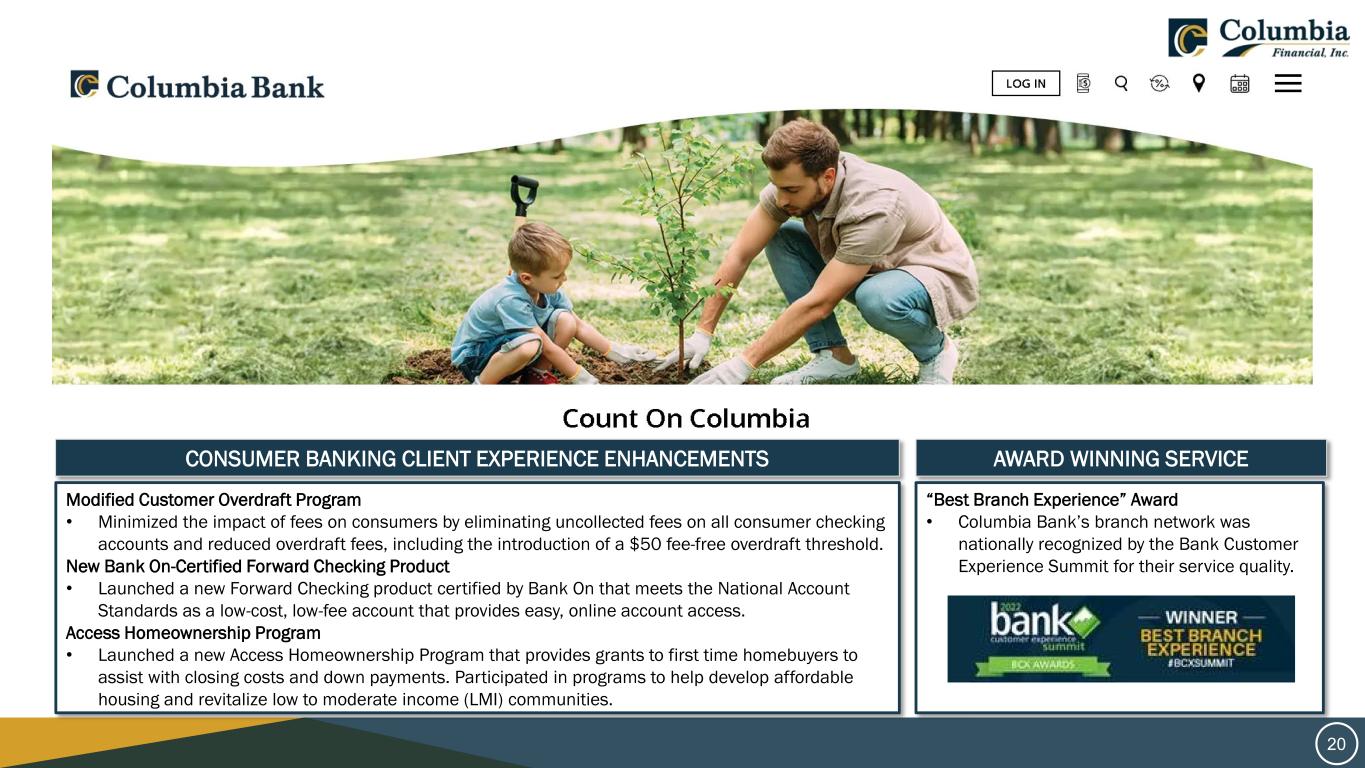 20 20 CONSUMER BANKING CLIENT EXPERIENCE ENHANCEMENTS Modified Customer Overdraft Program • Minimized the impact of fees on consumers by eliminating uncollected fees on all consumer checking accounts and reduced overdraft fees, including the introduction of a $50 fee-free overdraft threshold. New Bank On-Certified Forward Checking Product • Launched a new Forward Checking product certified by Bank On that meets the National Account Standards as a low-cost, low-fee account that provides easy, online account access. Access Homeownership Program • Launched a new Access Homeownership Program that provides grants to first time homebuyers to assist with closing costs and down payments. Participated in programs to help develop affordable housing and revitalize low to moderate income (LMI) communities. AWARD WINNING SERVICE “Best Branch Experience” Award • Columbia Bank’s branch network was nationally recognized by the Bank Customer Experience Summit for their service quality.