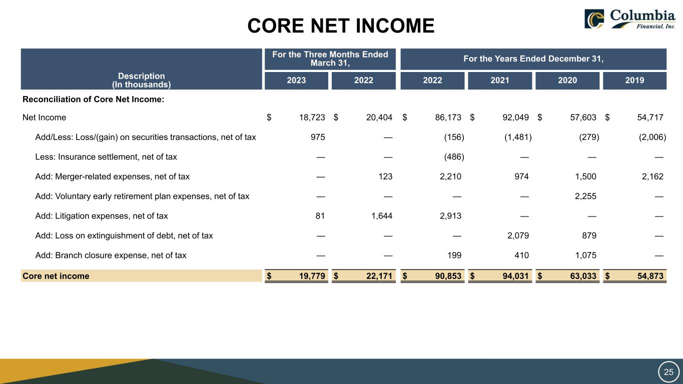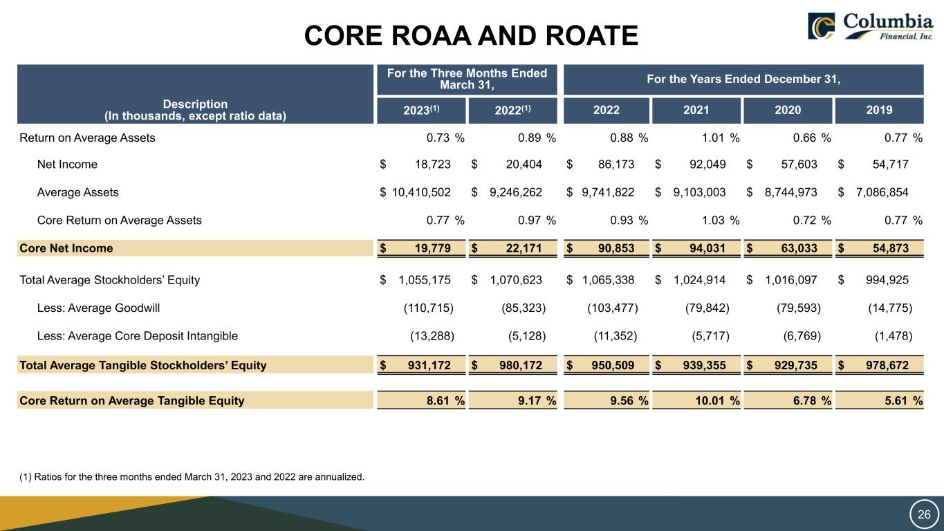 CORE NET INCOME For the Three Months Ended March 31, For the Years Ended December 31, Description (In thousands) 2023 2022 2022 2021 2020 2019 Reconciliation of Core Net Income: Net Income $ 18,723 $ 20,404 $ 86,173 $ 92,049 $ 57,603 $ 54,717 Add/Less: Loss/(gain) on securities transactions, net of tax 975 — (156) (1,481) (279) (2,006) Less: Insurance settlement, net of tax — — (486) — — — Add: Merger-related expenses, net of tax — 123 2,210 974 1,500 2,162 Add: Voluntary early retirement plan expenses, net of tax — — — — 2,255 — Add: Litigation expenses, net of tax 81 1,644 2,913 — — — Add: Loss on extinguishment of debt, net of tax — — — 2,079 879 — Add: Branch closure expense, net of tax — — 199 410 1,075 — Core net income $ 19,779 $ 22,171 $ 90,853 $ 94,031 $ 63,033 $ 54,873 25