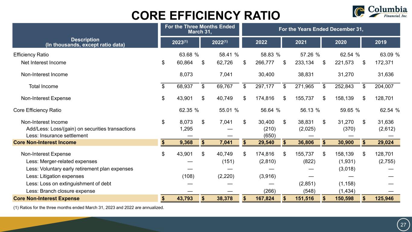 CORE EFFICIENCY RATIO For the Three Months Ended March 31, For the Years Ended December 31, Description (In thousands, except ratio data) 2023(1) 2022(1) 2022 2021 2020 2019 Efficiency Ratio 63.68 % 58.41 % 58.83 % 57.26 % 62.54 % 63.09 % Net Interest Income $ 60,864 $ 62,726 $ 266,777 $ 233,134 $ 221,573 $ 172,371 Non-Interest Income 8,073 7,041 30,400 38,831 31,270 31,636 Total Income $ 68,937 $ 69,767 $ 297,177 $ 271,965 $ 252,843 $ 204,007 Non-Interest Expense $ 43,901 $ 40,749 $ 174,816 $ 155,737 $ 158,139 $ 128,701 Core Efficiency Ratio 62.35 % 55.01 % 56.64 % 56.13 % 59.65 % 62.54 % Non-Interest Income $ 8,073 $ 7,041 $ 30,400 $ 38,831 $ 31,270 $ 31,636 Add/Less: Loss/(gain) on securities transactions 1,295 — (210) (2,025) (370) (2,612) Less: Insurance settlement — — (650) — — — Core Non-Interest Income $ 9,368 $ 7,041 $ 29,540 $ 36,806 $ 30,900 $ 29,024 Non-Interest Expense $ 43,901 $ 40,749 $ 174,816 $ 155,737 $ 158,139 $ 128,701 Less: Merger-related expenses — (151) (2,810) (822) (1,931) (2,755) Less: Voluntary early retirement plan expenses — — — — (3,018) — Less: Litigation expenses (108) (2,220) (3,916) — — — Less: Loss on extinguishment of debt — — — (2,851) (1,158) — Less: Branch closure expense — — (266) (548) (1,434) — Core Non-Interest Expense $ 43,793 $ 38,378 $ 167,824 $ 151,516 $ 150,598 $ 125,946 (1) Ratios for the three months ended March 31, 2023 and 2022 are annualized. 27
