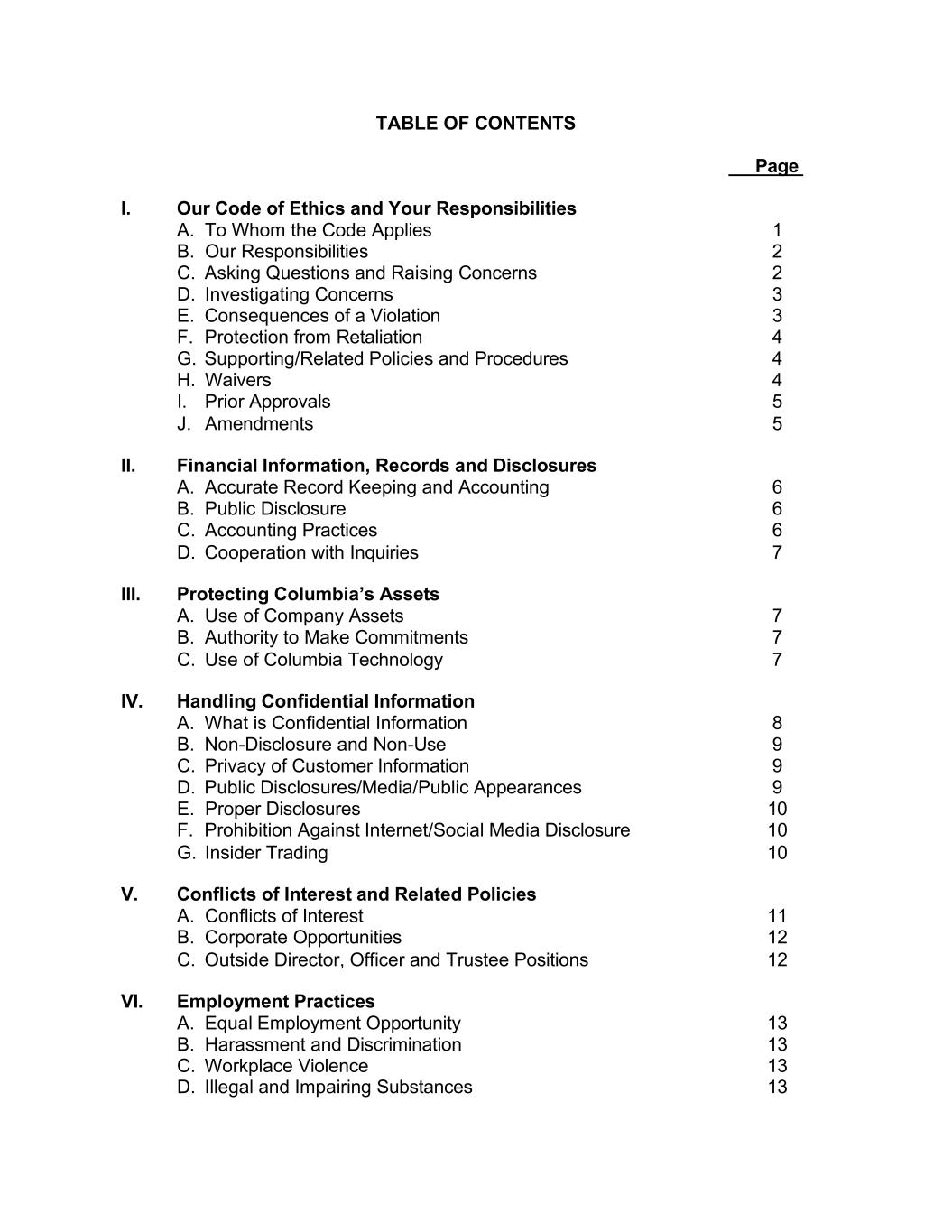 TABLE OF CONTENTS Page I. Our Code of Ethics and Your Responsibilities A. To Whom the Code Applies 1 B. Our Responsibilities 2 C. Asking Questions and Raising Concerns 2 D. Investigating Concerns 3 E. Consequences of a Violation 3 F. Protection from Retaliation 4 G. Supporting/Related Policies and Procedures 4 H. Waivers 4 I. Prior Approvals 5 J. Amendments 5 II. Financial Information, Records and Disclosures A. Accurate Record Keeping and Accounting 6 B. Public Disclosure 6 C. Accounting Practices 6 D. Cooperation with Inquiries 7 III. Protecting Columbia’s Assets A. Use of Company Assets 7 B. Authority to Make Commitments 7 C. Use of Columbia Technology 7 IV. Handling Confidential Information A. What is Confidential Information 8 B. Non-Disclosure and Non-Use 9 C. Privacy of Customer Information 9 D. Public Disclosures/Media/Public Appearances 9 E. Proper Disclosures 10 F. Prohibition Against Internet/Social Media Disclosure 10 G. Insider Trading 10 V. Conflicts of Interest and Related Policies A. Conflicts of Interest 11 B. Corporate Opportunities 12 C. Outside Director, Officer and Trustee Positions 12 VI. Employment Practices A. Equal Employment Opportunity 13 B. Harassment and Discrimination 13 C. Workplace Violence 13 D. Illegal and Impairing Substances 13
