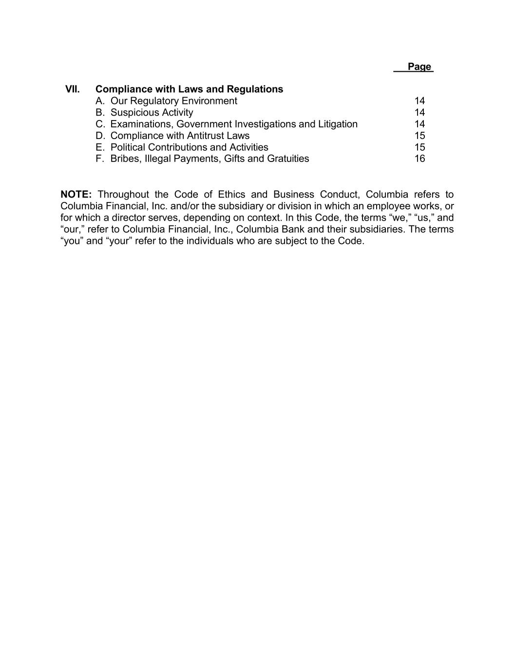 Page VII. Compliance with Laws and Regulations A. Our Regulatory Environment 14 B. Suspicious Activity 14 C. Examinations, Government Investigations and Litigation 14 D. Compliance with Antitrust Laws 15 E. Political Contributions and Activities 15 F. Bribes, Illegal Payments, Gifts and Gratuities 16 NOTE: Throughout the Code of Ethics and Business Conduct, Columbia refers to Columbia Financial, Inc. and/or the subsidiary or division in which an employee works, or for which a director serves, depending on context. In this Code, the terms “we,” “us,” and “our,” refer to Columbia Financial, Inc., Columbia Bank and their subsidiaries. The terms “you” and “your” refer to the individuals who are subject to the Code.