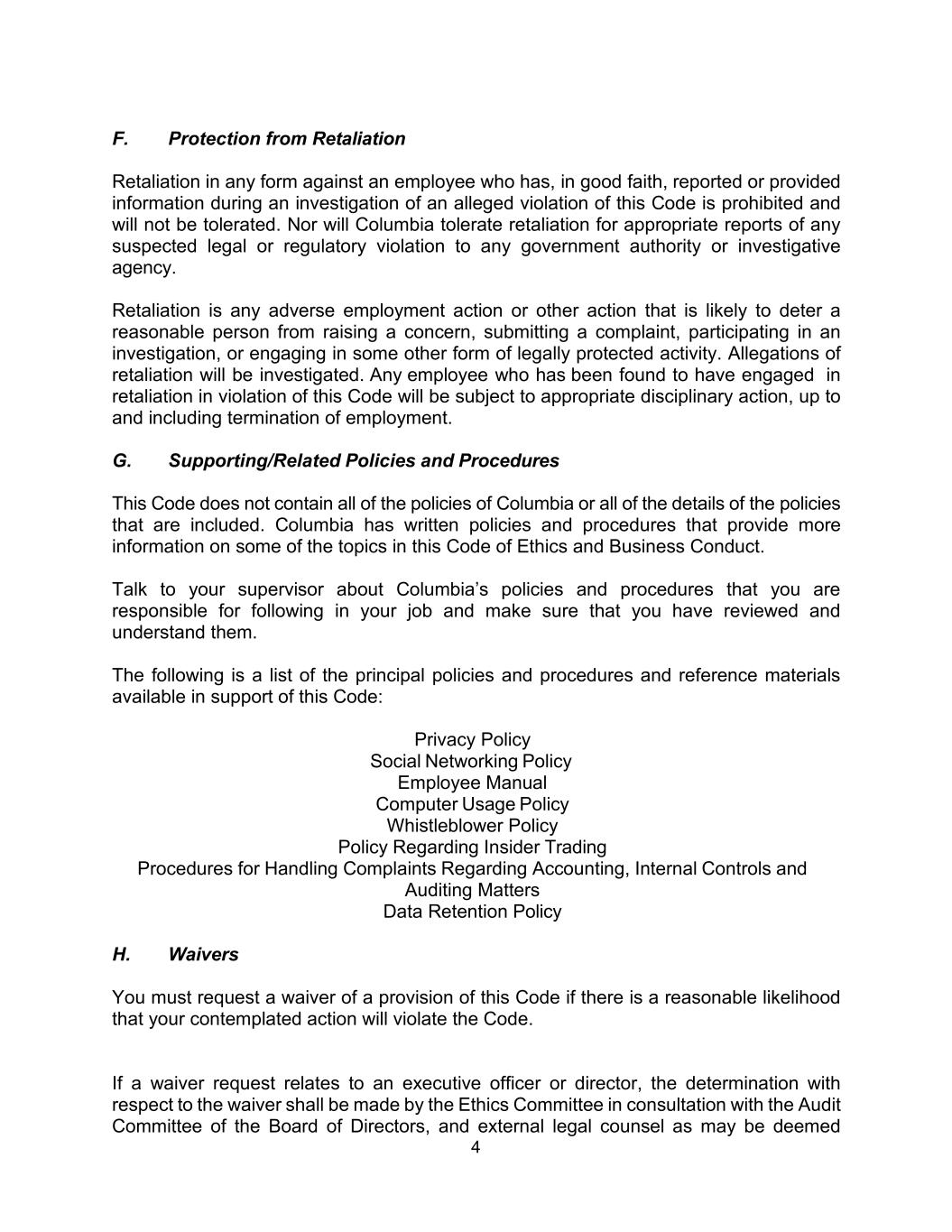4 F. Protection from Retaliation Retaliation in any form against an employee who has, in good faith, reported or provided information during an investigation of an alleged violation of this Code is prohibited and will not be tolerated. Nor will Columbia tolerate retaliation for appropriate reports of any suspected legal or regulatory violation to any government authority or investigative agency. Retaliation is any adverse employment action or other action that is likely to deter a reasonable person from raising a concern, submitting a complaint, participating in an investigation, or engaging in some other form of legally protected activity. Allegations of retaliation will be investigated. Any employee who has been found to have engaged in retaliation in violation of this Code will be subject to appropriate disciplinary action, up to and including termination of employment. G. Supporting/Related Policies and Procedures This Code does not contain all of the policies of Columbia or all of the details of the policies that are included. Columbia has written policies and procedures that provide more information on some of the topics in this Code of Ethics and Business Conduct. Talk to your supervisor about Columbia’s policies and procedures that you are responsible for following in your job and make sure that you have reviewed and understand them. The following is a list of the principal policies and procedures and reference materials available in support of this Code: Privacy Policy Social Networking Policy Employee Manual Computer Usage Policy Whistleblower Policy Policy Regarding Insider Trading Procedures for Handling Complaints Regarding Accounting, Internal Controls and Auditing Matters Data Retention Policy H. Waivers You must request a waiver of a provision of this Code if there is a reasonable likelihood that your contemplated action will violate the Code. If a waiver request relates to an executive officer or director, the determination with respect to the waiver shall be made by the Ethics Committee in consultation with the Audit Committee of the Board of Directors, and external legal counsel as may be deemed
