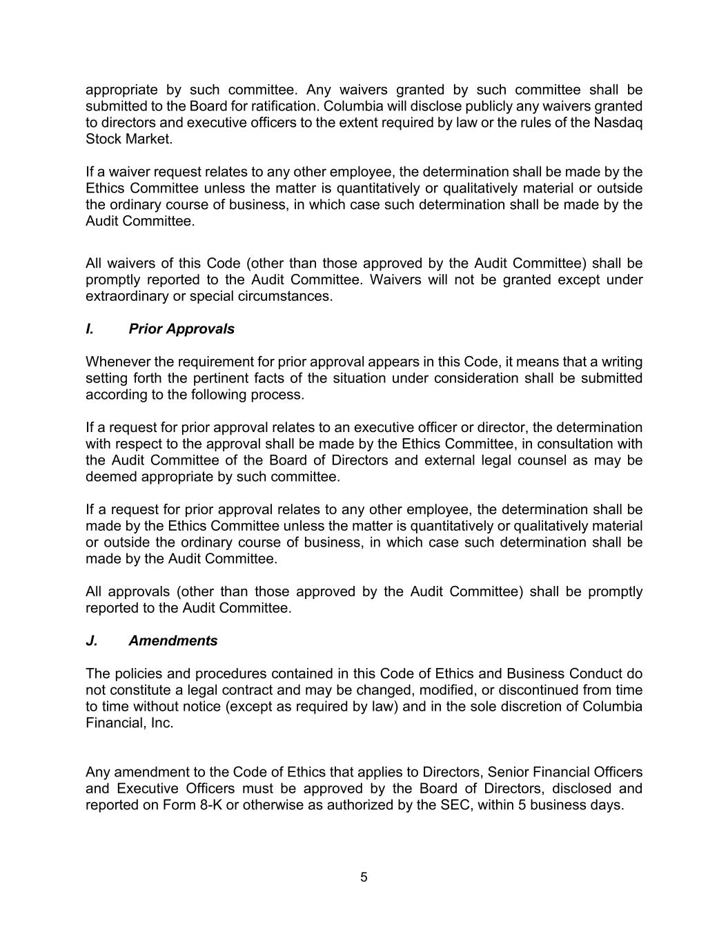 5 appropriate by such committee. Any waivers granted by such committee shall be submitted to the Board for ratification. Columbia will disclose publicly any waivers granted to directors and executive officers to the extent required by law or the rules of the Nasdaq Stock Market. If a waiver request relates to any other employee, the determination shall be made by the Ethics Committee unless the matter is quantitatively or qualitatively material or outside the ordinary course of business, in which case such determination shall be made by the Audit Committee. All waivers of this Code (other than those approved by the Audit Committee) shall be promptly reported to the Audit Committee. Waivers will not be granted except under extraordinary or special circumstances. I. Prior Approvals Whenever the requirement for prior approval appears in this Code, it means that a writing setting forth the pertinent facts of the situation under consideration shall be submitted according to the following process. If a request for prior approval relates to an executive officer or director, the determination with respect to the approval shall be made by the Ethics Committee, in consultation with the Audit Committee of the Board of Directors and external legal counsel as may be deemed appropriate by such committee. If a request for prior approval relates to any other employee, the determination shall be made by the Ethics Committee unless the matter is quantitatively or qualitatively material or outside the ordinary course of business, in which case such determination shall be made by the Audit Committee. All approvals (other than those approved by the Audit Committee) shall be promptly reported to the Audit Committee. J. Amendments The policies and procedures contained in this Code of Ethics and Business Conduct do not constitute a legal contract and may be changed, modified, or discontinued from time to time without notice (except as required by law) and in the sole discretion of Columbia Financial, Inc. Any amendment to the Code of Ethics that applies to Directors, Senior Financial Officers and Executive Officers must be approved by the Board of Directors, disclosed and reported on Form 8-K or otherwise as authorized by the SEC, within 5 business days.