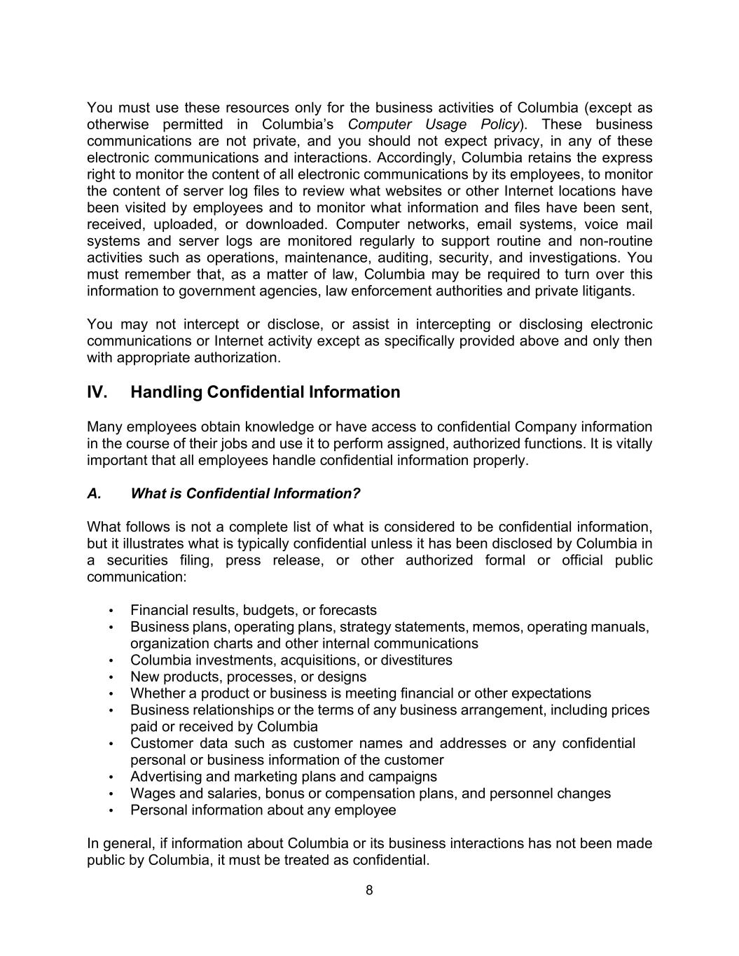8 You must use these resources only for the business activities of Columbia (except as otherwise permitted in Columbia’s Computer Usage Policy). These business communications are not private, and you should not expect privacy, in any of these electronic communications and interactions. Accordingly, Columbia retains the express right to monitor the content of all electronic communications by its employees, to monitor the content of server log files to review what websites or other Internet locations have been visited by employees and to monitor what information and files have been sent, received, uploaded, or downloaded. Computer networks, email systems, voice mail systems and server logs are monitored regularly to support routine and non-routine activities such as operations, maintenance, auditing, security, and investigations. You must remember that, as a matter of law, Columbia may be required to turn over this information to government agencies, law enforcement authorities and private litigants. You may not intercept or disclose, or assist in intercepting or disclosing electronic communications or Internet activity except as specifically provided above and only then with appropriate authorization. IV. Handling Confidential Information Many employees obtain knowledge or have access to confidential Company information in the course of their jobs and use it to perform assigned, authorized functions. It is vitally important that all employees handle confidential information properly. A. What is Confidential Information? What follows is not a complete list of what is considered to be confidential information, but it illustrates what is typically confidential unless it has been disclosed by Columbia in a securities filing, press release, or other authorized formal or official public communication: • Financial results, budgets, or forecasts • Business plans, operating plans, strategy statements, memos, operating manuals, organization charts and other internal communications • Columbia investments, acquisitions, or divestitures • New products, processes, or designs • Whether a product or business is meeting financial or other expectations • Business relationships or the terms of any business arrangement, including prices paid or received by Columbia • Customer data such as customer names and addresses or any confidential personal or business information of the customer • Advertising and marketing plans and campaigns • Wages and salaries, bonus or compensation plans, and personnel changes • Personal information about any employee In general, if information about Columbia or its business interactions has not been made public by Columbia, it must be treated as confidential.
