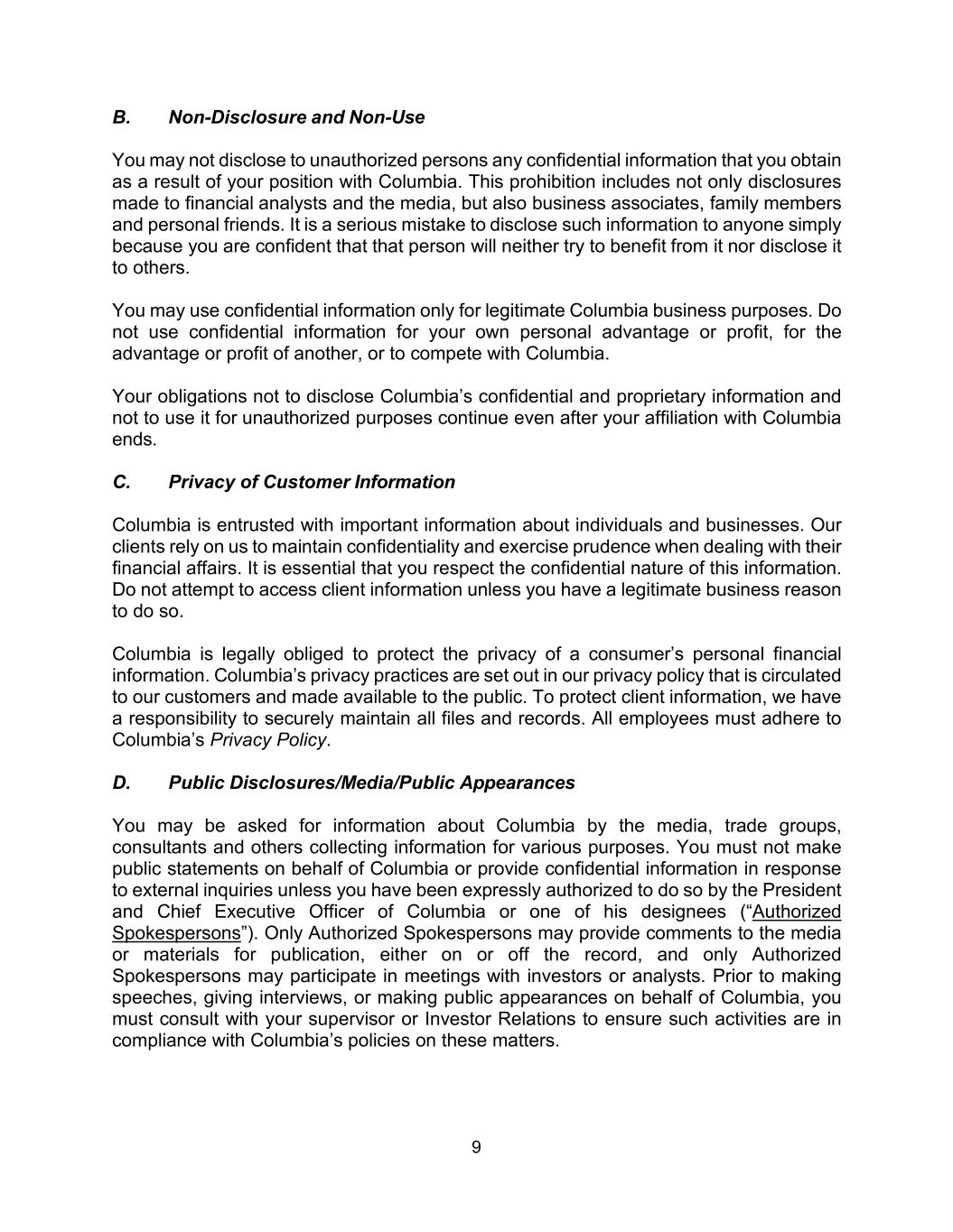 9 B. Non-Disclosure and Non-Use You may not disclose to unauthorized persons any confidential information that you obtain as a result of your position with Columbia. This prohibition includes not only disclosures made to financial analysts and the media, but also business associates, family members and personal friends. It is a serious mistake to disclose such information to anyone simply because you are confident that that person will neither try to benefit from it nor disclose it to others. You may use confidential information only for legitimate Columbia business purposes. Do not use confidential information for your own personal advantage or profit, for the advantage or profit of another, or to compete with Columbia. Your obligations not to disclose Columbia’s confidential and proprietary information and not to use it for unauthorized purposes continue even after your affiliation with Columbia ends. C. Privacy of Customer Information Columbia is entrusted with important information about individuals and businesses. Our clients rely on us to maintain confidentiality and exercise prudence when dealing with their financial affairs. It is essential that you respect the confidential nature of this information. Do not attempt to access client information unless you have a legitimate business reason to do so. Columbia is legally obliged to protect the privacy of a consumer’s personal financial information. Columbia’s privacy practices are set out in our privacy policy that is circulated to our customers and made available to the public. To protect client information, we have a responsibility to securely maintain all files and records. All employees must adhere to Columbia’s Privacy Policy. D. Public Disclosures/Media/Public Appearances You may be asked for information about Columbia by the media, trade groups, consultants and others collecting information for various purposes. You must not make public statements on behalf of Columbia or provide confidential information in response to external inquiries unless you have been expressly authorized to do so by the President and Chief Executive Officer of Columbia or one of his designees (“Authorized Spokespersons”). Only Authorized Spokespersons may provide comments to the media or materials for publication, either on or off the record, and only Authorized Spokespersons may participate in meetings with investors or analysts. Prior to making speeches, giving interviews, or making public appearances on behalf of Columbia, you must consult with your supervisor or Investor Relations to ensure such activities are in compliance with Columbia’s policies on these matters.