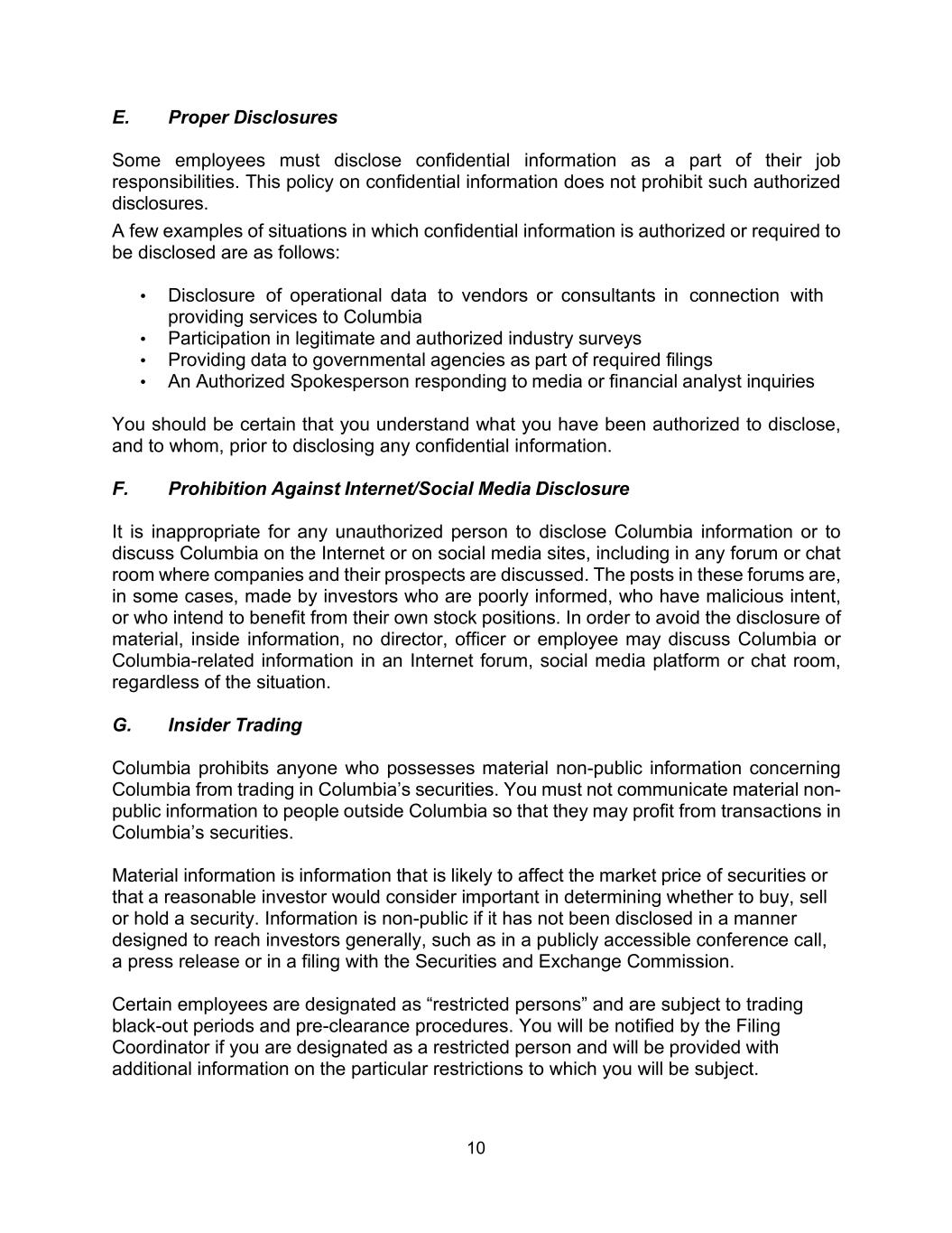 10 E. Proper Disclosures Some employees must disclose confidential information as a part of their job responsibilities. This policy on confidential information does not prohibit such authorized disclosures. A few examples of situations in which confidential information is authorized or required to be disclosed are as follows: • Disclosure of operational data to vendors or consultants in connection with providing services to Columbia • Participation in legitimate and authorized industry surveys • Providing data to governmental agencies as part of required filings • An Authorized Spokesperson responding to media or financial analyst inquiries You should be certain that you understand what you have been authorized to disclose, and to whom, prior to disclosing any confidential information. F. Prohibition Against Internet/Social Media Disclosure It is inappropriate for any unauthorized person to disclose Columbia information or to discuss Columbia on the Internet or on social media sites, including in any forum or chat room where companies and their prospects are discussed. The posts in these forums are, in some cases, made by investors who are poorly informed, who have malicious intent, or who intend to benefit from their own stock positions. In order to avoid the disclosure of material, inside information, no director, officer or employee may discuss Columbia or Columbia-related information in an Internet forum, social media platform or chat room, regardless of the situation. G. Insider Trading Columbia prohibits anyone who possesses material non-public information concerning Columbia from trading in Columbia’s securities. You must not communicate material non- public information to people outside Columbia so that they may profit from transactions in Columbia’s securities. Material information is information that is likely to affect the market price of securities or that a reasonable investor would consider important in determining whether to buy, sell or hold a security. Information is non-public if it has not been disclosed in a manner designed to reach investors generally, such as in a publicly accessible conference call, a press release or in a filing with the Securities and Exchange Commission. Certain employees are designated as “restricted persons” and are subject to trading black-out periods and pre-clearance procedures. You will be notified by the Filing Coordinator if you are designated as a restricted person and will be provided with additional information on the particular restrictions to which you will be subject.