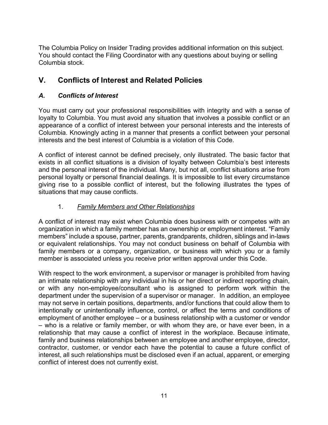11 The Columbia Policy on Insider Trading provides additional information on this subject. You should contact the Filing Coordinator with any questions about buying or selling Columbia stock. V. Conflicts of Interest and Related Policies A. Conflicts of Interest You must carry out your professional responsibilities with integrity and with a sense of loyalty to Columbia. You must avoid any situation that involves a possible conflict or an appearance of a conflict of interest between your personal interests and the interests of Columbia. Knowingly acting in a manner that presents a conflict between your personal interests and the best interest of Columbia is a violation of this Code. A conflict of interest cannot be defined precisely, only illustrated. The basic factor that exists in all conflict situations is a division of loyalty between Columbia’s best interests and the personal interest of the individual. Many, but not all, conflict situations arise from personal loyalty or personal financial dealings. It is impossible to list every circumstance giving rise to a possible conflict of interest, but the following illustrates the types of situations that may cause conflicts. 1. Family Members and Other Relationships A conflict of interest may exist when Columbia does business with or competes with an organization in which a family member has an ownership or employment interest. “Family members” include a spouse, partner, parents, grandparents, children, siblings and in-laws or equivalent relationships. You may not conduct business on behalf of Columbia with family members or a company, organization, or business with which you or a family member is associated unless you receive prior written approval under this Code. With respect to the work environment, a supervisor or manager is prohibited from having an intimate relationship with any individual in his or her direct or indirect reporting chain, or with any non-employee/consultant who is assigned to perform work within the department under the supervision of a supervisor or manager. In addition, an employee may not serve in certain positions, departments, and/or functions that could allow them to intentionally or unintentionally influence, control, or affect the terms and conditions of employment of another employee – or a business relationship with a customer or vendor – who is a relative or family member, or with whom they are, or have ever been, in a relationship that may cause a conflict of interest in the workplace. Because intimate, family and business relationships between an employee and another employee, director, contractor, customer, or vendor each have the potential to cause a future conflict of interest, all such relationships must be disclosed even if an actual, apparent, or emerging conflict of interest does not currently exist.
